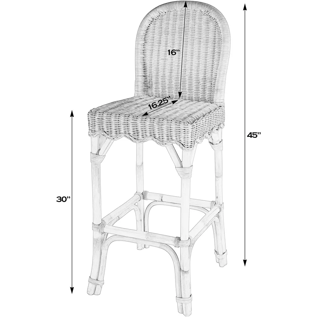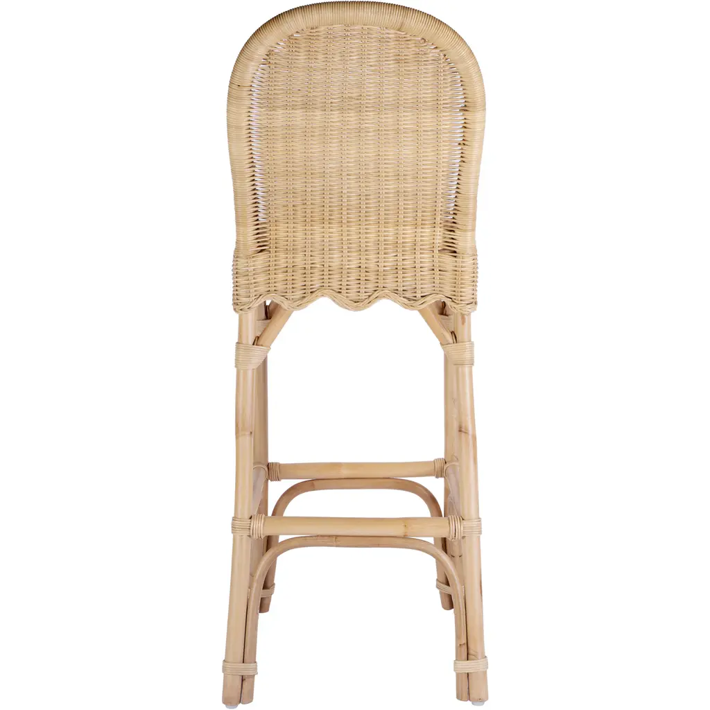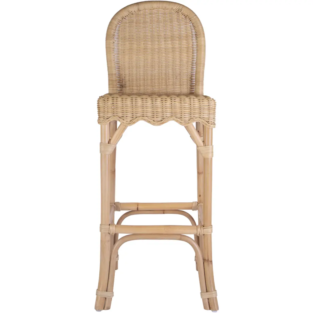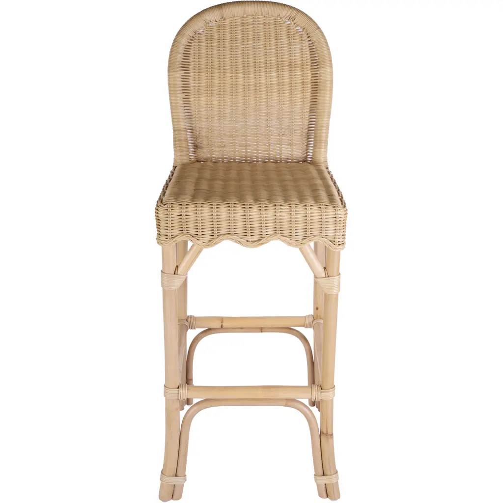 Elevate your space with our Butler Specialty Company Flora natural rattan bar stool. Crafted with love, its hand-woven rattan frame features a scalloped edge apron and curved seat back that embodies timeless romance bringing both warmth and coastal charm to your bar area.