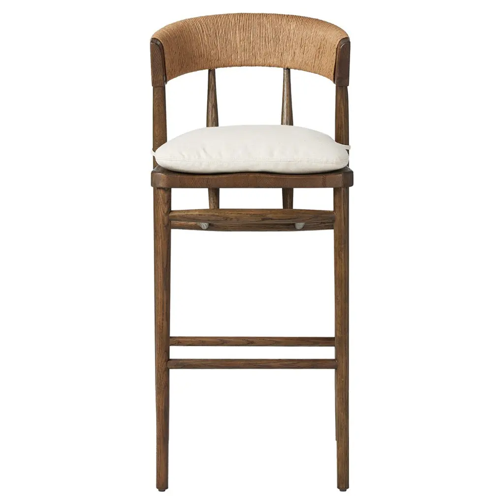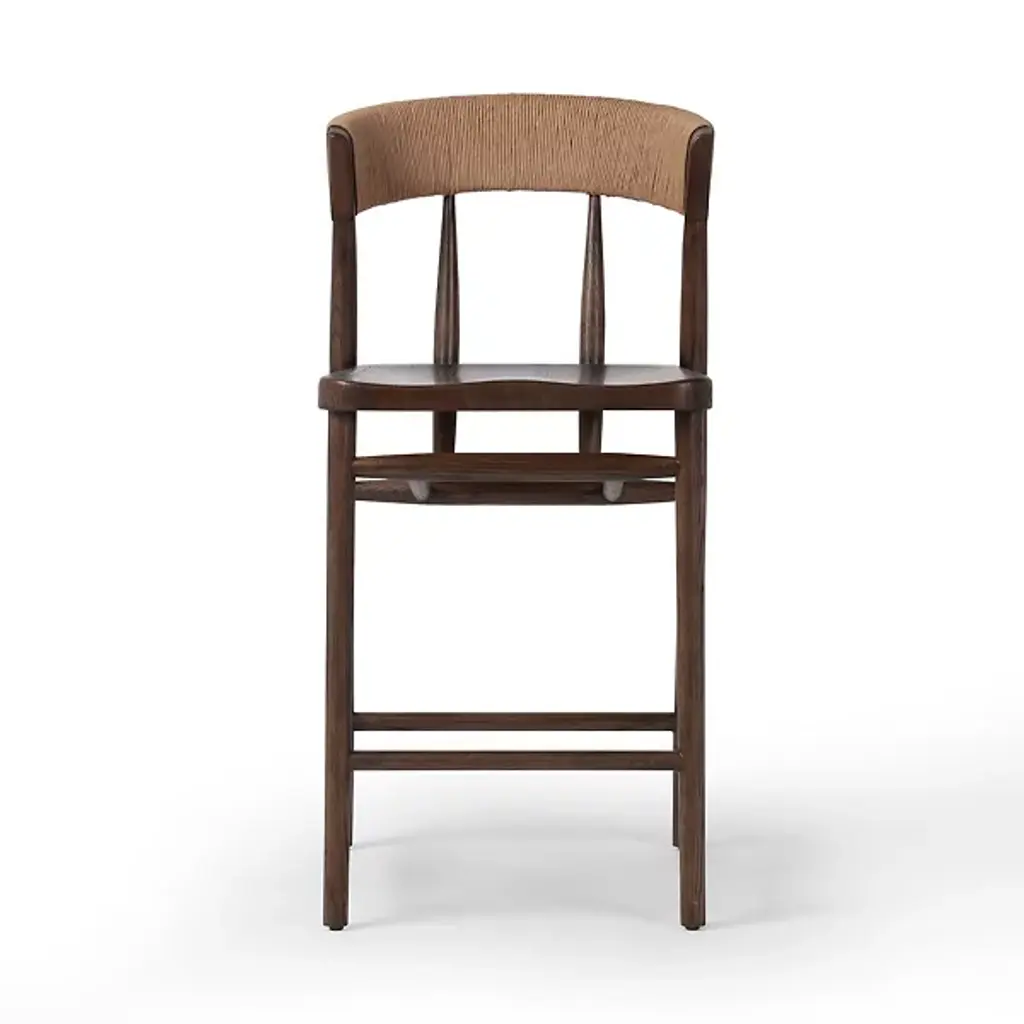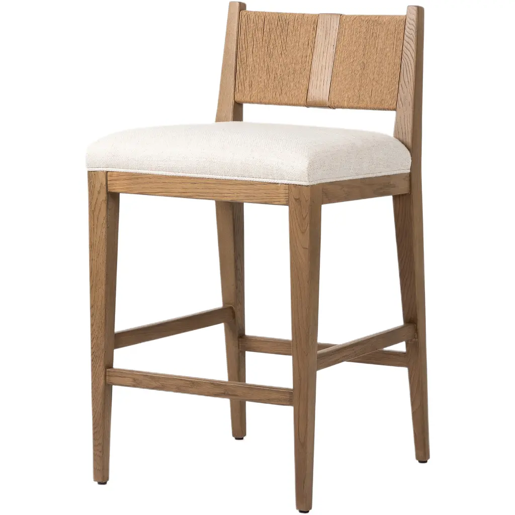 Enhance your dining ambiance with the Buxton Counter/Bar Stool from Four Hands, crafted with sturdy oak and tapered legs, a fresh spin on the traditional whistler chair design. Its meticulous finish includes a paper rush wrapped detail on the back, adding a bit of individuality and infusing rustic allure into its transitional style. It's fashioned using premium rush and solid oak, harmonizing modern refinement with rustic accents, ideal for counter seating or dining areas seeking a fusion of enduring charm and contemporary appeal.
