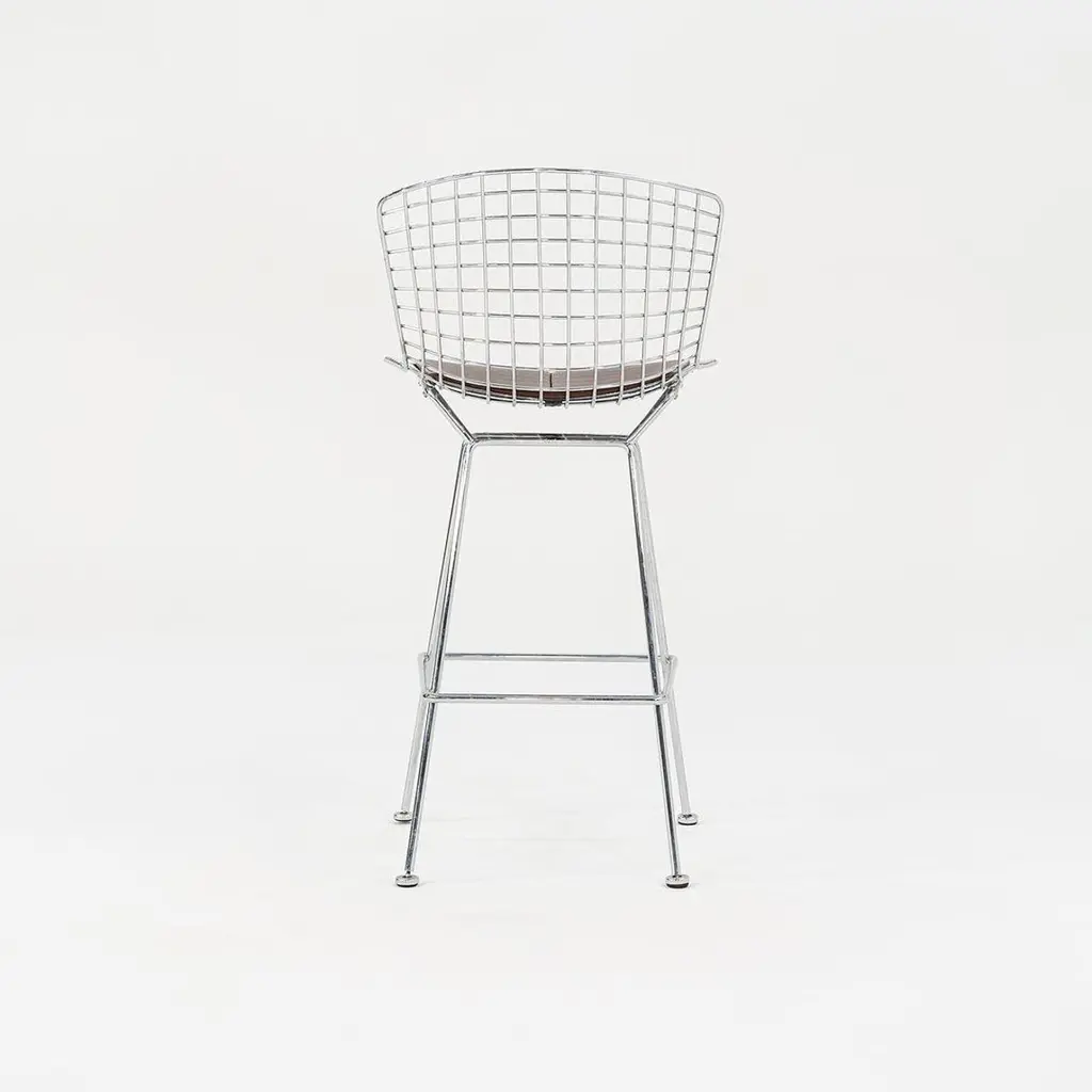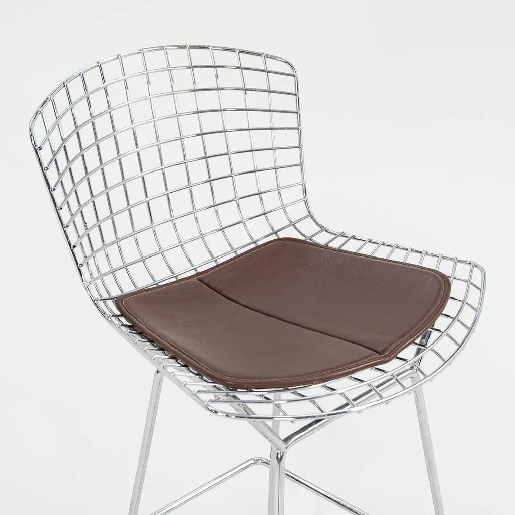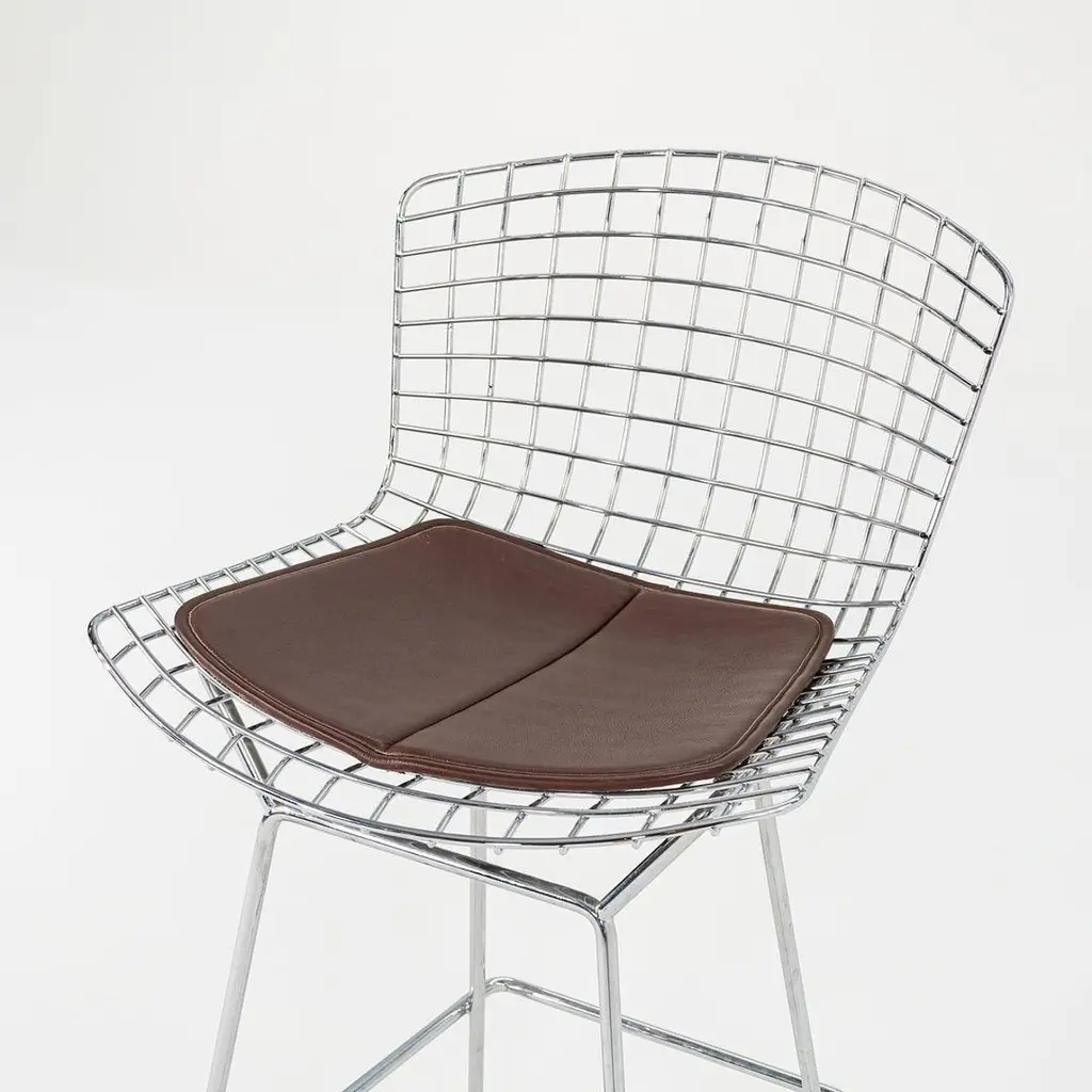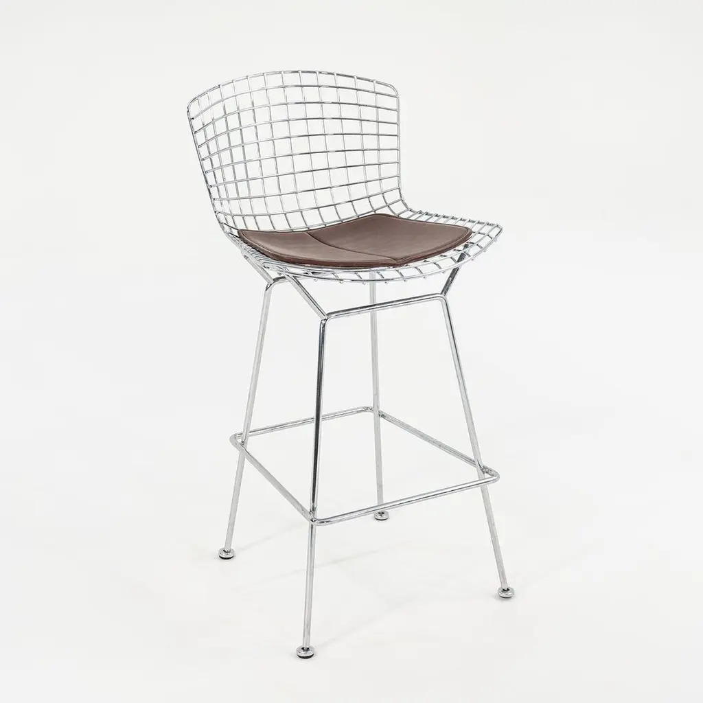 This is a classic Bertoia bar stool, model 428C, designed in 1952 by Harry Bertoia for Knoll International. These particular examples date to ca. 2009. The listed price includes one bar stool, and we have four stools available for individual purchase. Their design consists of a welded, chromed-steel wire seat & back, and each stool has an upholstered seat pad in brown leather. The pieces have the Knoll imprint on the back of the seat, a standard implemented by Knoll in 2004. Each stool measures 22 inches deep, 21.75 inches wide, and 43 inches high. The seat height is 29.25 inches. There may be some light wear on the bases. The upholstered leather seat pads may show some light wear. Overall, these stools are in very good condition. Please see photos. Genuinely faulty goods will be replaced or money refunded on a case by case basis, however we must be advised of any faulty goods upon receipt of the item. It is the customer's responsibility to pay for return shipping and ship the item back to us. If the item is found to be faulty, we will also refund the postage cost. If there is no damage to the item, but a return is approved, the buyer will be responsible for both the initial and return shipping cost. It is at our discretion to refuse the refund of undamaged goods. If an order is placed and you would like to cancel the order, please notify us immediately. Any refunds will be processed via the same means that payment was made.