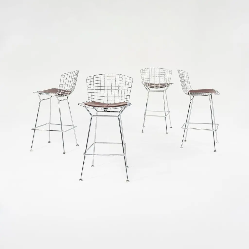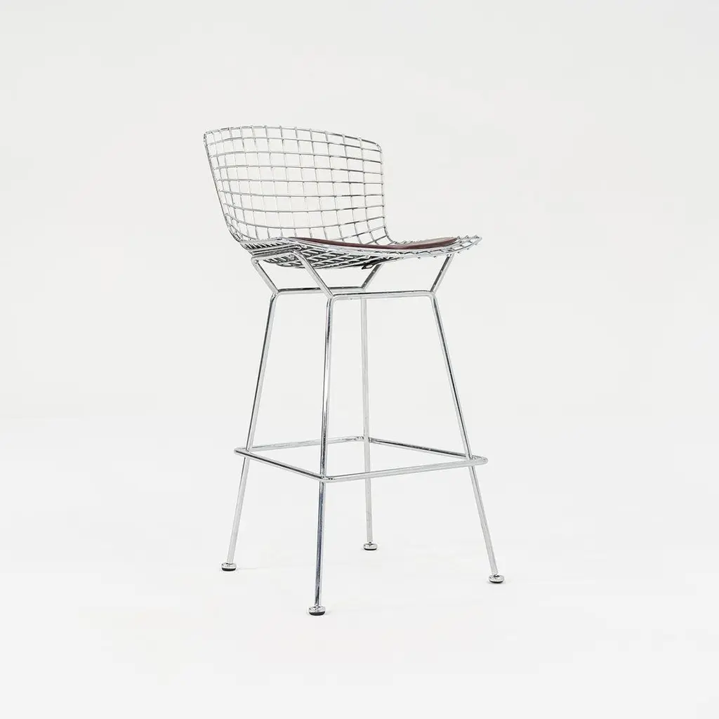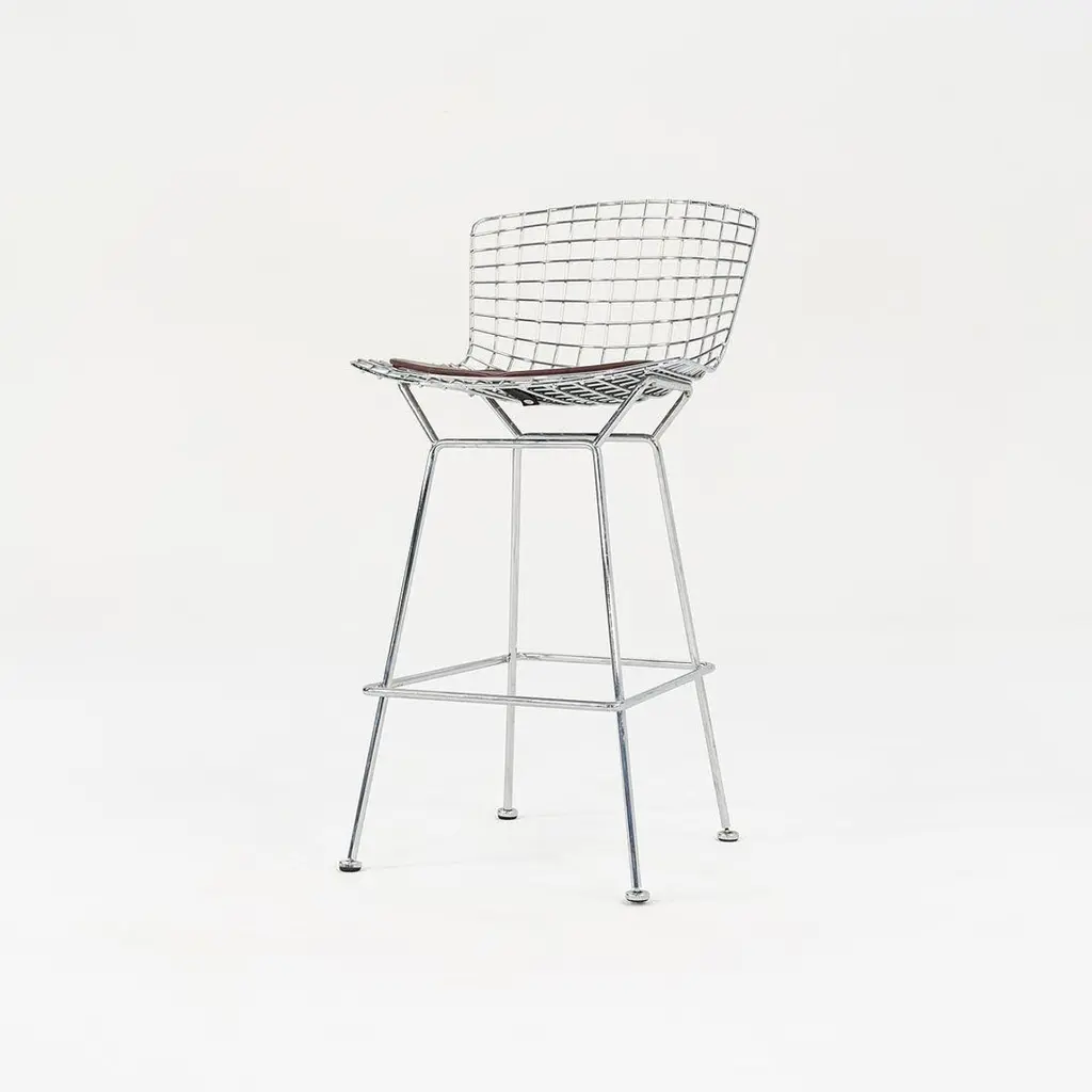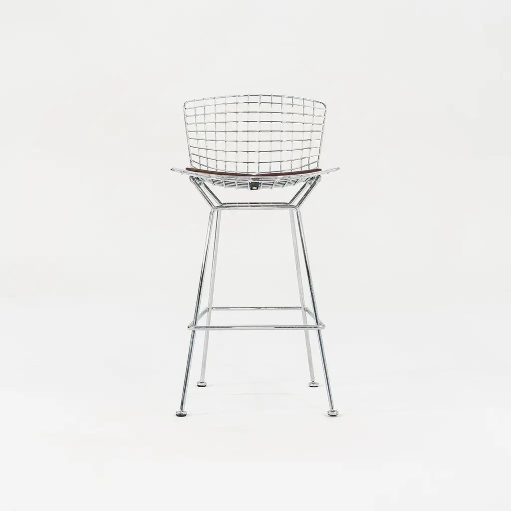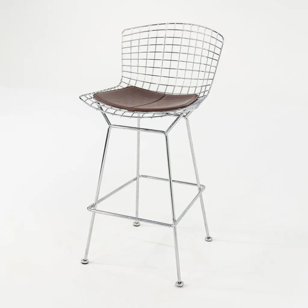 This is a classic Bertoia bar stool, model 428C, designed in 1952 by Harry Bertoia for Knoll International. These particular examples date to ca. 2009. The listed price includes one bar stool, and we have four stools available for individual purchase. Their design consists of a welded, chromed-steel wire seat & back, and each stool has an upholstered seat pad in brown leather. The pieces have the Knoll imprint on the back of the seat, a standard implemented by Knoll in 2004. Each stool measures 22 inches deep, 21.75 inches wide, and 43 inches high. The seat height is 29.25 inches. There may be some light wear on the bases. The upholstered leather seat pads may show some light wear. Overall, these stools are in very good condition. Please see photos. Genuinely faulty goods will be replaced or money refunded on a case by case basis, however we must be advised of any faulty goods upon receipt of the item. It is the customer's responsibility to pay for return shipping and ship the item back to us. If the item is found to be faulty, we will also refund the postage cost. If there is no damage to the item, but a return is approved, the buyer will be responsible for both the initial and return shipping cost. It is at our discretion to refuse the refund of undamaged goods. If an order is placed and you would like to cancel the order, please notify us immediately. Any refunds will be processed via the same means that payment was made.