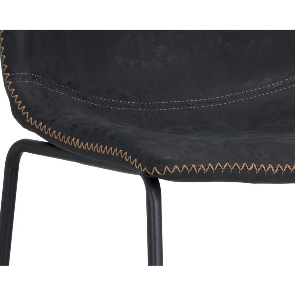 A comfortable and compact barstool. Features a simple, mid-century silhouette and finished with a brushed black steel frame. Stocked in antique black faux leather. Suitable for various dining, kitchen and bar spaces of all sizes. Handle With Care: This design has been crafted with faux leather. Faux leather is manufactured to reflect the natural characteristics of leather as such, colour variations, markings wrinkles, grooves, and light scratches are appreciated characteristics. No two pieces will be alike. Visit our Product Care page for more information on how to ensure the lasting beauty of this piece.