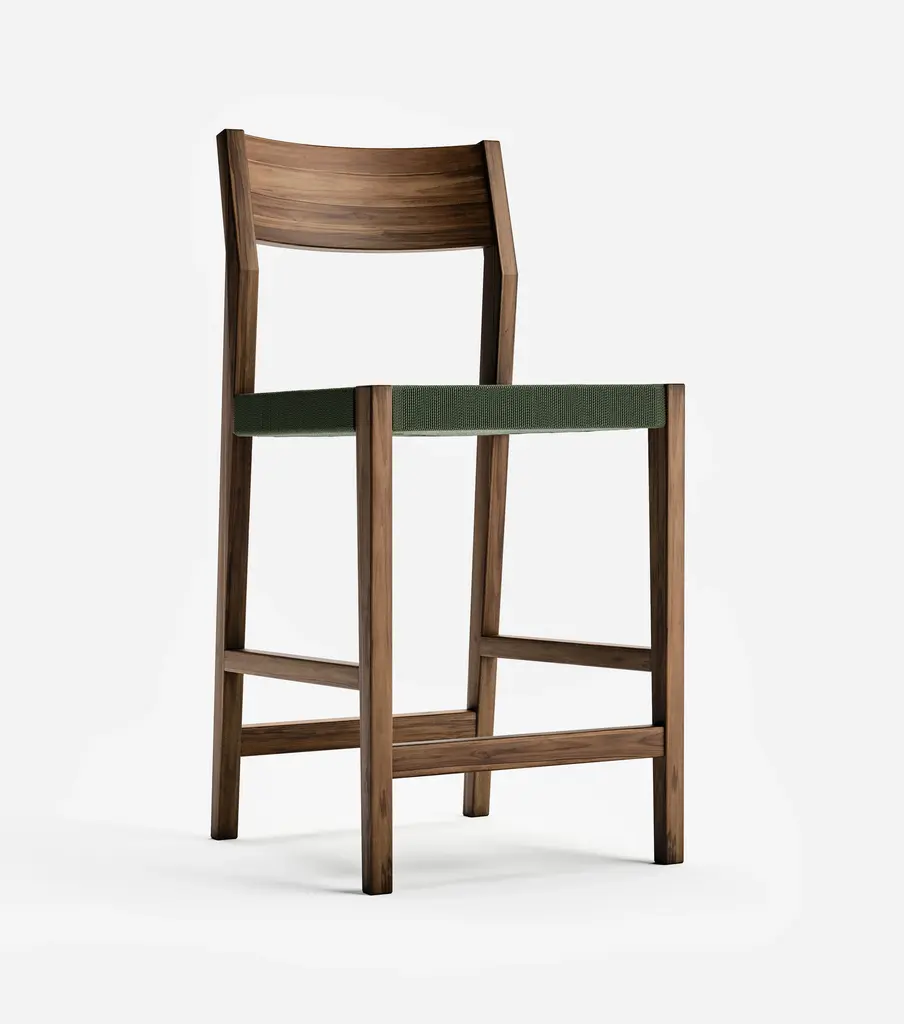 The Calvero Barstool, handcrafted from FSC® certified teak wood, features a unique handwoven design. This sustainable furniture piece offers elegance, durability, and eco-friendly charm for bar or counter seating.