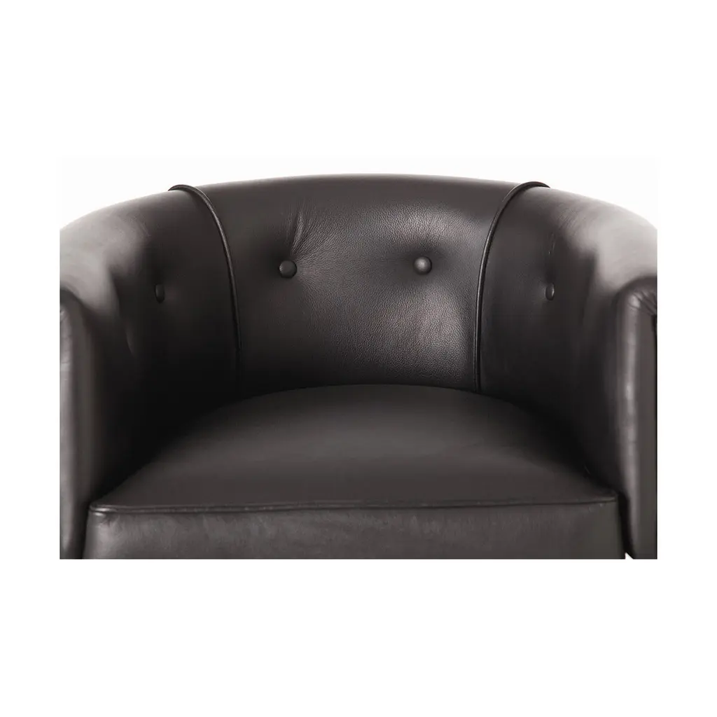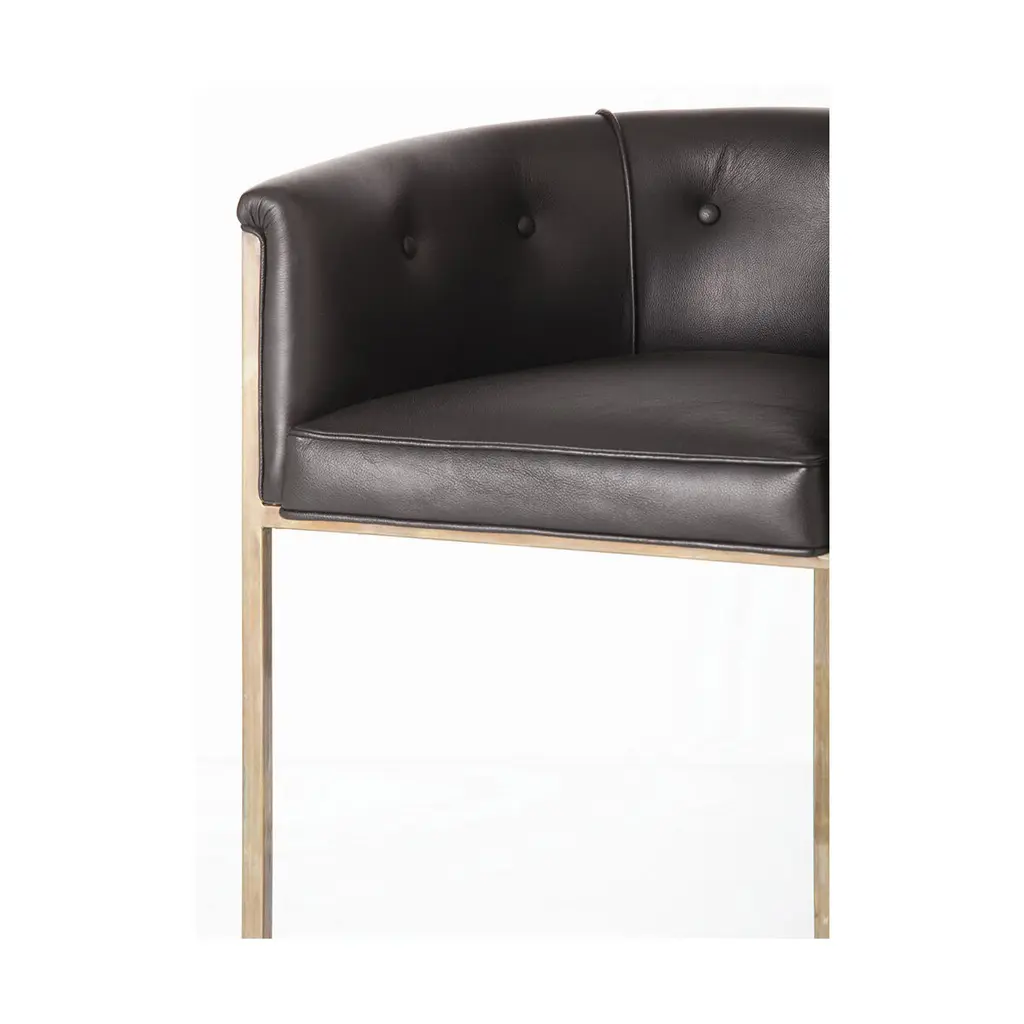 Transitional styled box style top grain leather seat with low curved back is supported by antique brass finish frame. For counters and bars.