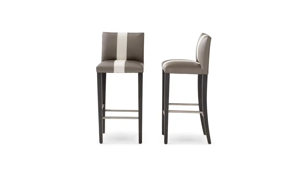 Bar stool in solid beech Seat height: 80 cm 4 footrest bars in stainless steel Foam filling on latex straps Fabric finishes available: - legs stained in grey and fabric SOLO in grey - legs stained in Brun and fabric SOLO in brown