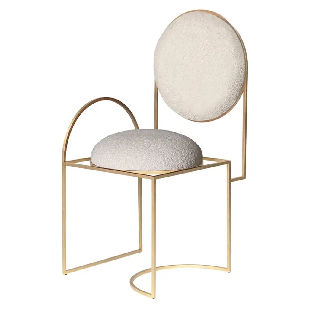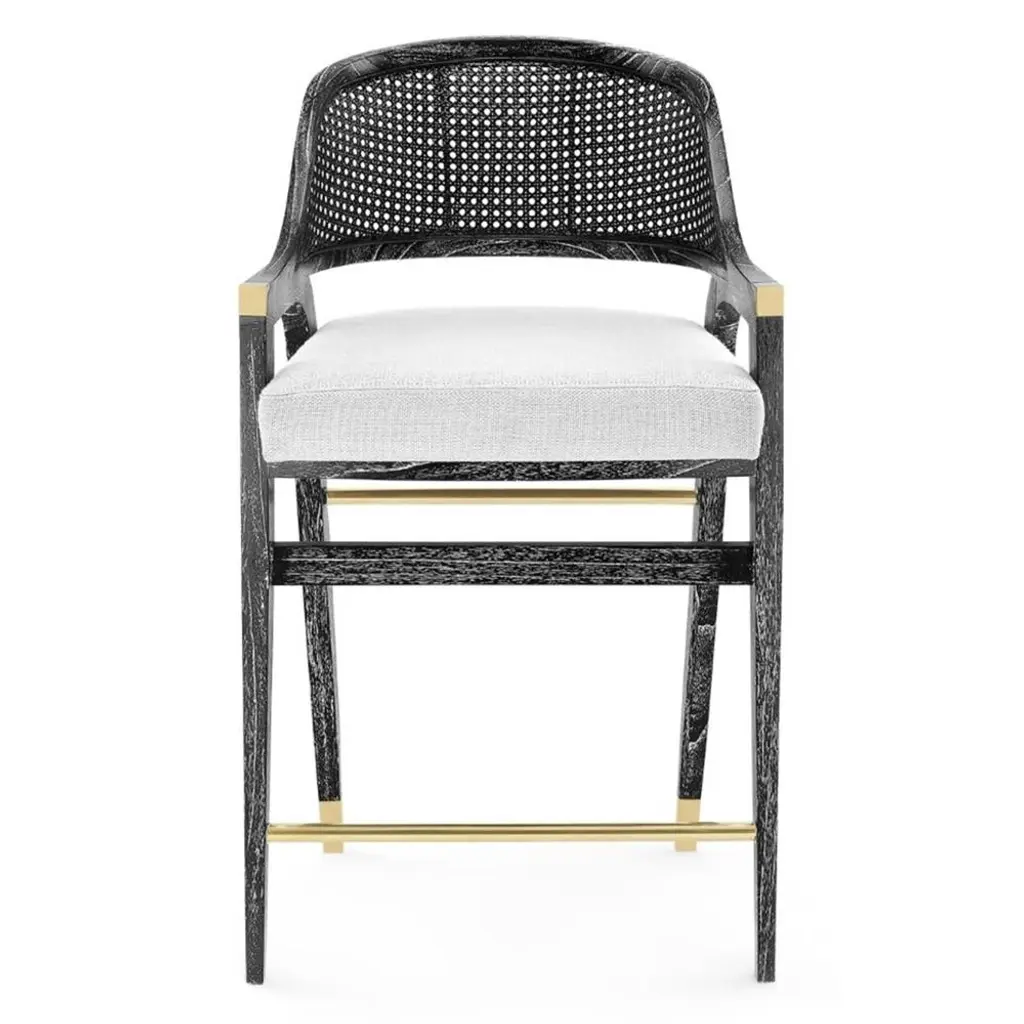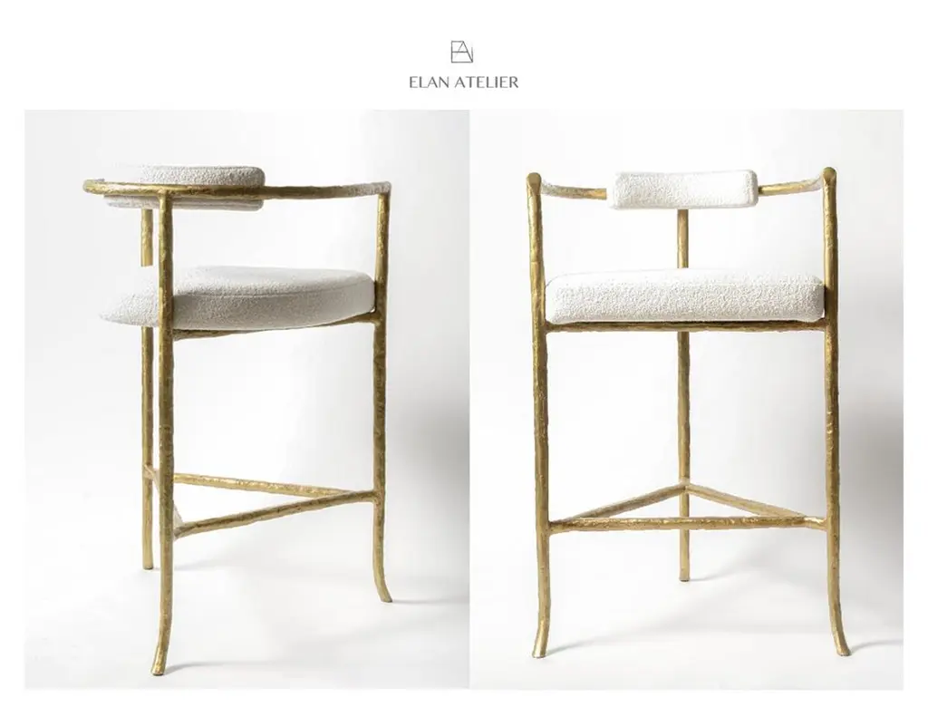 Bronze Twig Barstool with cast gold-bronze frame and ivory boucle upholstery by Elan AtelierInspired by the sculpture of Alberto Giacometti, the twig barstool is a sculptural form cast in solid bronze. Custom sizes, finishes, and various upholstery fabrics are available.COM/COL available Customization available. Dimensions/w 21 x d 21.8 x h 38 in Seat Height 30 in Stretcher Height 13 in From Floorw 53.3 x d 55.4 x h 96.5 cm Seat Height 76.2 cm Stretcher Height 33 cm From Floor