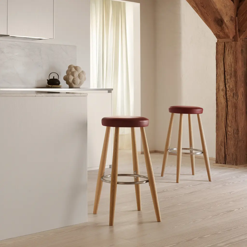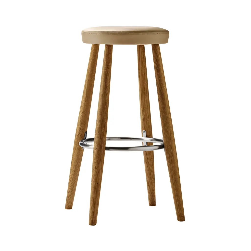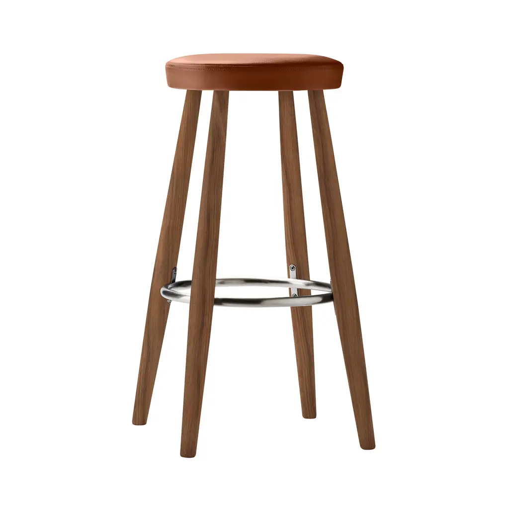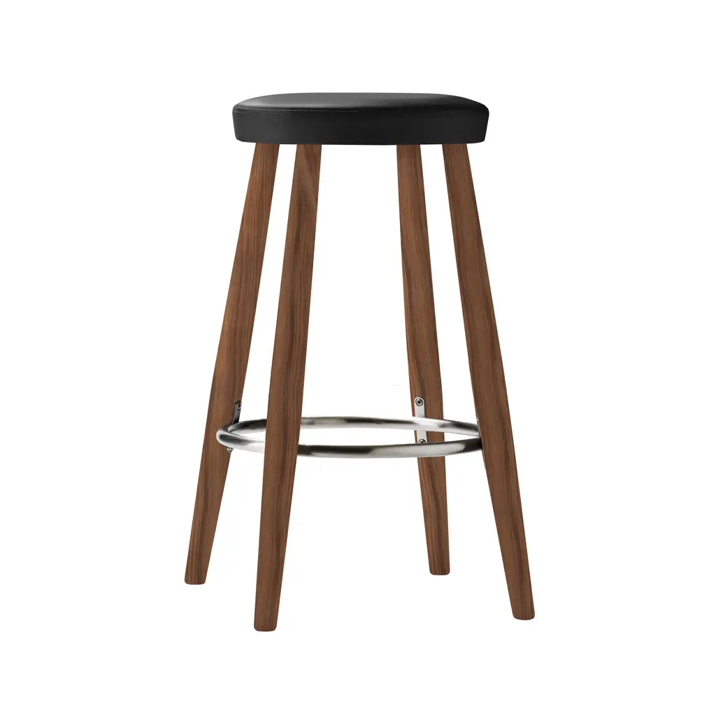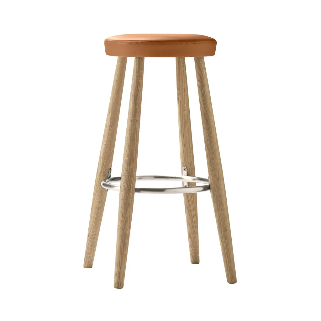 Echoing his breakthrough 1960s Danish modernism, Hans J. Wegner's CH56 and CH58 upholstered barstools combine essential functionality and a personalizing option with custom-upholstered seat cushions. Debuting in 1985, the sibling designs offer comfortable and practical seating in bar and counter heights. The styling speaks for itself, with the stools carefully crafted in solid oak or walnut with a range of select wood finishes and incorporating an integrated stainless steel footrest.