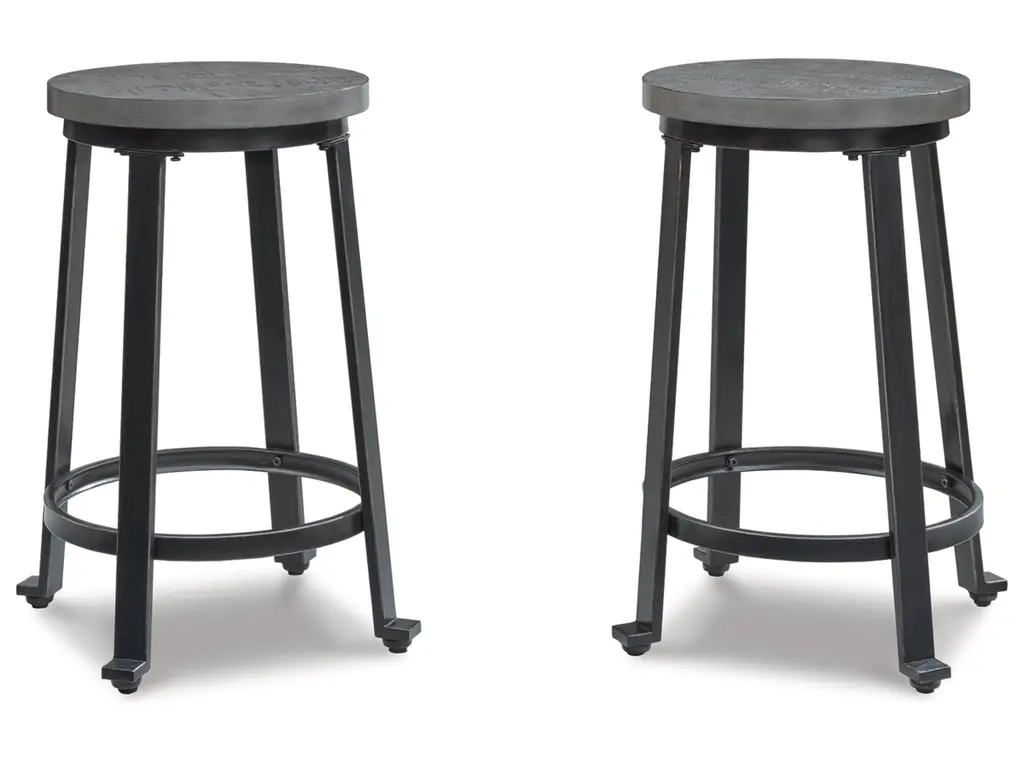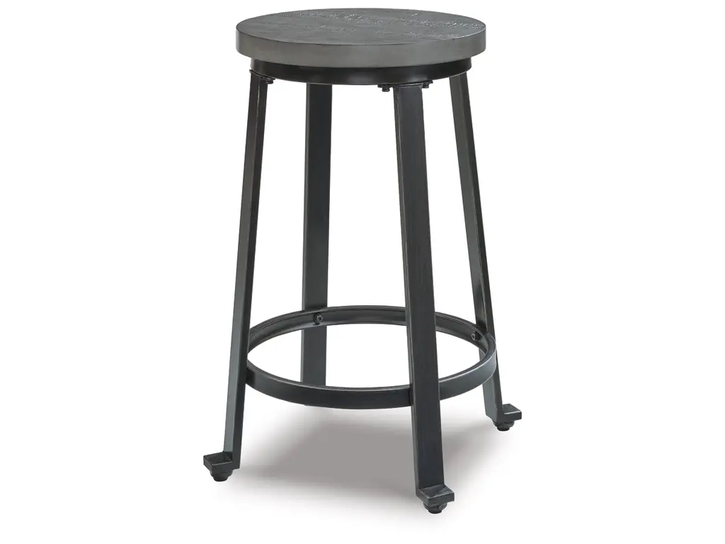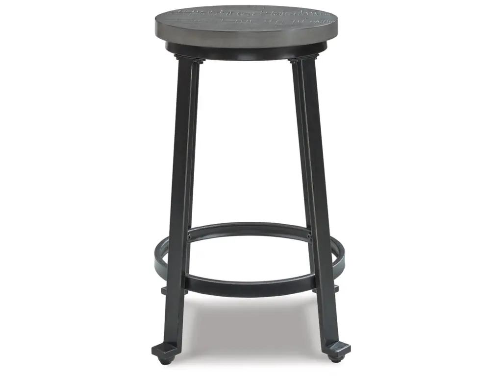 Talk about a cool counter stool. The Challiman stool's metal frame has a blackened pewter-tone finish and a distressed antique gray wash seat. The replicated plank design adds modern farmhouse feel that welcomes everyone home.