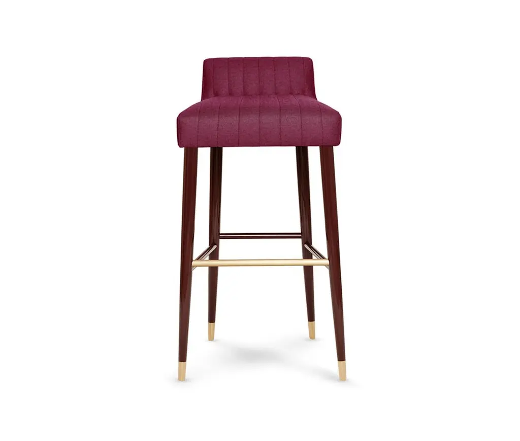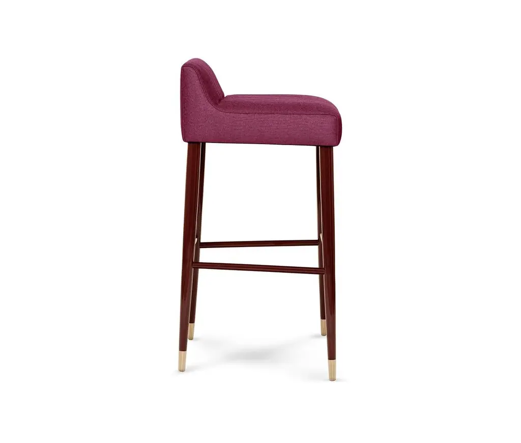 Charlotte Bar Stool by MunnaDimensions: D 47 x W 46 x H 92 cm. SH: 80 cm.Materials: Solid wood, foam, brass, and upholstery.Finish: Upholstery: Twill FR, ref. Raspberry, TFR11. Legs: Raspberry gloss lacquer. Metal detail: Brushed Brass. Feet Covers: Brushed BrassAvailable in all Munna fabrics except Wild Silk. Available in client’s ownmaterial. Available upholstered, Rosewood or Ebony veneer, solid Walnut, Wengé stain, or lacquer in all RAL colors, in matt or gloss. Fire retardant interlining is available on request. Handmade in Porto. Please contact us.Established in Porto in 2008, Munna is a furniture design brand renowned for creating handmade upholstery with unmatched craftsmanship, seamlessly blending noble materials and timeless design, for both commercial and residential projects.Made by hand in Porto, Munna’s pieces honor the profound heritage of craftsmanship, while drawing inspiration from history’s most influential artistic periods. Munna’s pieces are made of the finest fabrics such as cotton velvet, twill, leather, and silk; the finest wood veneers, such as ebony, walnut, and rosewood; sumptuous gold, silver, and copper leaves, metal details in brass, nickel, and copper, and superior lacquers.