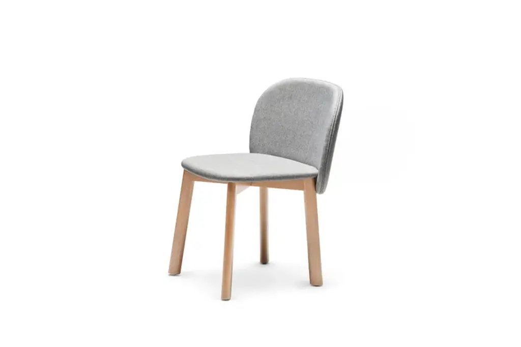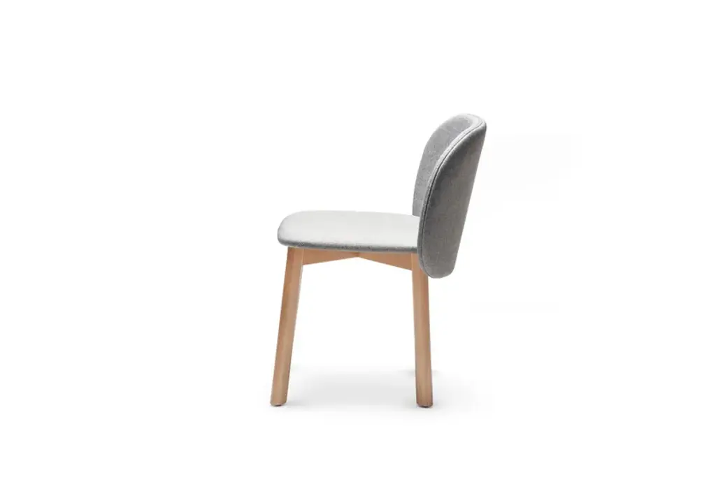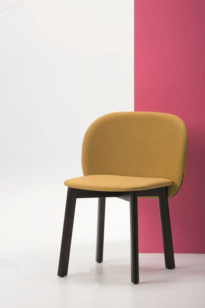 Seat with upholstered ply wood shell and polished or matt lacquered beech wood base.The new Chips collection created by Studio Pastina is a ironic line of chairs and barstools characterised by their sail-shaped back and innovative use of bright, vividly colored technical fabric and velvet.Upholstered plywood shell and painted metal frame.