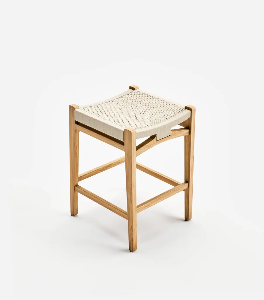 Inspired by Danish Cord Mid-Century designs and traditional Japanese woodworking the solid teak Chontales barstools brings warm textures and woven rope details to the dining area.