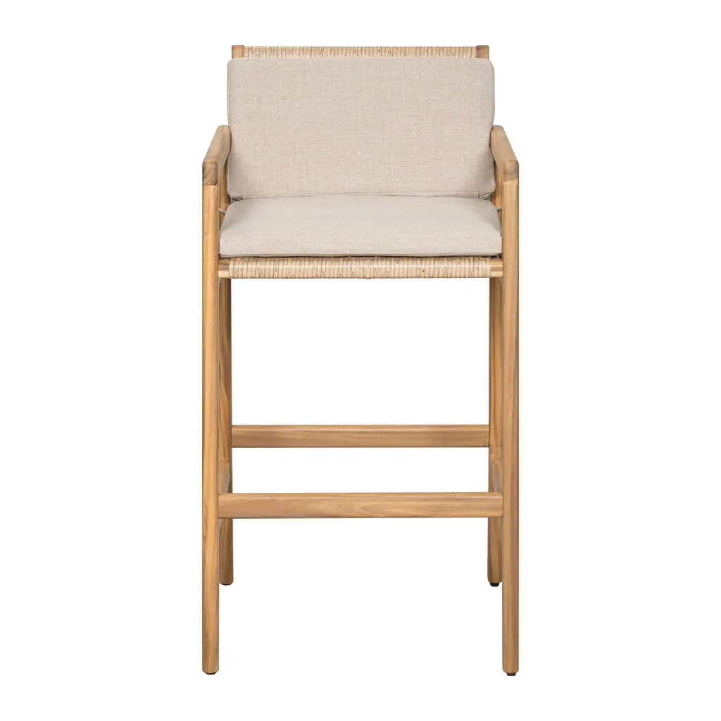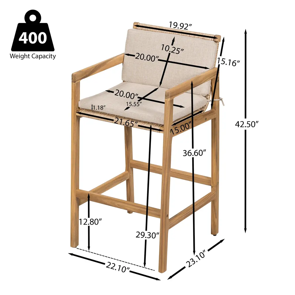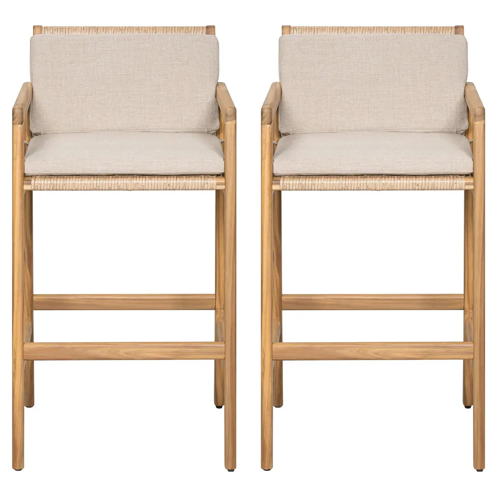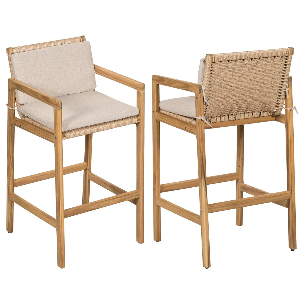 Charming Natural Foundation: Built with premium acacia wood, these barstools deliver durability and a rich wood grain texture that enhances any outdoor setting. The teak-finished frame introduces a timeless warmth that stands up to the elements while elevating your patio or bar space with rustic refinement. Artfully Woven Accents: Each seat and back panel features handwoven wicker with a breathable, elastic structure. The detailed weaving adds artistic flair and ensures airflow for all-day comfort, making these stools a perfect match for outdoor gatherings and evening conversations. Integrated Cushion Support: Designed for both aesthetics and comfort, the barstools include a unified seat and back cushion that seamlessly follows the body's natural curves. The smooth silhouette not only enhances support but also brings a modern, tailored finish to the entire piece. Secure and Functional Design: Cushions are fixed in place with sturdy straps, ensuring they stay put even through active use. These flexible fasteners offer simple adjustability and allow for easy cushion removal when cleaning or storing, adding to the set's everyday practicality. Relaxed Sophistication for Outdoor Moments: Whether you're enjoying sunset drinks or hosting weekend get-togethers, this barstool set adds a refined yet casual touch to your outdoor experience. The high-profile seating is ideal for bar counters, blending comfort with laid-back elegance. Overall Dimensions: 22.10"L x 23.10"W x 42.50"H Material: Acacia wood frame, wicker seat and back, olefin cushion fabric Set Includes: Two (2) barstools Integrated seat and back cushion design Assembly Required