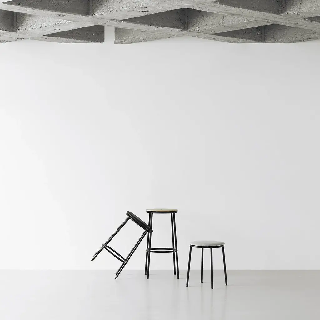 The Circa stool is a minimalistic and timeless stool comprising a steel tube frame and an oak veneer, aluminum or upholstered seat available in either textile or leather. The circular seat rests on a slender steel base in black powder steel. Available in three different sizes, Circa offers a timeless stool suitable for bars, kitchen islands, or extra seating by the dinner table.