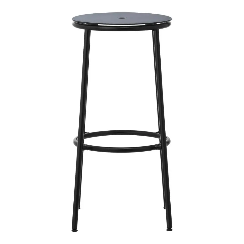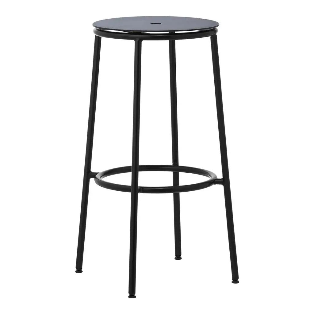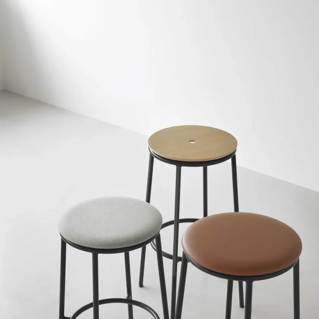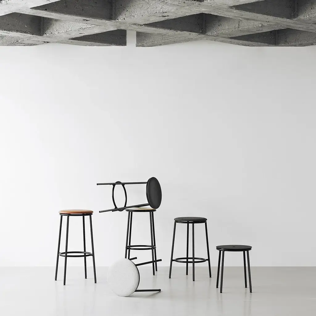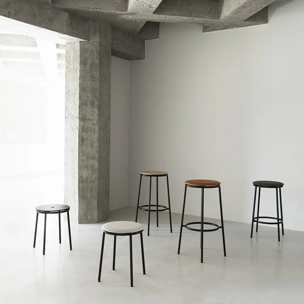 The Circa stool is a minimalistic and timeless stool comprising a steel tube frame and an oak veneer, aluminum or upholstered seat available in either textile or leather. The circular seat rests on a slender steel base in black powder steel. Available in three different sizes, Circa offers a timeless stool suitable for bars, kitchen islands, or extra seating by the dinner table.