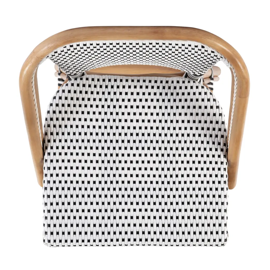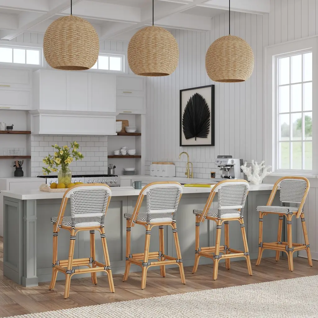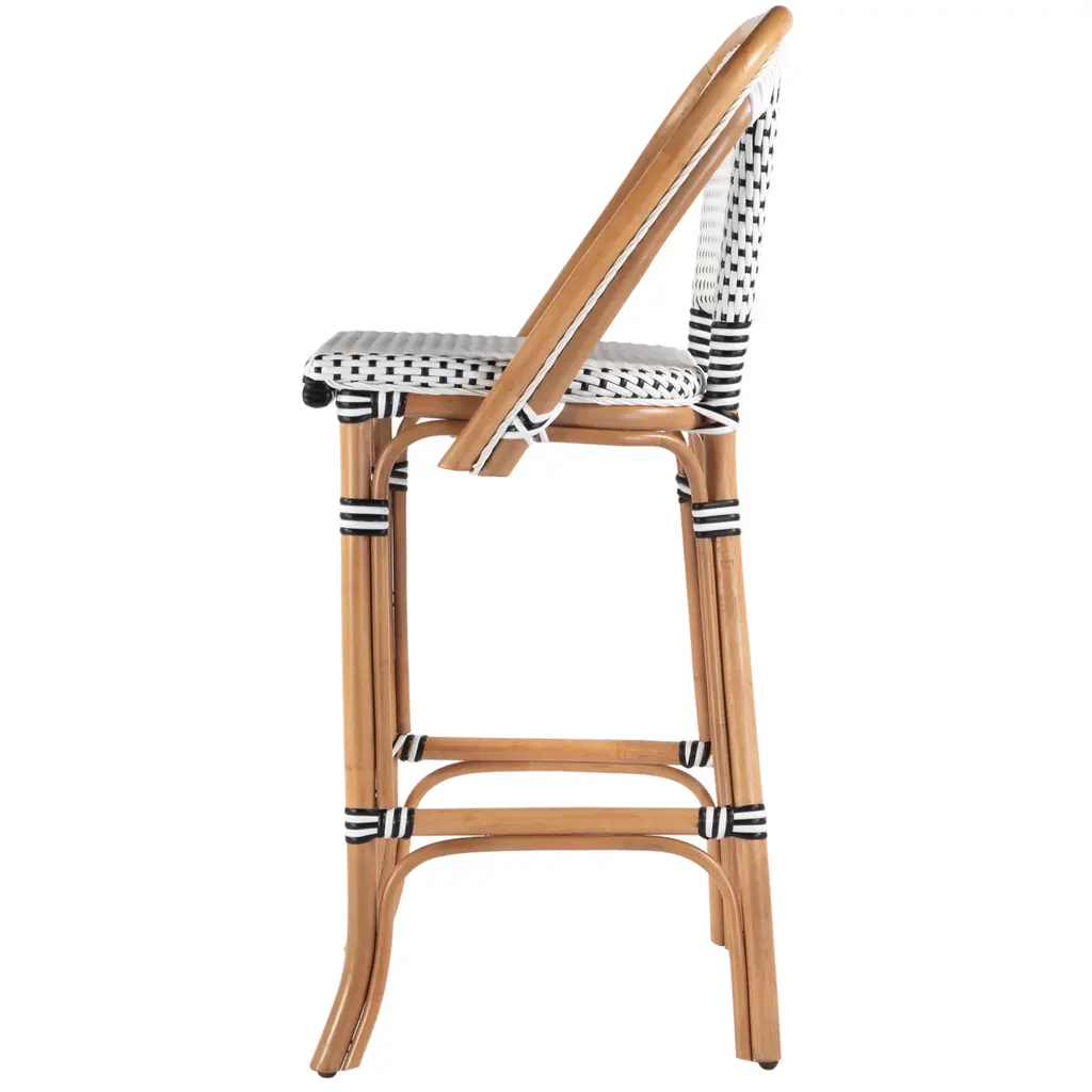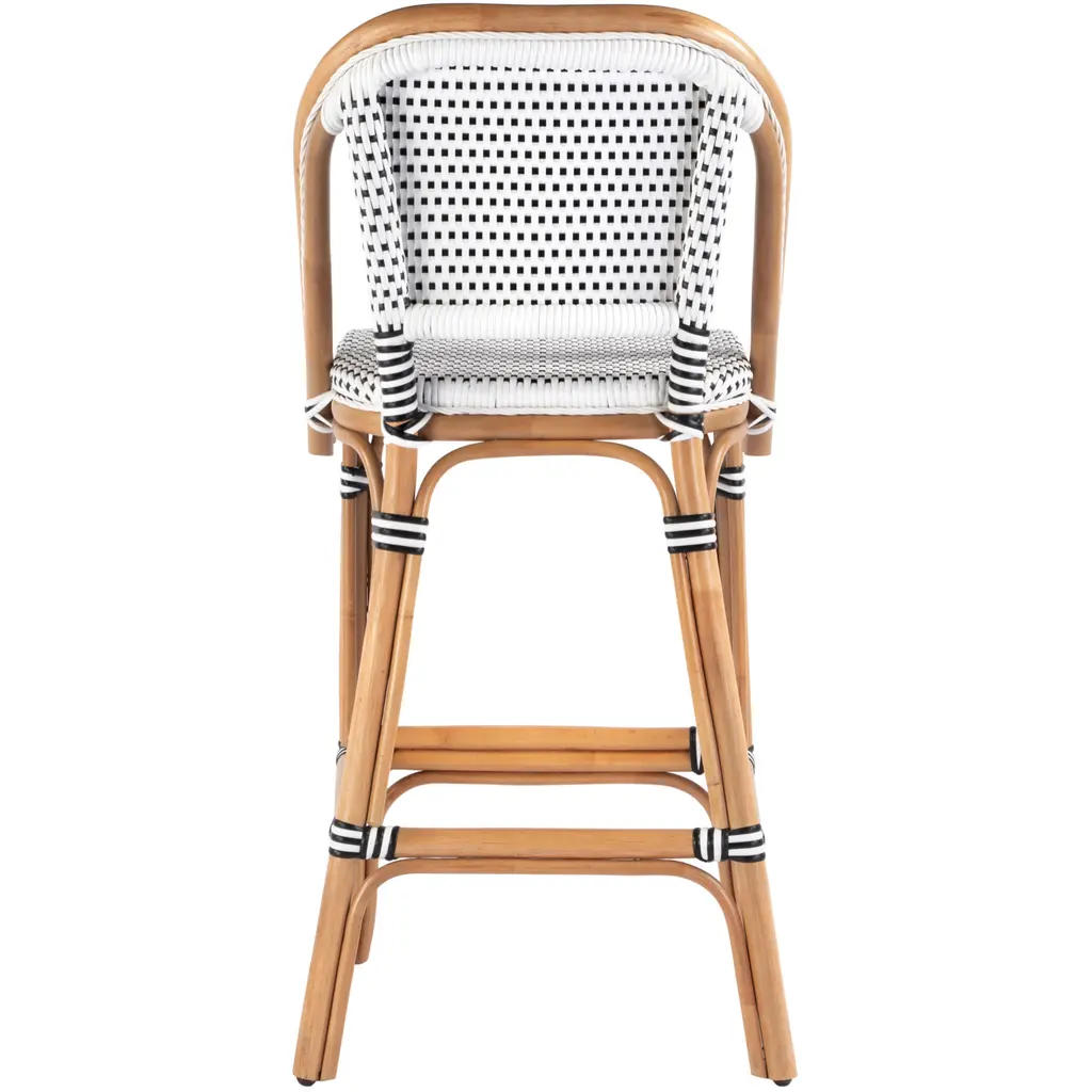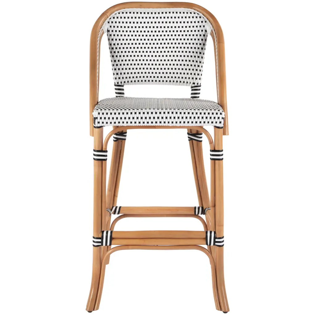 Evoking images of sidewalk tables in the Cote d' Azur, the Clementine Rattan 28 in. Seat Height Bar Stool with Back and Footrest will bring the casual sophistication of a Mediterranean coastal bistro to your kitchen or patio. Skillfully crafted from thick bent rattan for superb durability, it features weather-resistant woven plastic in an updated and fresh pattern. This barstool is lightweight for easy mobility, ensuring comfort and making any space a frequent gathering place. Ideal for both commercial and residential settings.
