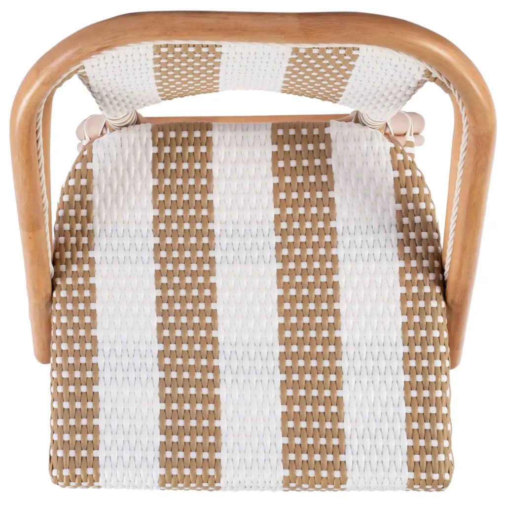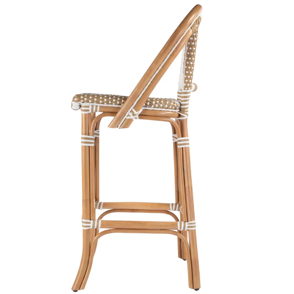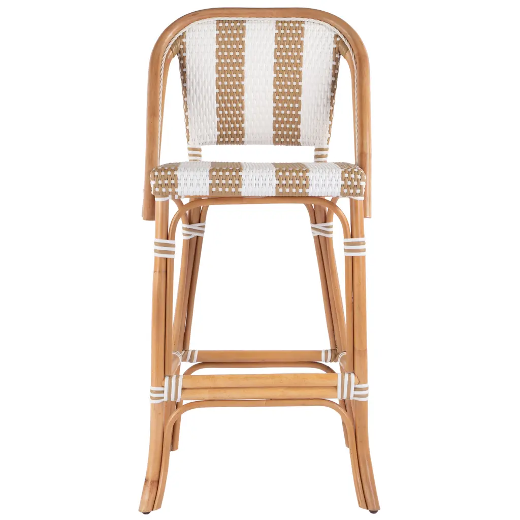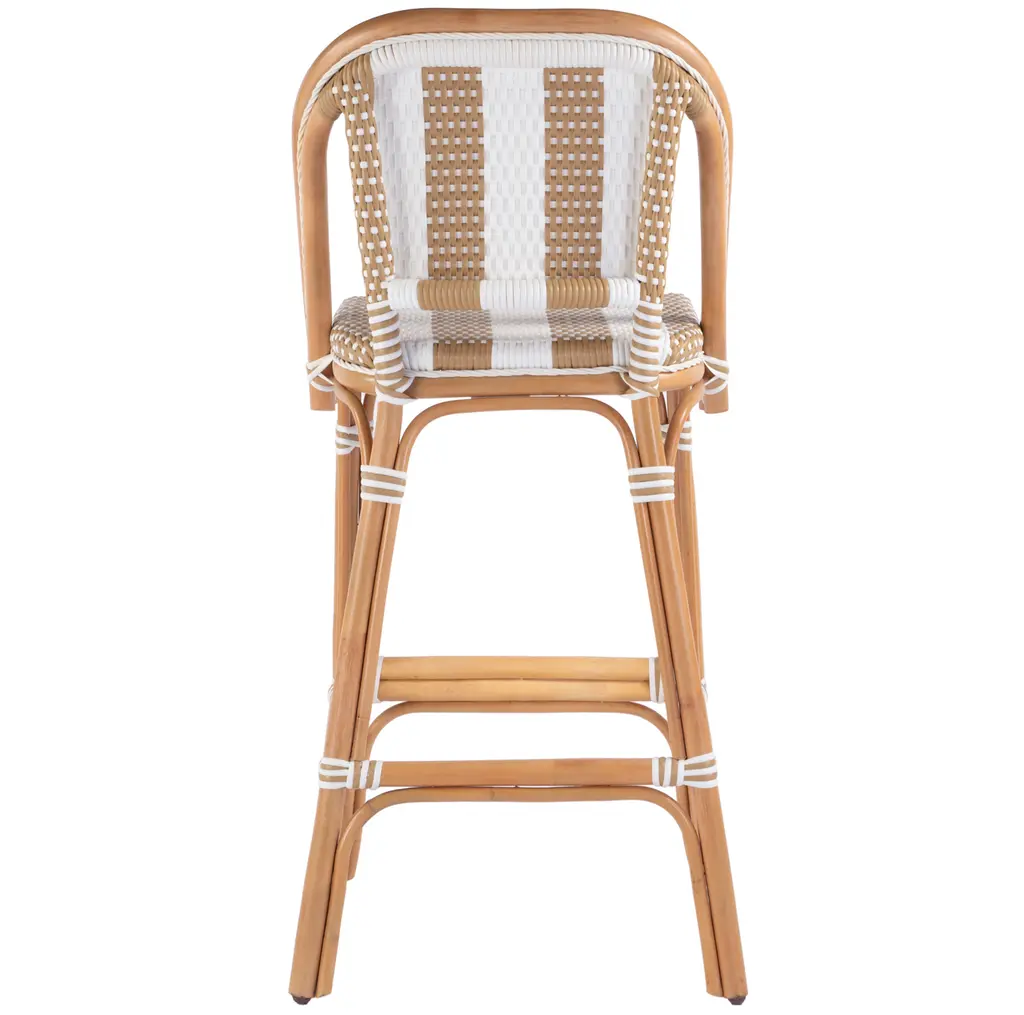 Evoking images of sidewalk tables in the Cote d' Azur, the Clementine Rattan 28 in. Seat Height Bar Stool with Back and Footrest will bring the casual sophistication of a Mediterranean coastal bistro to your kitchen or patio. Skillfully crafted from thick bent rattan for superb durability, it features weather-resistant woven plastic in an updated and fresh pattern. This barstool is lightweight for easy mobility, ensuring comfort and making any space a frequent gathering place. Ideal for both commercial and residential settings.