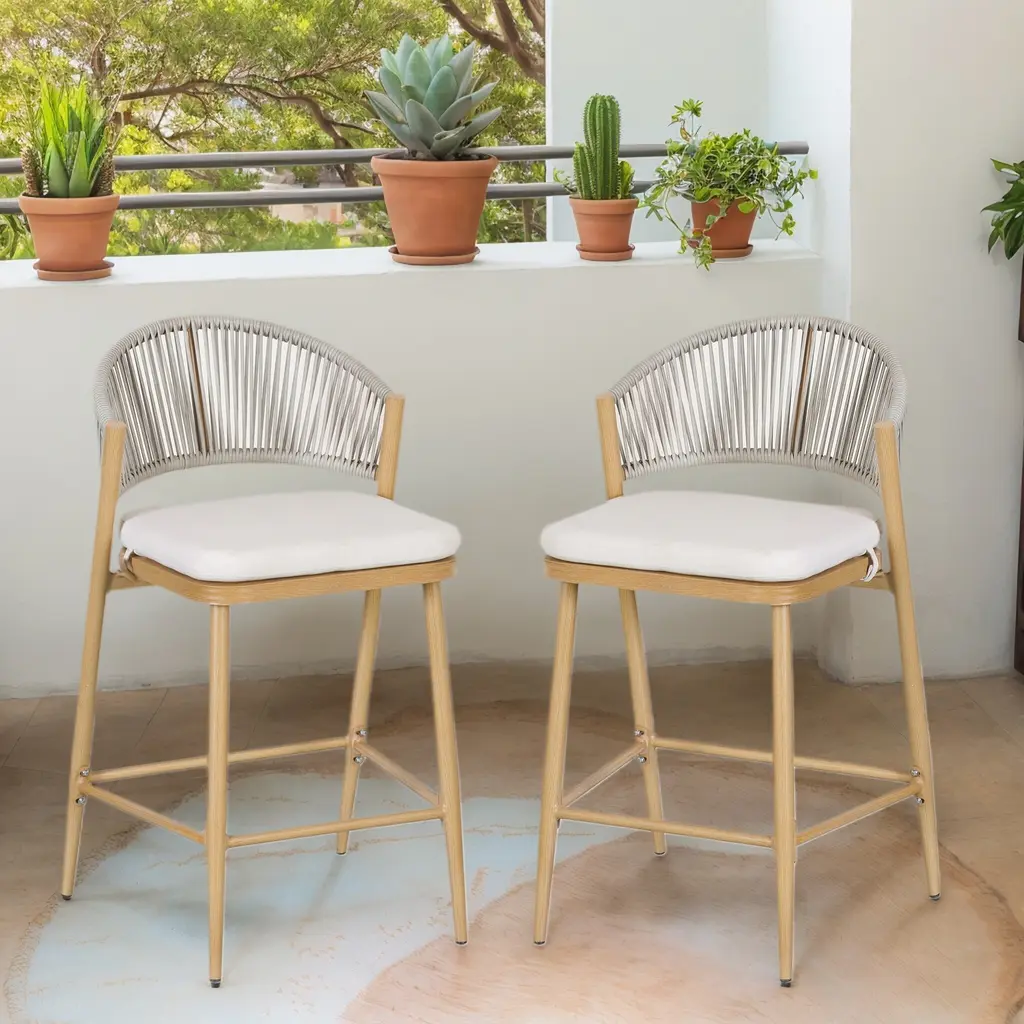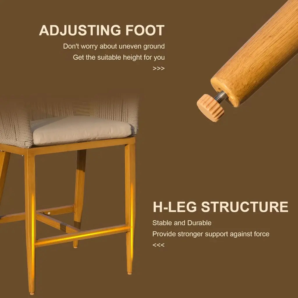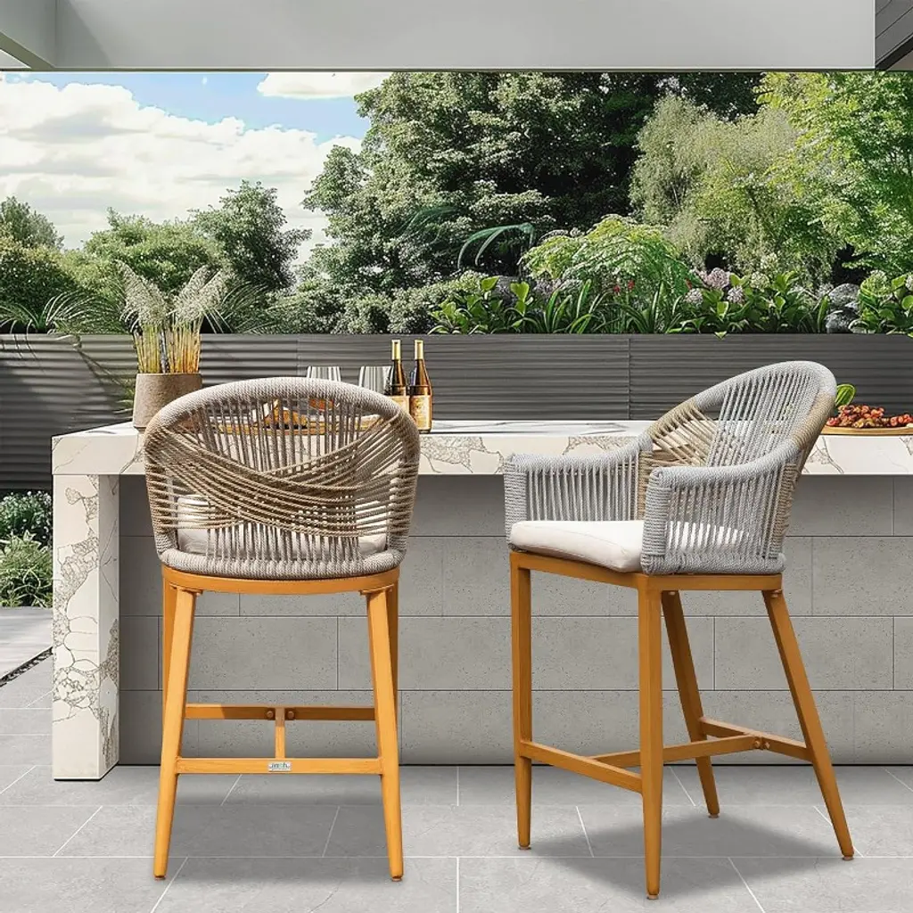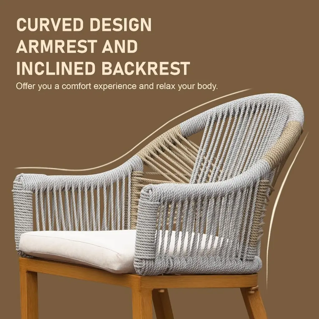 Enhance your outdoor space with these stylish teak-finished bar chairs. Featuring weather-resistant rope, ergonomic design, plush memory foam cushions, and adjustable feet, they blend modern elegance with long-lasting comfort¡ªperfect for patios, balconies, and poolside lounging.