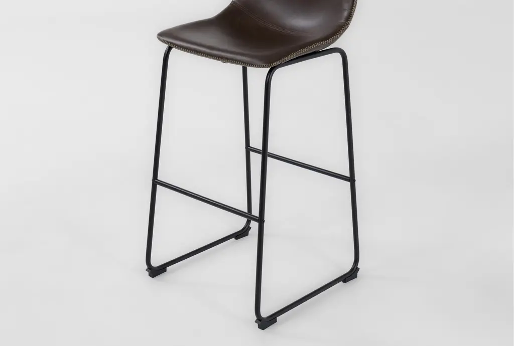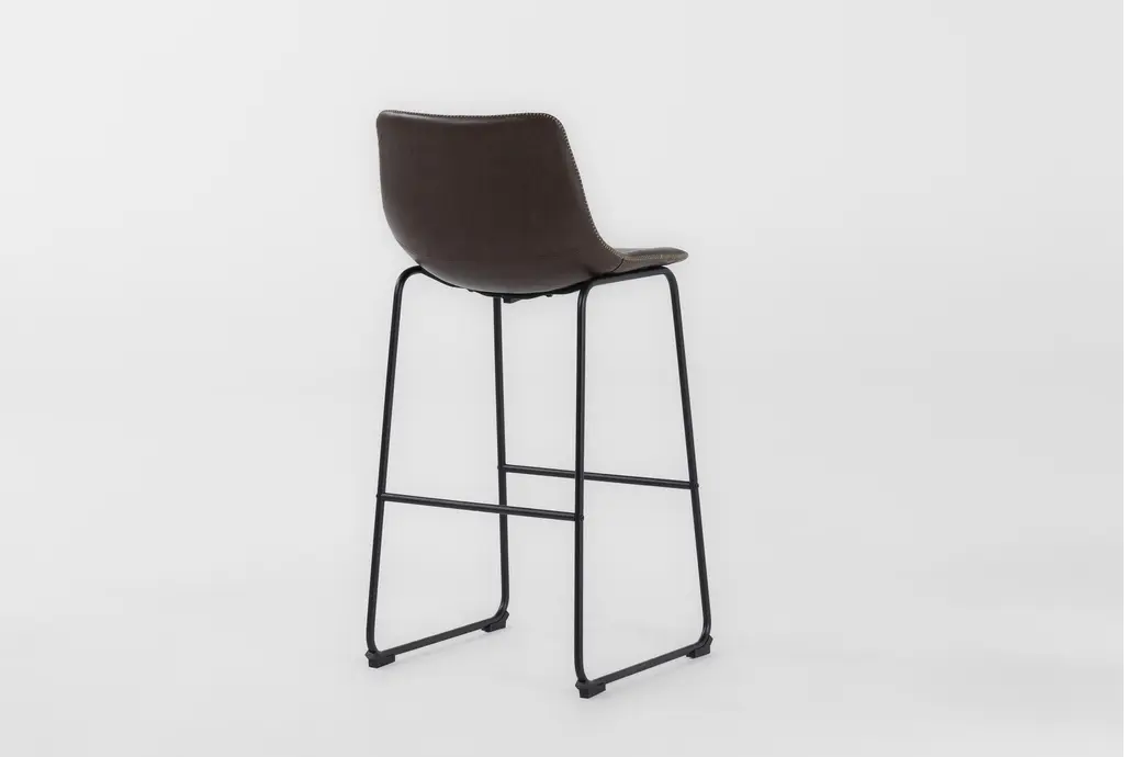 The Cobbler Brown 30" Faux Leather Bucket Seat With Baseball Stitch Bar Stool With Back Set Of 2 is a stylish addition to any dining room or kitchen. These modern bar stools feature a comfortable bucket seat design with a tight back and sleek metal legs. The rich brown faux leather upholstery is complemented by black accents, creating a sophisticated look.