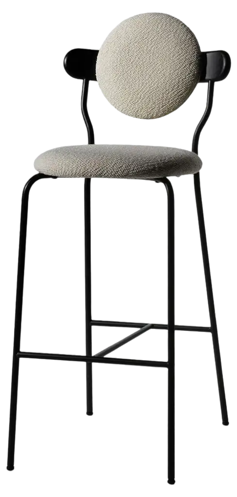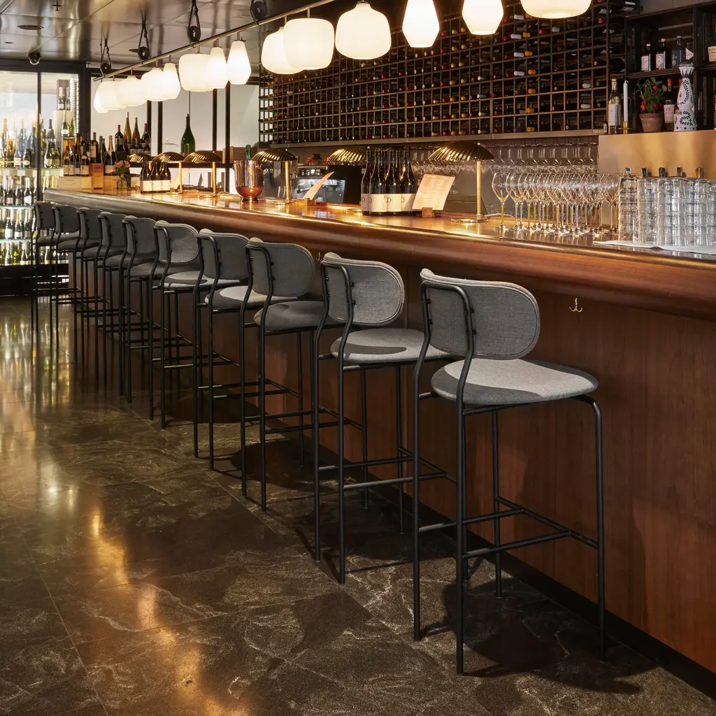 Coco puts a coquettish spin on industrial style as seen in this bar stool extension of OEO Studio's signature chair for Gubi. Designer Thomas Lykke offers a high level of comfort with the backrest's curvy shape, while also imparting a feminine and playful demeanor. Available in both bar and counter heights, the seating is fully upholstered in either textile or leather and has a pared-down black frame in powder-coated steel.