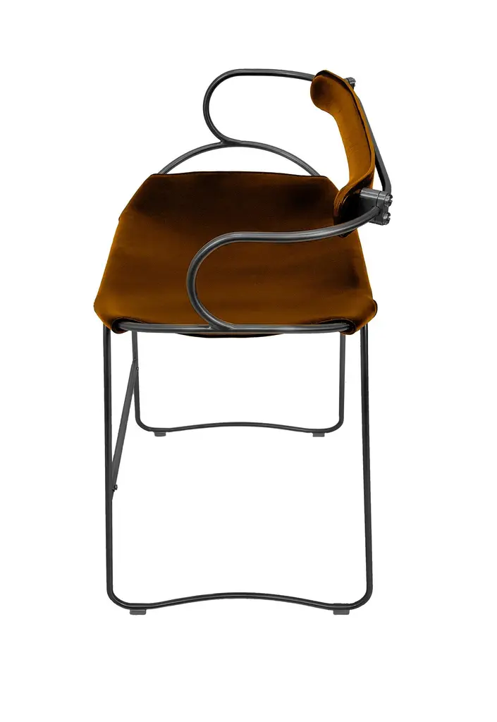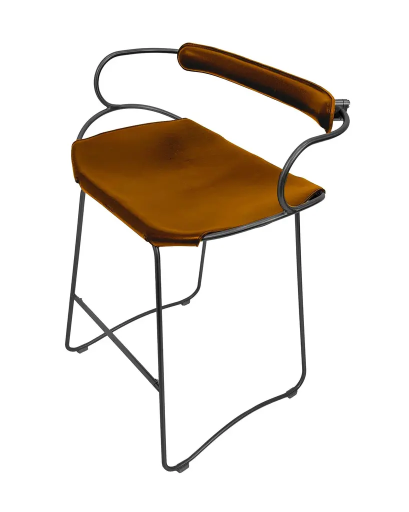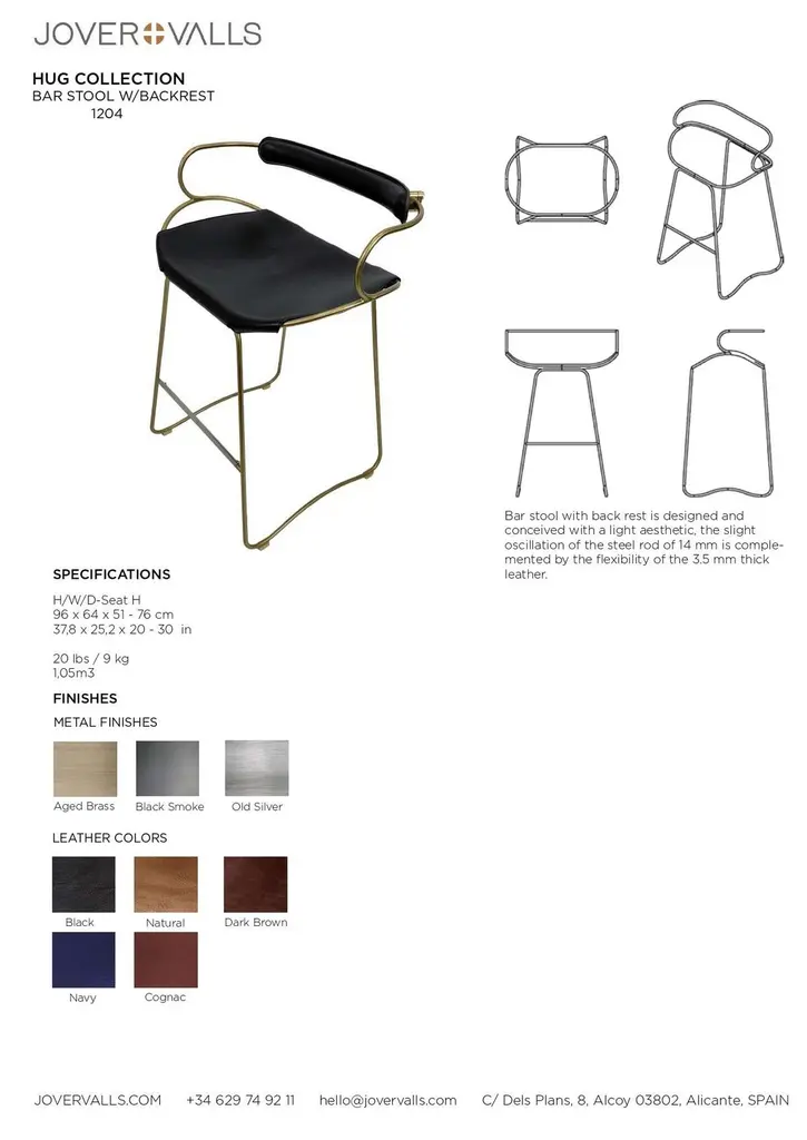 The Hug contemporary barstool with backrest is designed and conceived with a light aesthetic, the slight oscillation of the steel rod of 12 mm is complemented by the flexibility of the double 3.5 mm thick leather. When sitting in this furniture you feel an enveloping sensation, like being hugged, since the weight of the body is distributed evenly. Each unit becomes a refuge of visual and ergonomic wellbeing.Our Hug Collection is inspired by the organic lines of a landscape, the curves of nature, and the imaginary silhouette of the wind inspire this collection of organic forms, almost like metallic sculptures. All pieces are done with cold bended steel rods, polished, nickel plated, colored by electrolysis, and lacquered. The process of polishing and lacquering the steel, goes through a manual and delicate chroming process, which gives its final and unique metal color finish. This precise technique gives a uniform metallic finish of minimum 50 microns over the entire Surface. Our metal finishing has successfully passed a corrosion resistance test in a salt spray chamber according to UNE-EN ISO 9227: 2017 and UNE-EN ISO 1456: 2010. Our signature screws are made with brass turning lathed, polished, and lacquered, these are the pieces that fix the saddle leather to the metal frame.Leathers are Spanish hides vegetable tanned. We use premium saddles in multiple colors to adjust to your taste and interior needs. This traditional vegetable dying and tanning method is an organic technique that relies on natural tannings from bark or plant tissues. The use of oils and natural fats give the leather a distinctive flexibility and texture, allowing it to be molded, retain its shape and age graciously.All skins are carefully selected from food industry, with a minimum thickness of 3.5 mm / 0,02 in, using the part of the animal's shoulder, which allows for larger pieces and uniformity, even though signature wrinkle from the animal’s neck may be recognizable. The vegetable tanning is a traditional and artisan treatment, which is respectful to the environment. Even with careful selection natural marks as a result of the contact with other animals, the age, origin and characteristics of the skin, or even the season in which the tanning takes place cannot be avoided. We still believe that these factors only add authenticity and uniqueness to every piece. Our leather parts are made with double saddles, always showing the top side of the hides that presents the better quality.Customization options.With the aim of creating customized pieces, clients can select from the various metal finishes, and leather colors to create pieces that complement their home décor. Leather colors available, black, navy, dark brown, cognac and natural tobacco, and steel polished finishing available, aged brass, black smoke and aged silver.Normally we use tone on tone threats for stitches, but client can select a contrast option, being possible to select any color to make a unique piece for the project it belongs. The finish on the edges of our leather components are sanded and hand painted. We have the option of select an alternative color if not tone on tone will be applied.Please consult in case you are interested on having a particular heat embossing stamp on the leather with your own branding.Our collections are made to full fill home spaces where to gather and enjoy great conversation with families and friends. Occasional furniture for exquisite homes, from cottages to exclusive resorts. Our product is understood as a sculptural piece of design, as an art object to be displayed at different house spaces as library, bar, living, foyer, bedroom, powder, meeting, grand or great room.The different finishes options make the furniture perfect combinations on diverse styles, from rustic mountain home, a small cottage, a ski lodge retreat, or industrial a minimalist look.