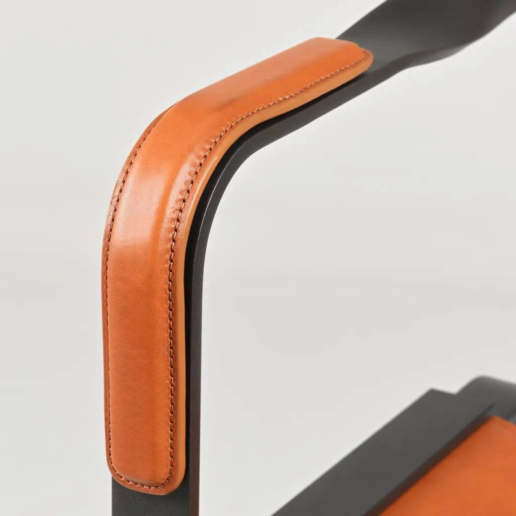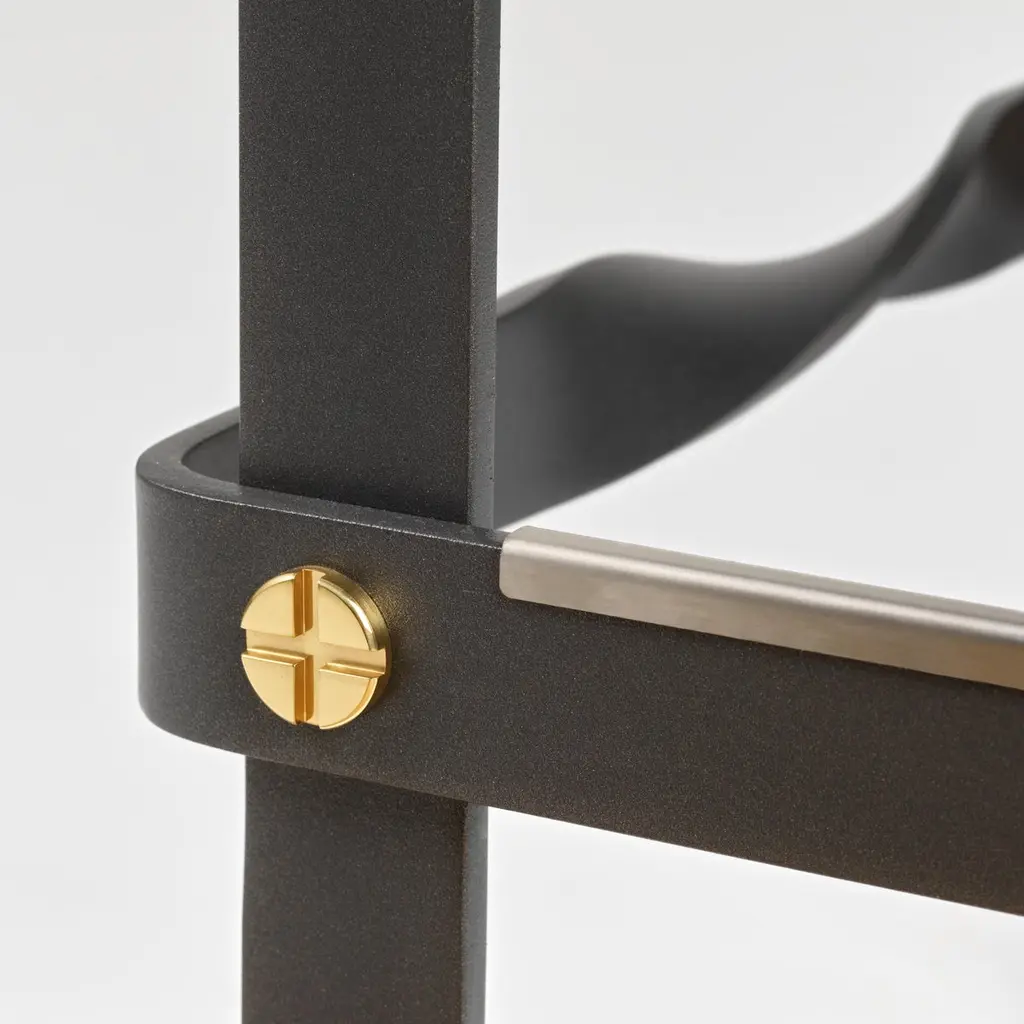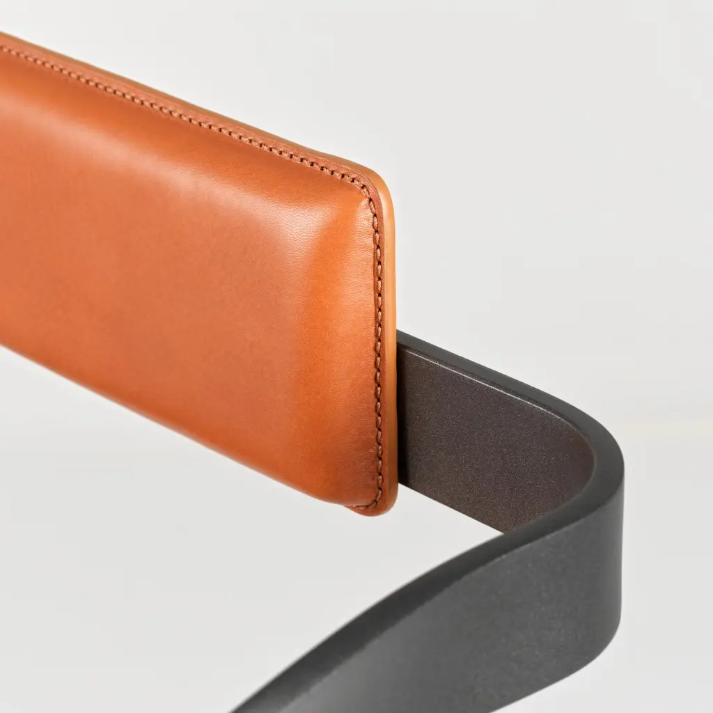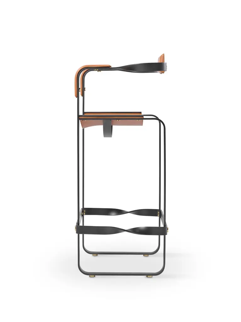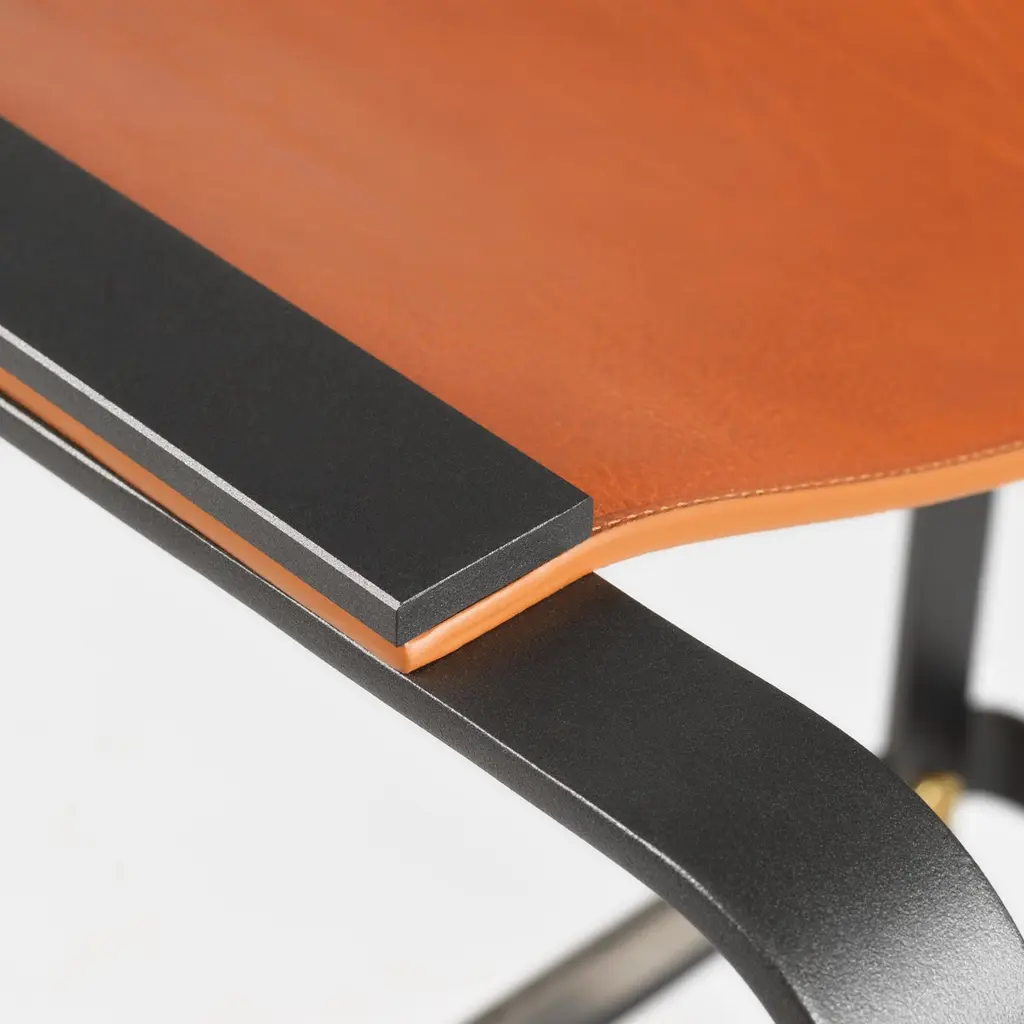 The Wanderlust contemporary collection belongs to a collection of minimalist and serene pieces where exclusivity and precision are shown in small details such as the hand-turned metal nuts and bolts that fix the leather surfaces, that go unnoticed at first sight.The robustness of the steel structure is combined with the delicacy of the rounded edges. The matte metal finishes evoke the passage of time and are complemented by vegetable tanned cowhide leathers that age gracefully with its use.The Wanderlust counter stool is designed and conceived as a tribute of Bauhaus tribute, the phrases "Less is more" and "God is in the detail" from the German American architect and industrial designer Mies van der Rohe, one of the pioneers of modernist architecture, define this collection.All pieces are done with cold bended steel rods, and this hospitality collection is finished with an outdoor powder coating. Our signature screws are made with brass turning lathed, polished, and lacquered, these are the pieces that fix the saddle leather to the metal frame.For a residential use we recommend our signature polished, nickeled, electroplated and lacquered finish for an exclusive touch, you can find here the pictures.Leathers are Spanish hides vegetable tanned. Jover+Valls uses premium saddles in multiple colors to adjust to your taste and interior needs. This traditional vegetable dying and tanning method is an organic technique that relies on natural tannings from bark or plant tissues. The use of oils and natural fats give the leather a distinctive flexibility and texture, allowing it to be molded, retain its shape and age graciously.All skins are carefully selected from food industry sub-products, with a minimum thickness of 3.5 mm / 0,02 in, using the part of the animal's shoulder, which allows for larger pieces and uniformity, even though signature wrinkle from the animal’s neck may be recognizable. The vegetable tanning is a traditional and artisan treatment, which is respectful to the environment. Even with careful selection natural marks as a result of the contact with other animals, the age, origin and characteristics of the skin, or even the season in which the tanning takes place cannot be avoided. We still believe that these factors only add authenticity and uniqueness to every piece. Our leather parts are made with double saddles, always showing the top side of the hides that presents the better quality.Customization options.With the aim of creating customized pieces, clients can select from the various metal finishes, and leather colors to create pieces that complement their home décor. Leather colors available, black, navy, dark brown, cognac and natural tobacco, and powder coating finishes available are Amber, Jasmine and Nuit Noir .Normally we use tone on tone threats for stitches, but client can select a contrast option, being possible to select any color to make a unique piece for the project it belongs. The finish on the edges of our leather components is sanded and hand painted. We have the option of select an alternative color if not tone on tone will be applied.Our collections are made to full fill home spaces where to gather and enjoy great conversation with families and friends. Occasional furniture for exquisite homes, from cottages to exclusive resorts. Our product is understood as a sculptural piece of design, as an art object to be displayed at different house spaces as library, bar, living, foyer, bedroom, powder, meeting, grand or great room.The different finishes options make the furniture perfect combinations on diverse styles, from rustic mountain home, a small cottage, a ski lodge retreat, or industrial a minimalist look.