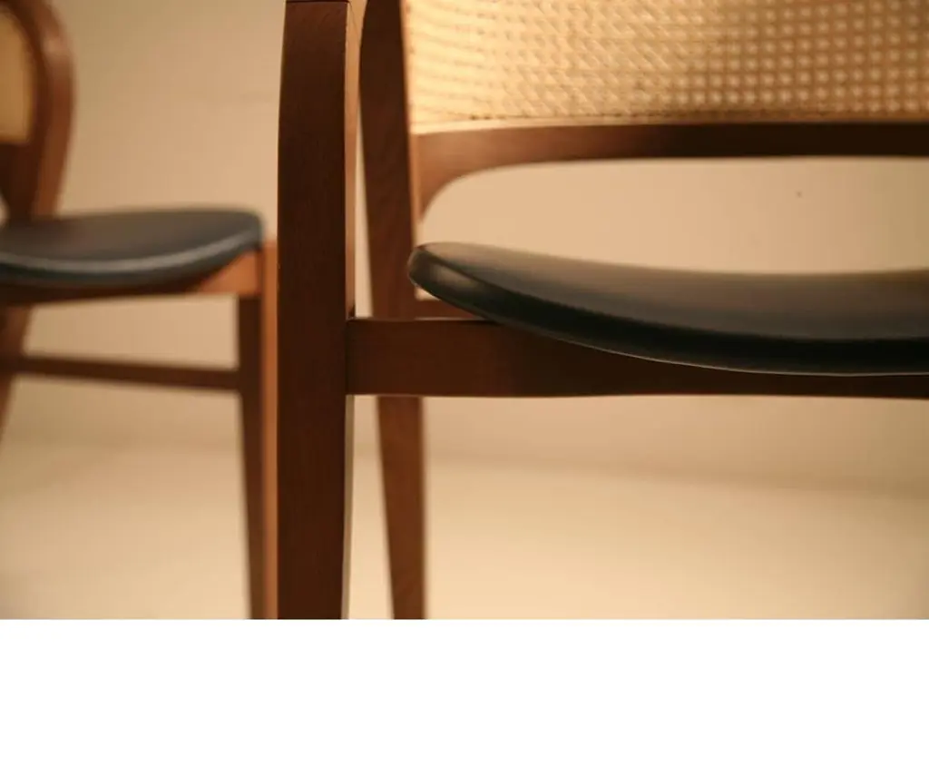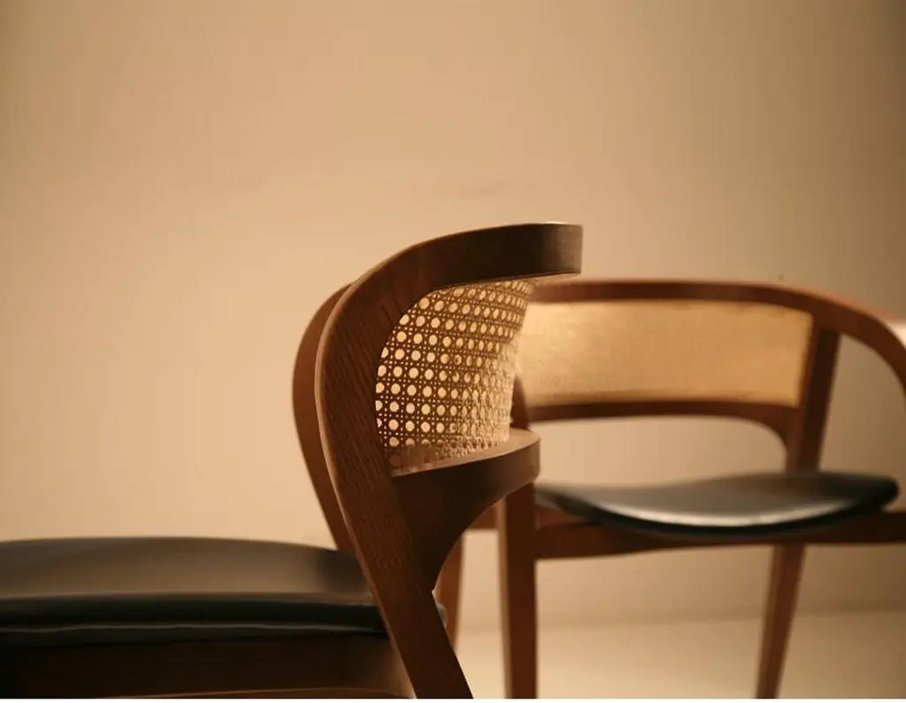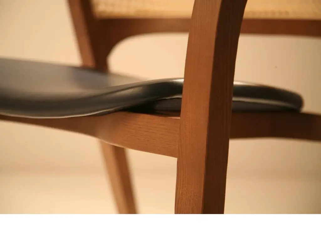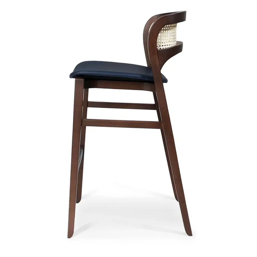 A Mid-Century Modern style bar chair in walnut finished frame.Backrest in natural woven cane and seat upholstered in black faux leather.Dimensions: W 46 cm x D 58 cm x H 104 cmMaterials: Wood, Faux Leather, RattanSeat H 75 cmAvailable in COM.“Minimum order of 2.”.We will be glad to check with the factory’s technical team if sizes, finishes, and colors can be customized. We do our best to expedite production and to ship and deliver product within the listed lead time, however current lead times might be longer due to global shipping backlog and delays. These delays are out of our control and cannot be a reason to cancel an order.