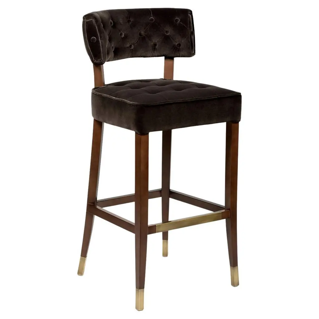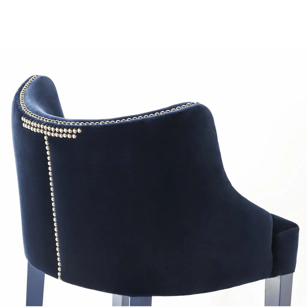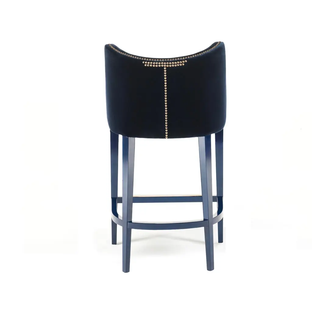 This barstool is the epitome of serenity inducing design. With an embracing Silhouette and luxurious deep seat, its sensuous curves and comfortable back perfectly adapt to the body. The nails adorning the curves and back of the pieces provide a soothing feel to its lines. It is a truly feminine, soft and pleasant design that sets out to be like a second skin. Available in counter height.Upholstery: Velvet Legs: Available upholstered, rosewood, ebony or walnut veneer, Wengé stain or lacquer in all RAL colors, in matte or gloss.Nails: matte or plated nickel, plated brass, bronze Renaissance or old gold speckled.This barstool is offered as a counter stool. Counter Stool Dimensions: Height: 37.4 in (95 cm), Width: 20.87 in (53 cm), Depth: 19.69 in (50 cm), Seat Height: 27.5 in (70 cm)Handmade in Europe.We will be glad to check with the factory’s technical team if sizes, finishes, and colors can be customized. We do our best to expedite production and to ship and deliver product within the listed lead time, however current lead times might be longer due to global shipping backlog and delays. These delays are out of our control and cannot be a reason to cancel an order.Our pricing includes all costs for international shipping to the U.S., as well as duties and customs clearance fees. Please be aware that local delivery within the U.S. is not included. We offer white glove, front door, and warehouse delivery options. For shipments outside the U.S., kindly reach out to us for a detailed quote..