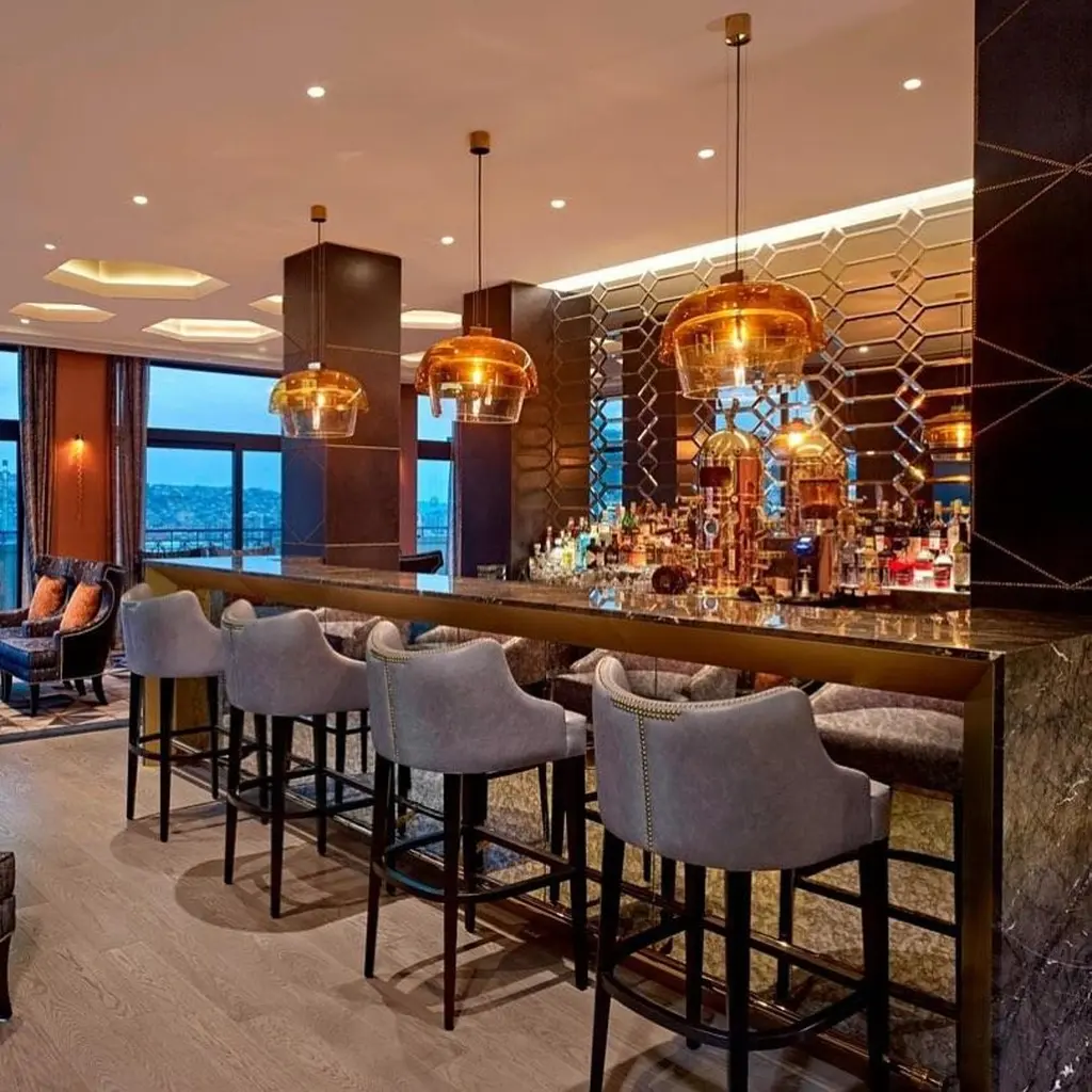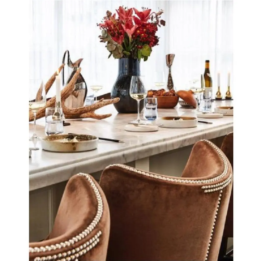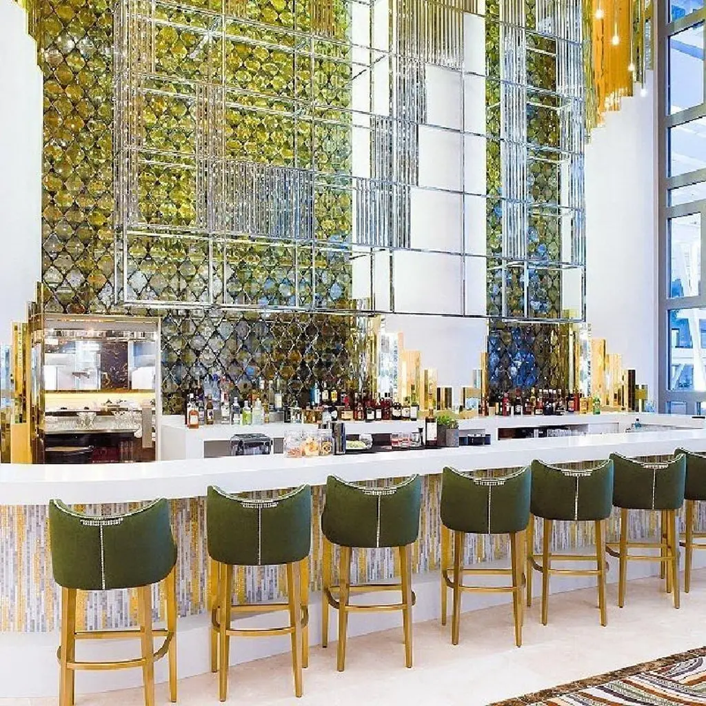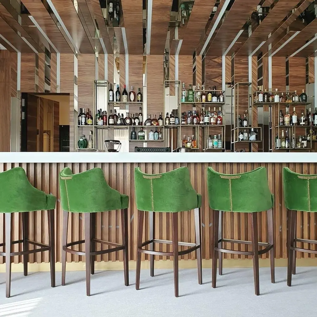 This barstool is the epitome of serenity inducing design. With an embracing Silhouette and luxurious deep seat, its sensuous curves and comfortable back perfectly adapt to the body. The nails adorning the curves and back of the pieces provide a soothing feel to its lines. It is a truly feminine, soft and pleasant design that sets out to be like a second skin. Available in counter height.Upholstery: Velvet Legs: Available upholstered, rosewood, ebony or walnut veneer, Wengé stain or lacquer in all RAL colors, in matte or gloss.Nails: matte or plated nickel, plated brass, bronze Renaissance or old gold speckled.This barstool is offered as a counter stool. Counter Stool Dimensions: Height: 37.4 in (95 cm), Width: 20.87 in (53 cm), Depth: 19.69 in (50 cm), Seat Height: 27.5 in (70 cm)Handmade in Europe.We will be glad to check with the factory’s technical team if sizes, finishes, and colors can be customized. We do our best to expedite production and to ship and deliver product within the listed lead time, however current lead times might be longer due to global shipping backlog and delays. These delays are out of our control and cannot be a reason to cancel an order.Our pricing includes all costs for international shipping to the U.S., as well as duties and customs clearance fees. Please be aware that local delivery within the U.S. is not included. We offer white glove, front door, and warehouse delivery options. For shipments outside the U.S., kindly reach out to us for a detailed quote..