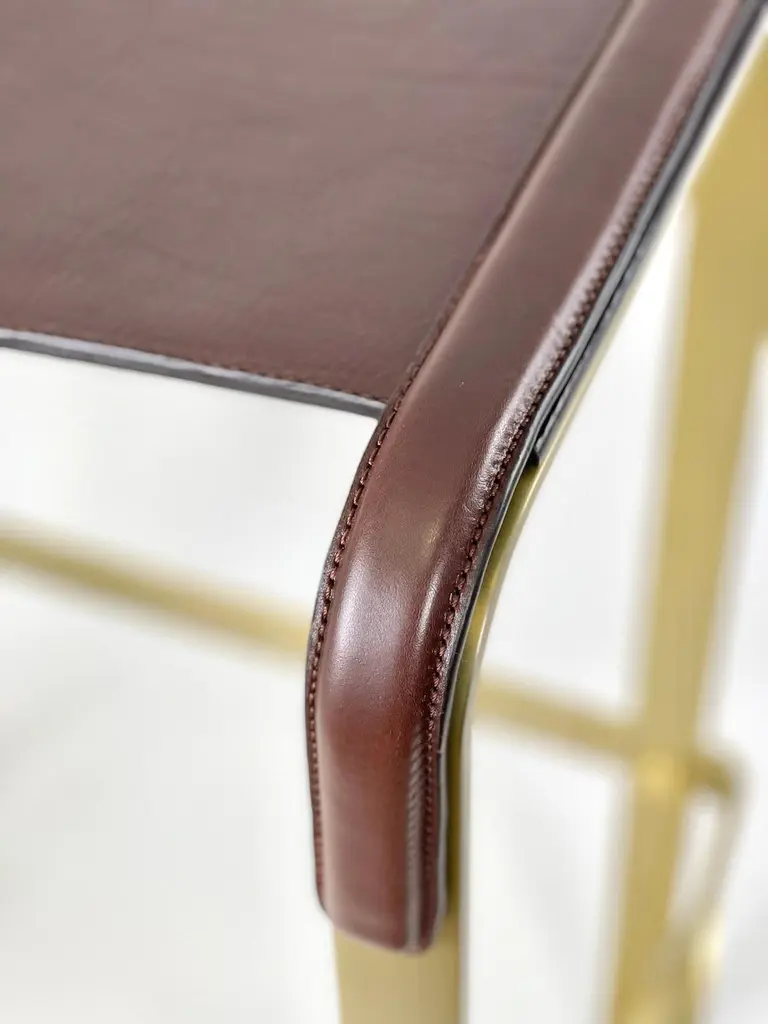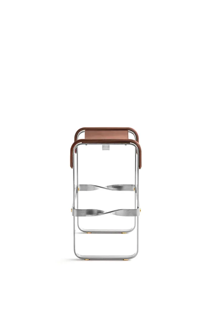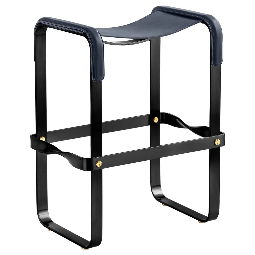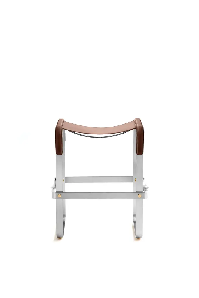The Wanderlust contemporary counter stool belongs to a collection of minimalist and serene pieces where exclusivity and precision are shown in small details such as the hand-turned metal nuts and bolts that fix the leather surfaces, that go unnoticed at first sight.The robustness of the steel structure is combined with the delicacy of the rounded edges. The matte metal finishes evoke the passage of time and are complemented by vegetable tanned cowhide leathers that age gracefully with its use.The Wanderlust counter stool is designed and conceived as a tribute of Bauhaus tribute, the phrases "Less is more" and "God is in the detail" from the German American architect and industrial designer Mies van der Rohe, one of the pioneers of modernist architecture, define this collection.All pieces are done with cold bended steel rods, polished, nickel plated, colored by electrolysis, and lacquered. The process of polishing and lacquering the steel, goes through a manual and delicate chroming process, which gives its final and unique metal color finish. This precise technique gives a uniform metallic finish of minimum 50 microns over the entire Surface. Our metal finishing has successfully passed a corrosion resistance test in a salt spray chamber according to UNE-EN ISO 9227: 2017 and UNE-EN ISO 1456: 2010. Our signature screws are made with brass turning lathed, polished, and lacquered, these are the pieces that fix the saddle leather to the metal frame.Leathers are Spanish hides vegetable tanned. We use premium saddles in multiple colors to adjust to your taste and interior needs. This traditional vegetable dying and tanning method is an organic technique that relies on natural tannings from bark or plant tissues. The use of oils and natural fats give the leather a distinctive flexibility and texture, allowing it to be molded, retain its shape and age graciously.All skins are carefully selected from food industry sub-products, with a minimum thickness of 3.5 mm / 0,02 in, using the part of the animal's shoulder, which allows for larger pieces and uniformity, even though signature wrinkle from the animal’s neck may be recognizable. The vegetable tanning is a traditional and artisan treatment, which is respectful to the environment. Even with careful selection natural marks as a result of the contact with other animals, the age, origin and characteristics of the skin, or even the season in which the tanning takes place cannot be avoided. We still believe that these factors only add authenticity and uniqueness to every piece. Our leather parts are made with double saddles, always showing the top side of the hides that presents the better quality.Customization options.With the aim of creating customized pieces, clients can select from the various metal finishes, and leather colors to create pieces that complement their home décor. Leather colors available, black, navy, dark brown, cognac and natural tobacco, and steel polished finishing available, aged brass, black smoke and aged silver.Normally we use tone on tone threats for stitches, but client can select a contrast option, being possible to select any color to make a unique piece for the project it belongs. The finish on the edges of our leather components are sanded and hand painted. We have the option of select an alternative color if not tone on tone will be applied.Please consult in case you are interested on having a particular heat embossing stamp on the leather with your own branding.Our collections are made to full fill home spaces where to gather and enjoy great conversation with families and friends. Occasional furniture for exquisite homes, from cottages to exclusive resorts. Our product is understood as a sculptural piece of design, as an art object to be displayed at different house spaces as library, bar, living, foyer, bedroom, powder, meeting, grand or great room.The different finishes options make the furniture perfect combinations on diverse styles, from rustic mountain home, a small cottage, a ski lodge retreat, or industrial a minimalist look.
