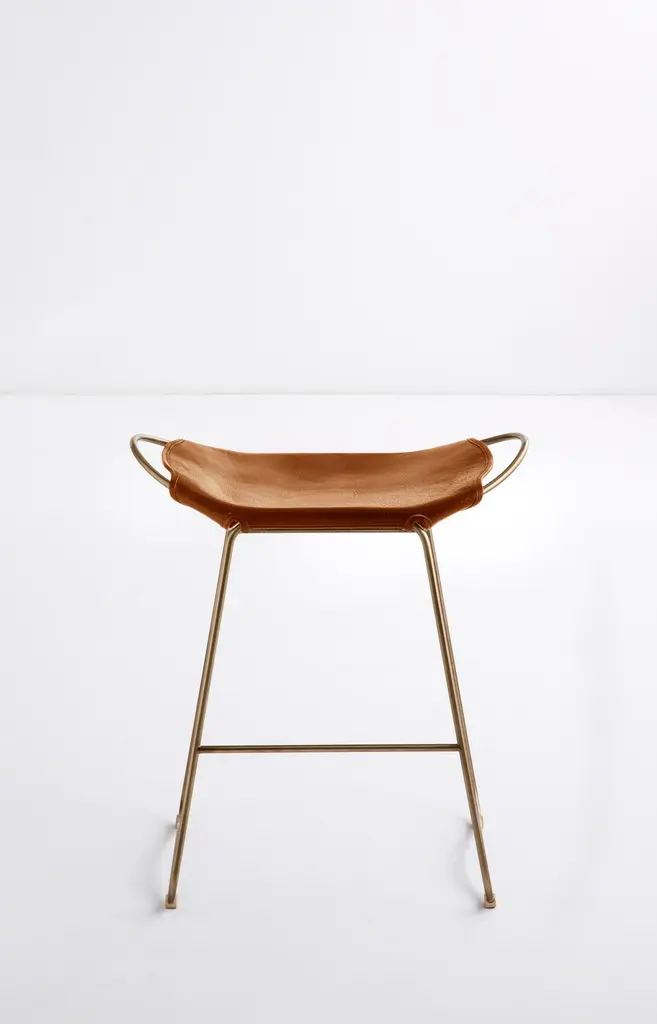 The Hug contemporary counter stool is designed and conceived with a light aesthetic, the slight oscillation of the steel rod of 12 mm is complemented by the flexibility of the double 3.5 mm thick leather. When sitting in this furniture you feel an enveloping sensation, like being hugged, since the weight of the body is distributed evenly. Each unit becomes a refuge of visual and ergonomic wellbeing.Our Hug Collection is inspired by the organic lines of a landscape, the curves of nature, and the imaginary silhouette of the wind inspire this collection of organic forms, almost like metallic sculptures. All pieces are done with cold bended steel rods, polished, nickel plated, colored by electrolysis, and lacquered. The process of polishing and lacquering the steel, goes through a manual and delicate chroming process, which gives its final and unique metal color finish. This precise technique gives a uniform metallic finish of minimum 50 microns over the entire Surface. Our metal finishing has successfully passed a corrosion resistance test in a salt spray chamber according to UNE-EN ISO 9227: 2017 and UNE-EN ISO 1456: 2010. Our signature screws are made with brass turning lathed, polished, and lacquered, these are the pieces that fix the saddle leather to the metal frame.Leathers are Spanish hides vegetable tanned. We use premium saddles in multiple colors to adjust to your taste and interior needs. This traditional vegetable dying and tanning method is an organic technique that relies on natural tannings from bark or plant tissues. The use of oils and natural fats give the leather a distinctive flexibility and texture, allowing it to be molded, retain its shape and age graciously.All skins are carefully selected from food industry, with a minimum thickness of 3.5 mm / 0,02 in, using the part of the animal's shoulder, which allows for larger pieces and uniformity, even though signature wrinkle from the animal’s neck may be recognizable. The vegetable tanning is a traditional and artisan treatment, which is respectful to the environment. Even with careful selection natural marks as a result of the contact with other animals, the age, origin and characteristics of the skin, or even the season in which the tanning takes place cannot be avoided. We still believe that these factors only add authenticity and uniqueness to every piece. Our leather parts are made with double saddles, always showing the top side of the hides that presents the better quality.Customization options.With the aim of creating customized pieces, clients can select from the various metal finishes, and leather colors to create pieces that complement their home décor. Leather colors available, black, navy, dark brown, cognac and natural tobacco, and steel polished finishing available, aged brass, black smoke and aged silver.Normally we use tone on tone threats for stitches, but client can select a contrast option, being possible to select any color to make a unique piece for the project it belongs. The finish on the edges of our leather components are sanded and hand painted. We have the option of select an alternative color if not tone on tone will be applied.Please consult in case you are interested on having a particular heat embossing stamp on the leather with your own branding.Our collections are made to full fill home spaces where to gather and enjoy great conversation with families and friends. Occasional furniture for exquisite homes, from cottages to exclusive resorts. Our product is understood as a sculptural piece of design, as an art object to be displayed at different house spaces as library, bar, living, foyer, bedroom, powder, meeting, grand or great room.The different finishes options make the furniture perfect combinations on diverse styles, from rustic mountain home, a small cottage, a ski lodge retreat, or industrial a minimalist look.