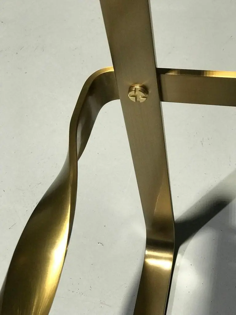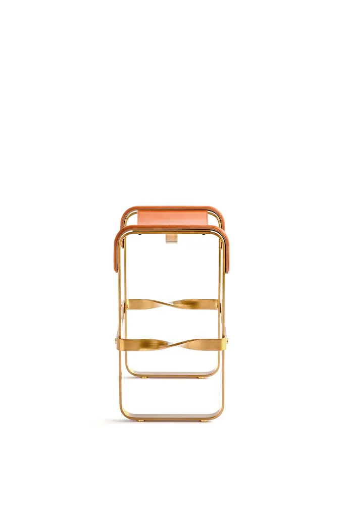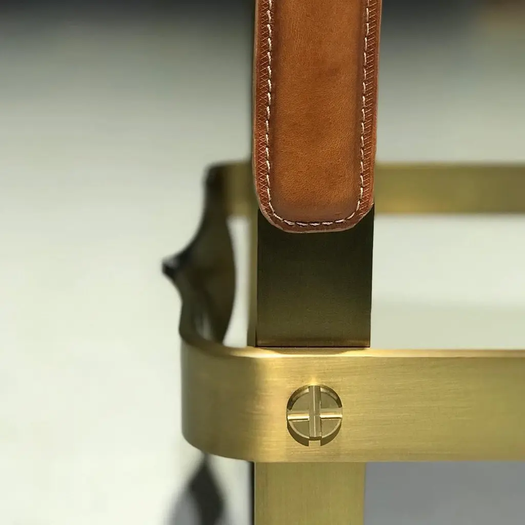 The Wanderlust contemporary counter stool belongs to a collection of minimalist and serene pieces where exclusivity and precision are shown in small details such as the hand-turned metal nuts and bolts that fix the leather surfaces, that go unnoticed at first sight.The robustness of the steel structure is combined with the delicacy of the rounded edges. The matte metal finishes evoke the passage of time and are complemented by vegetable tanned cowhide leathers that age gracefully with its use.The Wanderlust counter stool is designed and conceived as a tribute of Bauhaus tribute, the phrases "Less is more" and "God is in the detail" from the German American architect and industrial designer Mies van der Rohe, one of the pioneers of modernist architecture, define this collection.All pieces are done with cold bended steel rods, polished, nickel plated, colored by electrolysis, and lacquered. The process of polishing and lacquering the steel, goes through a manual and delicate chroming process, which gives its final and unique metal color finish. This precise technique gives a uniform metallic finish of minimum 50 microns over the entire Surface. Our metal finishing has successfully passed a corrosion resistance test in a salt spray chamber according to UNE-EN ISO 9227: 2017 and UNE-EN ISO 1456: 2010. Our signature screws are made with brass turning lathed, polished, and lacquered, these are the pieces that fix the saddle leather to the metal frame.Leathers are Spanish hides vegetable tanned. We use premium saddles in multiple colors to adjust to your taste and interior needs. This traditional vegetable dying and tanning method is an organic technique that relies on natural tannings from bark or plant tissues. The use of oils and natural fats give the leather a distinctive flexibility and texture, allowing it to be molded, retain its shape and age graciously.All skins are carefully selected from food industry sub-products, with a minimum thickness of 3.5 mm / 0,02 in, using the part of the animal's shoulder, which allows for larger pieces and uniformity, even though signature wrinkle from the animal’s neck may be recognizable. The vegetable tanning is a traditional and artisan treatment, which is respectful to the environment. Even with careful selection natural marks as a result of the contact with other animals, the age, origin and characteristics of the skin, or even the season in which the tanning takes place cannot be avoided. We still believe that these factors only add authenticity and uniqueness to every piece. Our leather parts are made with double saddles, always showing the top side of the hides that presents the better quality.Customization options.With the aim of creating customized pieces, clients can select from the various metal finishes, and leather colors to create pieces that complement their home décor. Leather colors available, black, navy, dark brown, cognac and natural tobacco, and steel polished finishing available, aged brass, black smoke and aged silver.Normally we use tone on tone threats for stitches, but client can select a contrast option, being possible to select any color to make a unique piece for the project it belongs. The finish on the edges of our leather components are sanded and hand painted. We have the option of select an alternative color if not tone on tone will be applied.Please consult in case you are interested on having a particular heat embossing stamp on the leather with your own branding.Our collections are made to full fill home spaces where to gather and enjoy great conversation with families and friends. Occasional furniture for exquisite homes, from cottages to exclusive resorts. Our product is understood as a sculptural piece of design, as an art object to be displayed at different house spaces as library, bar, living, foyer, bedroom, powder, meeting, grand or great room.The different finishes options make the furniture perfect combinations on diverse styles, from rustic mountain home, a small cottage, a ski lodge retreat, or industrial a minimalist look.