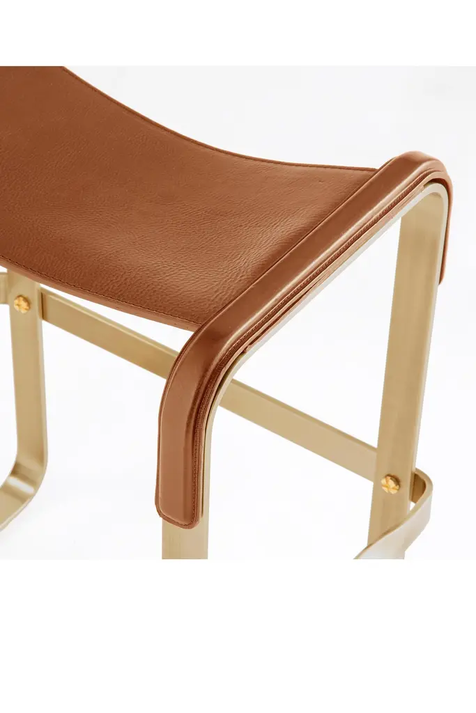 Contemporary Kitchen Counter Bar Stool Aged Brass Metal Natural Tobacco Leather