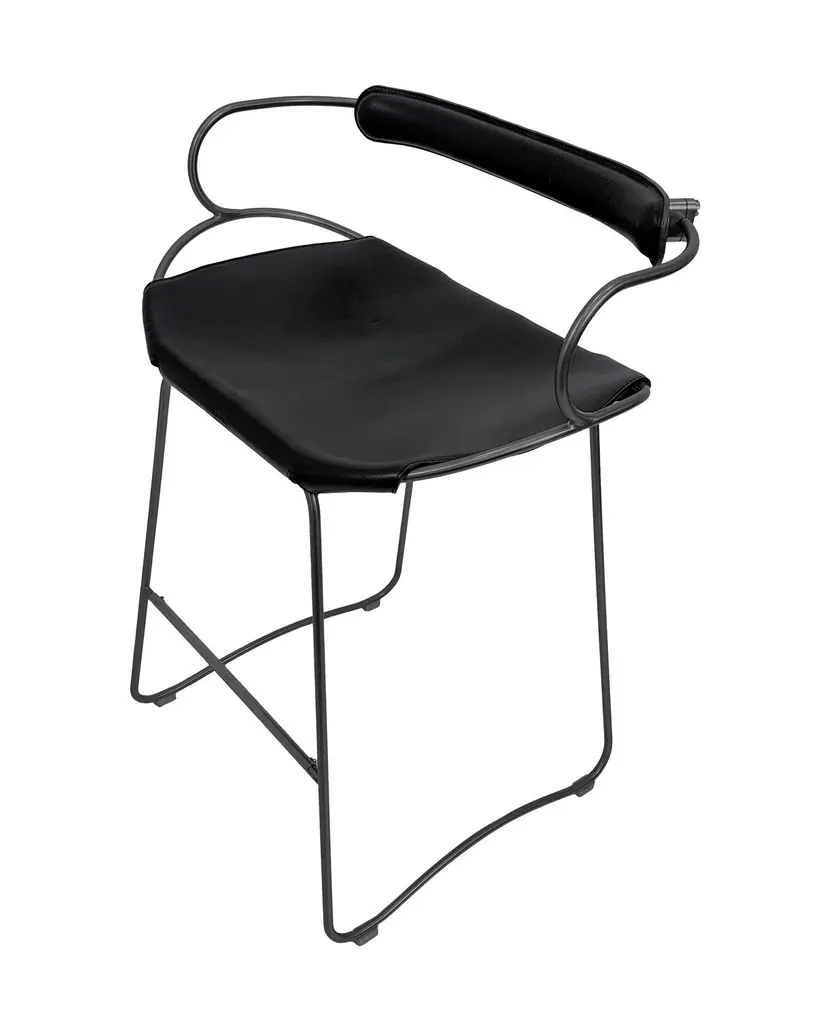 The Hug contemporary counter stool with backrest is designed and conceived with a light aesthetic, the slight oscillation of the steel rod of 12 mm is complemented by the flexibility of the double 3.5 mm thick leather. When sitting in this furniture you feel an enveloping sensation, like being hugged, since the weight of the body is distributed evenly. Each unit becomes a refuge of visual and ergonomic wellbeing.Our Hug Collection is inspired by the organic lines of a landscape, the curves of nature, and the imaginary silhouette of the wind inspire this collection of organic forms, almost like metallic sculptures. All pieces are done with cold bended steel rods, polished, nickel plated, colored by electrolysis, and lacquered. The process of polishing and lacquering the steel, goes through a manual and delicate chroming process, which gives its final and unique metal color finish. This precise technique gives a uniform metallic finish of minimum 50 microns over the entire Surface. Our metal finishing has successfully passed a corrosion resistance test in a salt spray chamber according to UNE-EN ISO 9227: 2017 and UNE-EN ISO 1456: 2010. Our signature screws are made with brass turning lathed, polished, and lacquered, these are the pieces that fix the saddle leather to the metal frame.Leathers are Spanish hides vegetable tanned. We use premium saddles in multiple colors to adjust to your taste and interior needs. This traditional vegetable dying and tanning method is an organic technique that relies on natural tannings from bark or plant tissues. The use of oils and natural fats give the leather a distinctive flexibility and texture, allowing it to be molded, retain its shape and age graciously.All skins are carefully selected from food industry, with a minimum thickness of 3.5 mm / 0,02 in, using the part of the animal's shoulder, which allows for larger pieces and uniformity, even though signature wrinkle from the animal’s neck may be recognizable. The vegetable tanning is a traditional and artisan treatment, which is respectful to the environment. Even with careful selection natural marks as a result of the contact with other animals, the age, origin and characteristics of the skin, or even the season in which the tanning takes place cannot be avoided. We still believe that these factors only add authenticity and uniqueness to every piece. Our leather parts are made with double saddles, always showing the top side of the hides that presents the better quality.Customization options.With the aim of creating customized pieces, clients can select from the various metal finishes, and leather colors to create pieces that complement their home décor. Leather colors available, black, navy, dark brown, cognac and natural tobacco, and steel polished finishing available, aged brass, black smoke and aged silver.Normally we use tone on tone threats for stitches, but client can select a contrast option, being possible to select any color to make a unique piece for the project it belongs. The finish on the edges of our leather components are sanded and hand painted. We have the option of select an alternative color if not tone on tone will be applied.Please consult in case you are interested on having a particular heat embossing stamp on the leather with your own branding.Our collections are made to full fill home spaces where to gather and enjoy great conversation with families and friends. Occasional furniture for exquisite homes, from cottages to exclusive resorts. Our product is understood as a sculptural piece of design, as an art object to be displayed at different house spaces as library, bar, living, foyer, bedroom, powder, meeting, grand or great room.The different finishes options make the furniture perfect combinations on diverse styles, from rustic mountain home, a small cottage, a ski lodge retreat, or industrial a minimalist look.