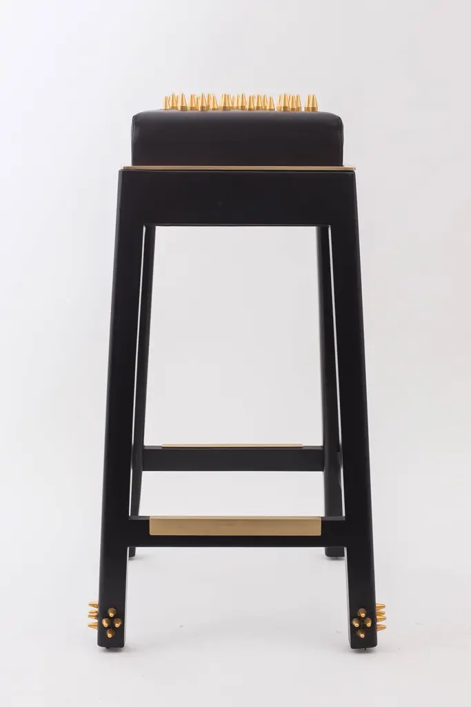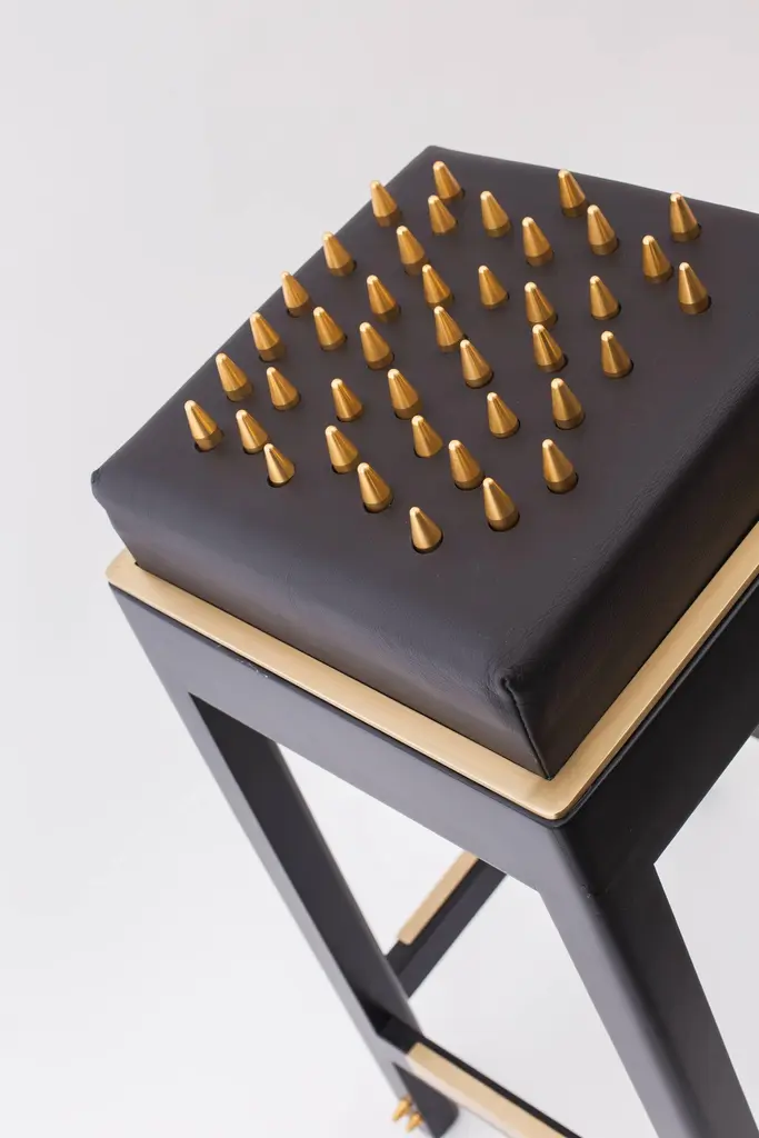 Inspired by the ancient "Chair of Nails Torture", which was studded with spikes and used by inquisitors, "Malicious" was designed to create a feeling of disturbance, hesitation and fear in users. The purpose was to see the reactions and behavior of the users towards disturbing objects.There are 41 cnc cut aluminium round-edged studs and 41 strings to allow the movement of the studs into the seat. Each stud works individually allowing the user to sit comfortably, a very pleasantly surprising sensation. To complete the rough and rock and roll look of the "Malicious", black matte finish is used on wood, the metal studs are painted gold and black leather is used for the upholstery.