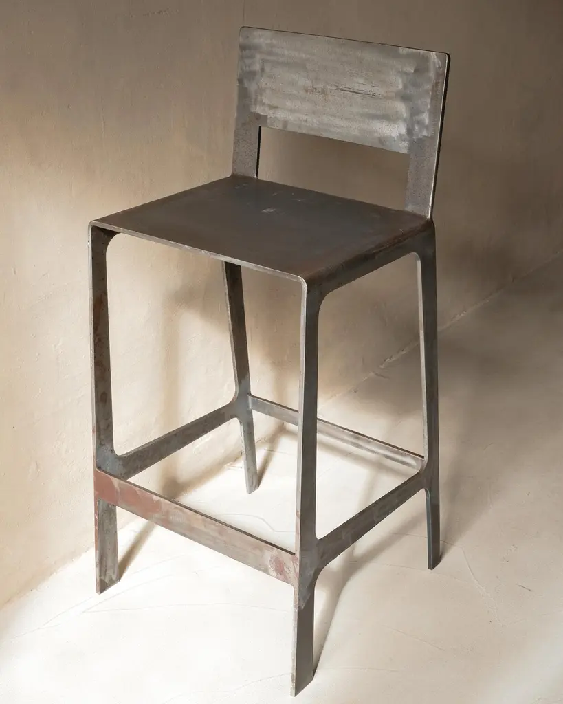 Contemporary Naturally Patinated Steel Bar Stool With Backrest By Dennis Kaiser