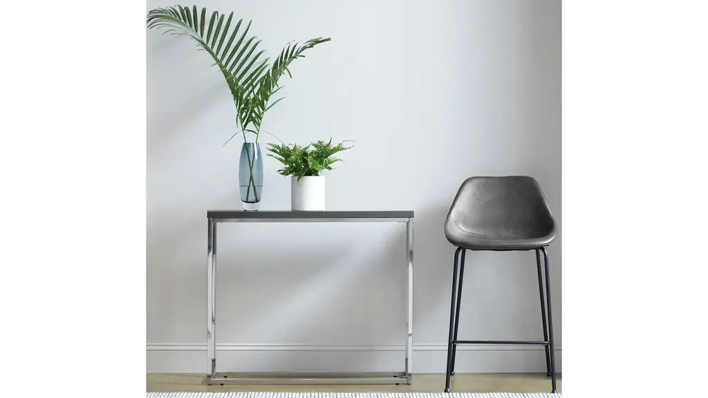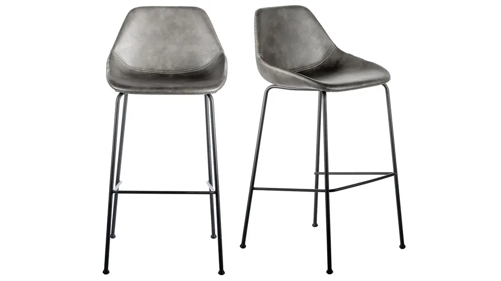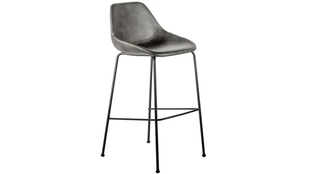 The Corinna Bar Stool combines a rich, distressed leatherette seat and back with a contemporary silhouette. This stylish and versatile stool has baseball stitching accents on the seat and a strong and flexible base is made of solid round matte black steel.