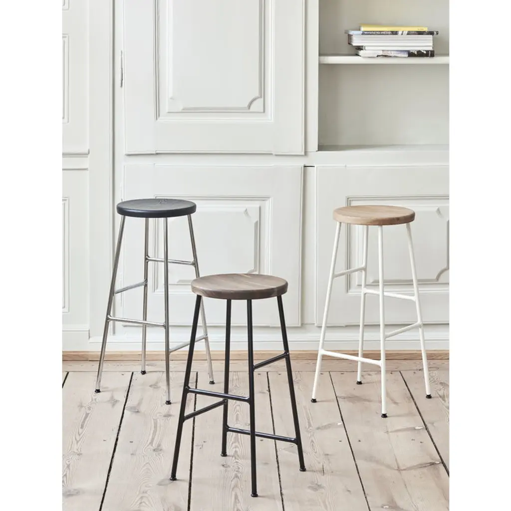 HAY’s Cornet is a sleek bar stool whose frame was inspired by steel tube technique used in bicycle racks. The horizontal steel tubes of the frame have been placed into different heights, giving the chair an interesting asymmetric look and sturdy footrest for all heights of people. The geometric design of Cornet is perfected with a round wooden seat. Designed by Jonas Trampdach, Cornet bar stools bring a fresh touch of modern Danish design for bar tables, kitchen islands and worktops in both private and public surroundings.
