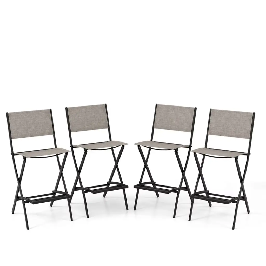 Introducing our outdoor bar stool set, perfect for enhancing your outdoor spaces. Crafted with high-quality & sturdy fabric, these bar stools are designed for both comfort & longevity. The fabric is resistant to fading, tearing & wear, ensuring that your stools will stay in fantastic condition for years to come. With their sprayed metal frame, these bar chairs are rustproof & stable for safe using, delivering reliable support for weights up to 330 lbs. To protect your floor, each stool is fitted with anti-slip foot pads. Their spacious seats & convenient folding footrests ensure a cozy & ergonomic seating experience. Quick & hassle-free folding allows for easy storage & portability. From gardens to decks, poolside areas to balconies, these versatile stools are sure to impress. Elevate your outdoor gatherings with this sturdy & stylish bar stool set.FeaturesHigh-quality fabric is easy to dry, tear-proof, non-fading & breathable Spacious seat is roomy to make you sit more comfortably Folding footrest to hold your legs for relaxation & balance Sprayed metal tubes are sturdy & rustproof during the long-term use Anti-slip foot pads to avoid accidental slipping for safety Designed to be lightweight for easy portability to different occasions Easy & quick folding to realize convenient & compact storage Needs no assembly, saving you a lot of time & effortColor: Blue/Coffee Material: Fabric, Metal Unfolded Size: 18'' x 22.5'' x 40'' (L x W x H) Folded Size: 18'' x 4'' x 45.5'' (L x W x H) Size of Backrest: 18'' x 15.5'' (L x H) Size of Seat: 16.5'' x 16''(L x W) Height of Seat: 28'' Height of Footrest: 11'' Max Load Capacity: 330 lbs Net Weight: 11 lbs Package Includes: 4 x Bar Stools