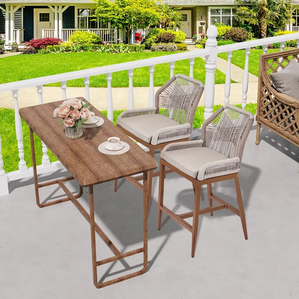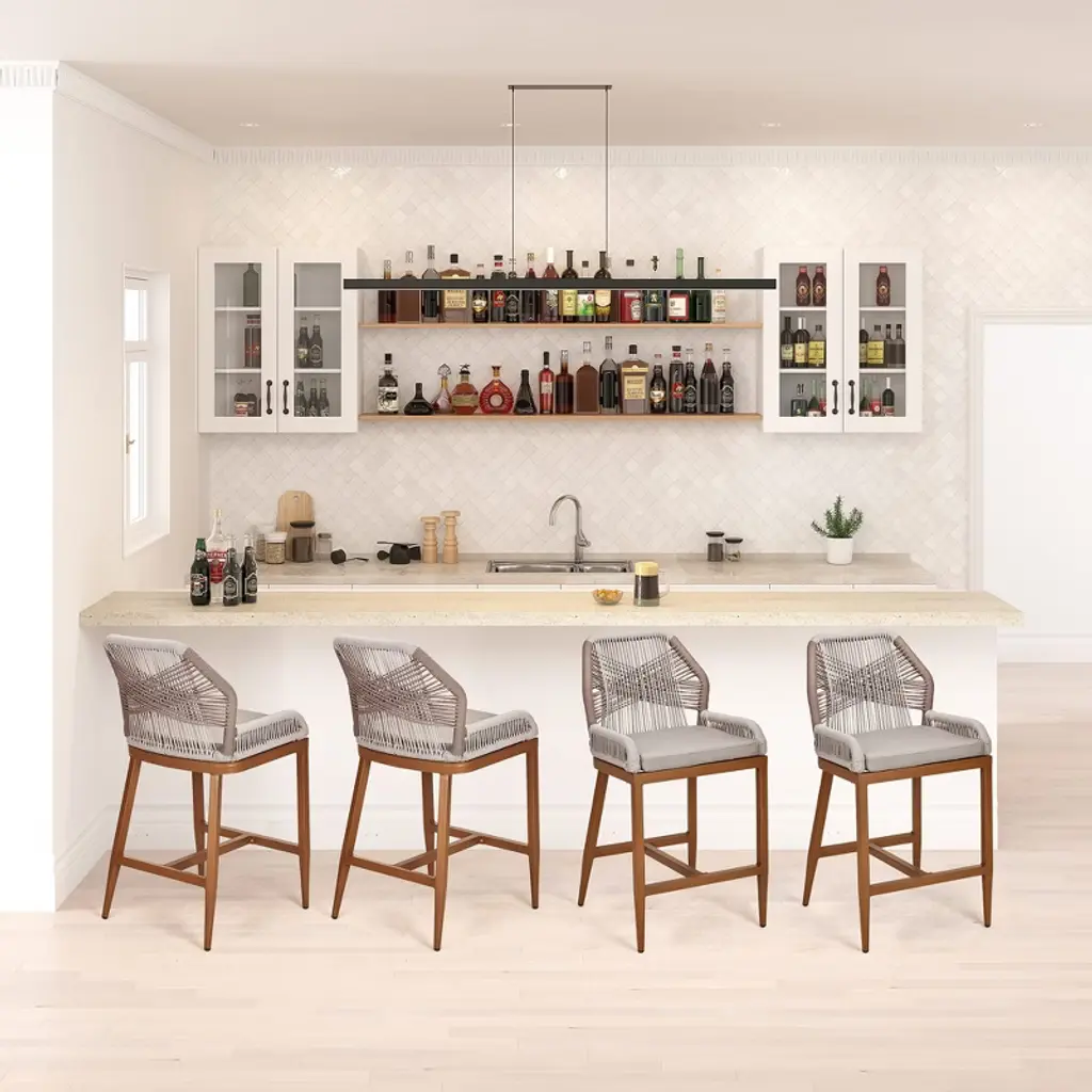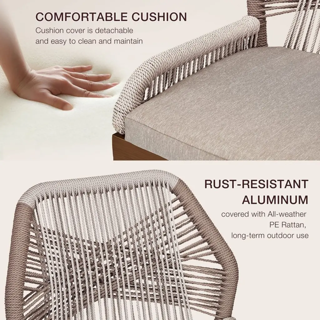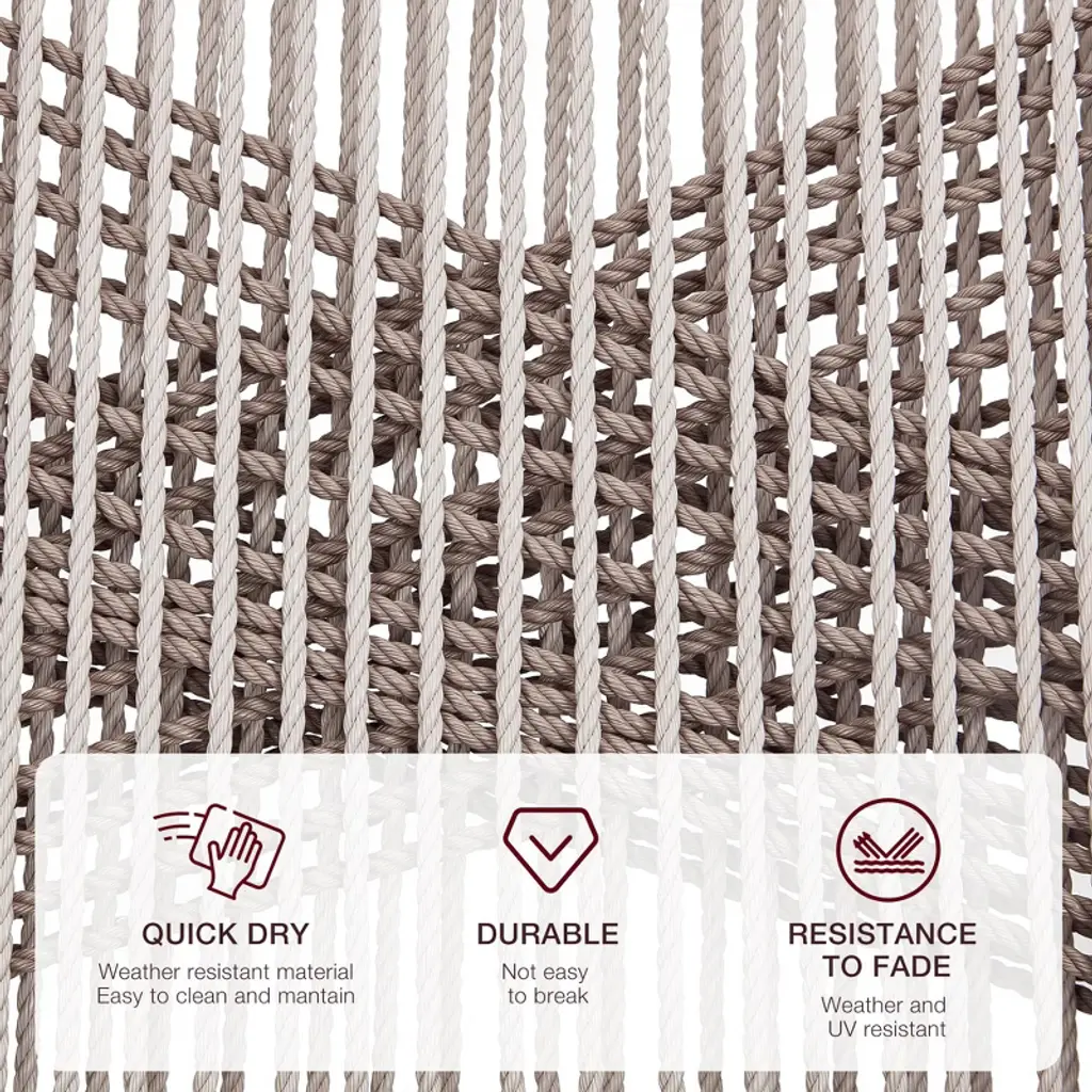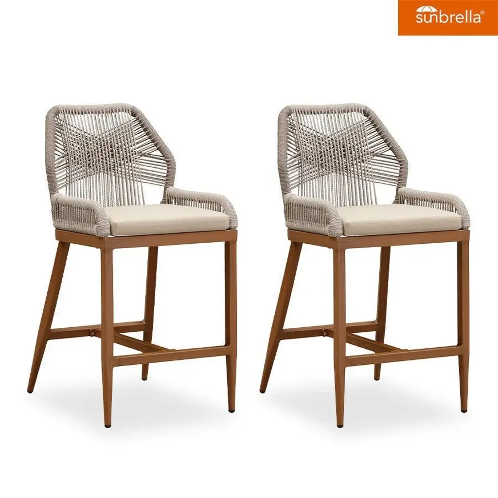 Enhance your outdoor living space with this stylish set of 2 Counter Height Bar Stools, designed to blend modern aesthetics with exceptional durability. Crafted from high-quality weather-resistant Textilene rope, these stools are built to withstand the elements, including wind, rain, and sun exposure, ensuring long-lasting use on your patio, deck, or outdoor bar area.The stools feature an eye-catching cross-weaving design in a subtle mix of beige and grey, adding a contemporary touch to your outdoor decor. The ergonomic backrest and armrests provide excellent support, helping to relieve pressure on your spine for comfortable seating. Each stool includes a detachable cushion made from wear-resistant, tough fabric that is easy to clean and maintain, making relaxation effortless.With dimensions tailored for outdoor bars or high-top tables, these stools stand approximately 39.5 inches tall with a seat height of 24.8 inches, accommodating users up to 350 pounds. The sturdy construction guarantees a safe and stable seating experience.Assembly is straightforward and user-friendly, with all necessary hardware and clear instructions included. Even if you have minimal DIY experience, you can expect to have your stools ready in about 20-30 minutes.