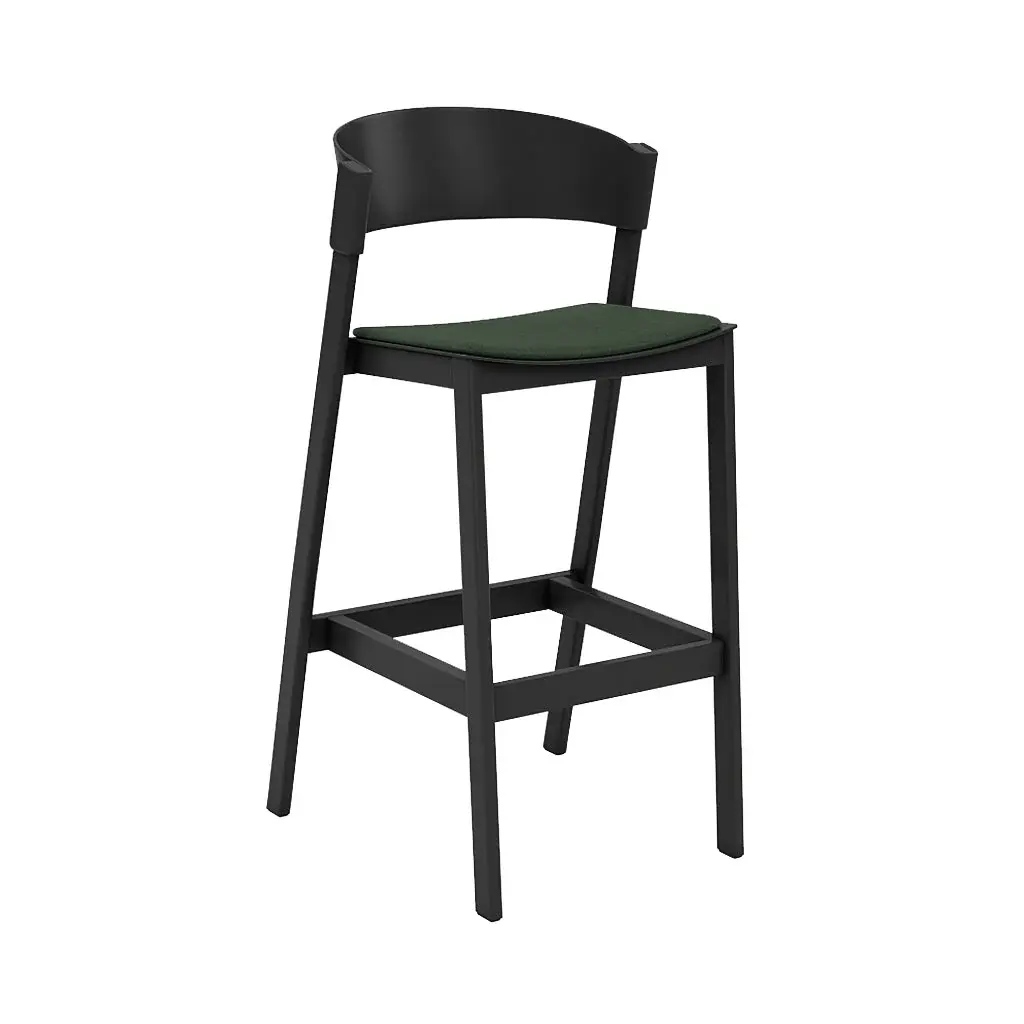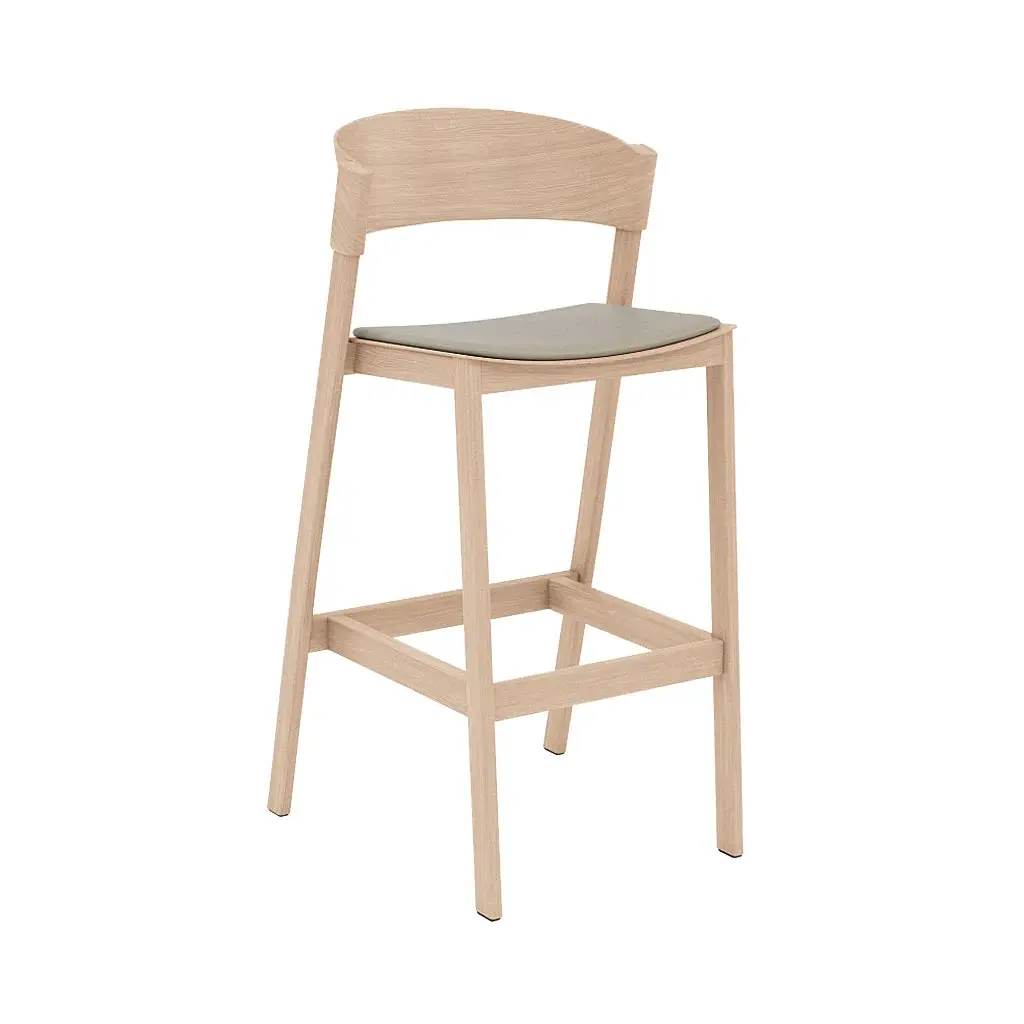 A slim upholstered seat brings added comfort and an avenue for customization to designer Thomas Bentzen's refined oak bar stool. Cover also reflects Scandinavian finesse with its tall enveloping backrest that wraps around the legs, in lightweight but sturdy molded veneer. Available with or without the footrest, the stool offers lacquer-finish options in natural and brown stain or a black painted version to complement the wide range of textile and leather options for the seat covering.