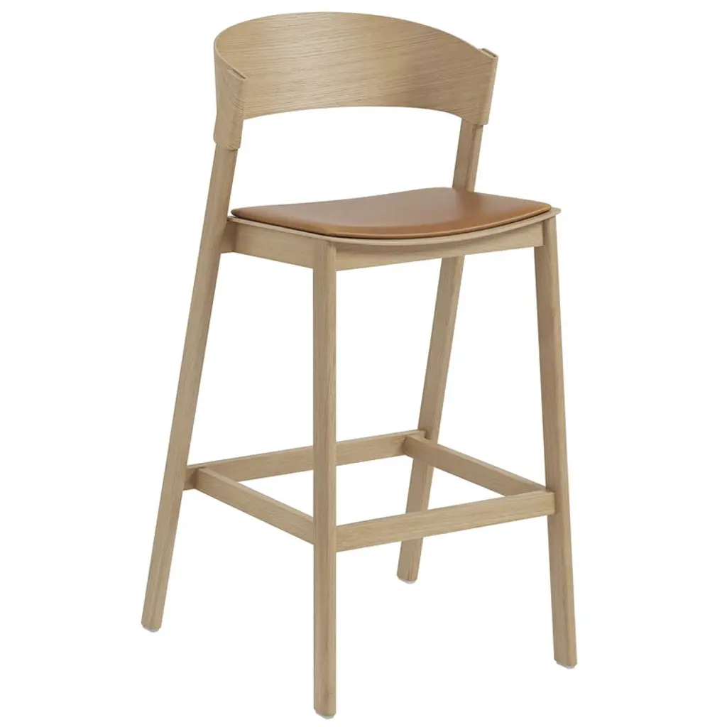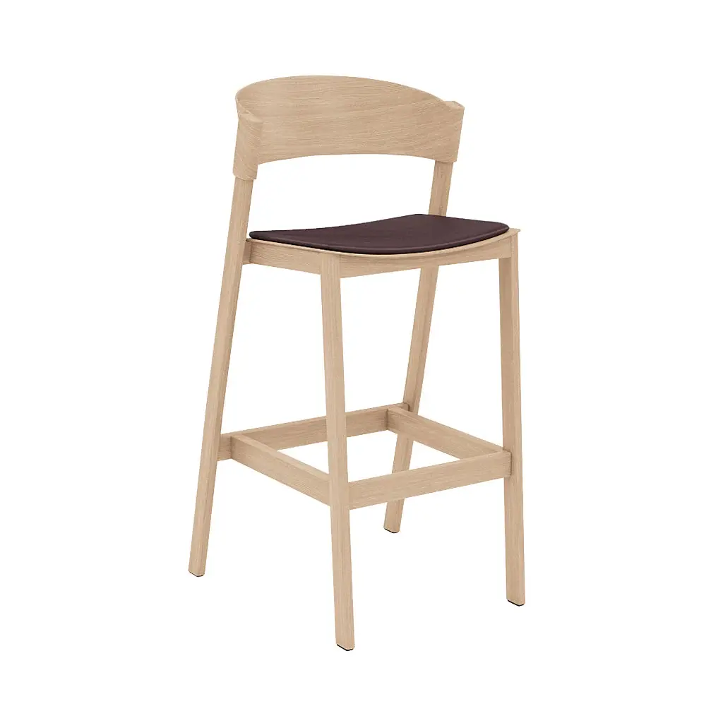A slim upholstered seat brings added comfort and an avenue for customization to designer Thomas Bentzen's refined oak bar stool. Cover also reflects Scandinavian finesse with its tall enveloping backrest that wraps around the legs, in lightweight but sturdy molded veneer. Available with or without the footrest, the stool offers lacquer-finish options in natural and brown stain or a black painted version to complement the wide range of textile and leather options for the seat covering.