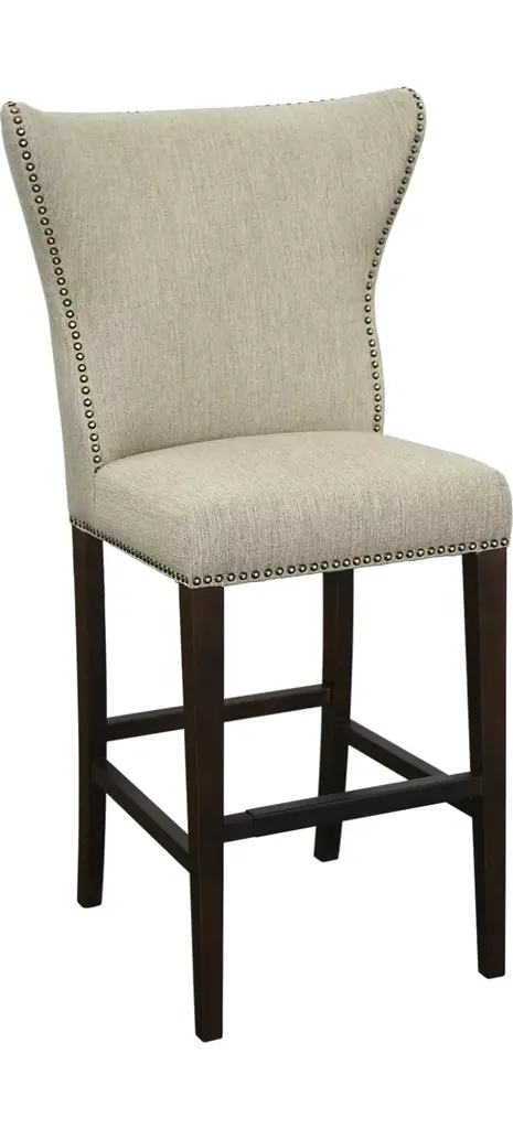 Give your dining a touch of casual elegance with the Cream Chenille 24" Parsons Barstool from Anji Chaiming Furniture. Its stylish cream chenille upholstery, large patinaed brass nail head trim, and dark finished legs give this counter height Parsons barstool a designer look that is sure to coordinate with a variety of decor.