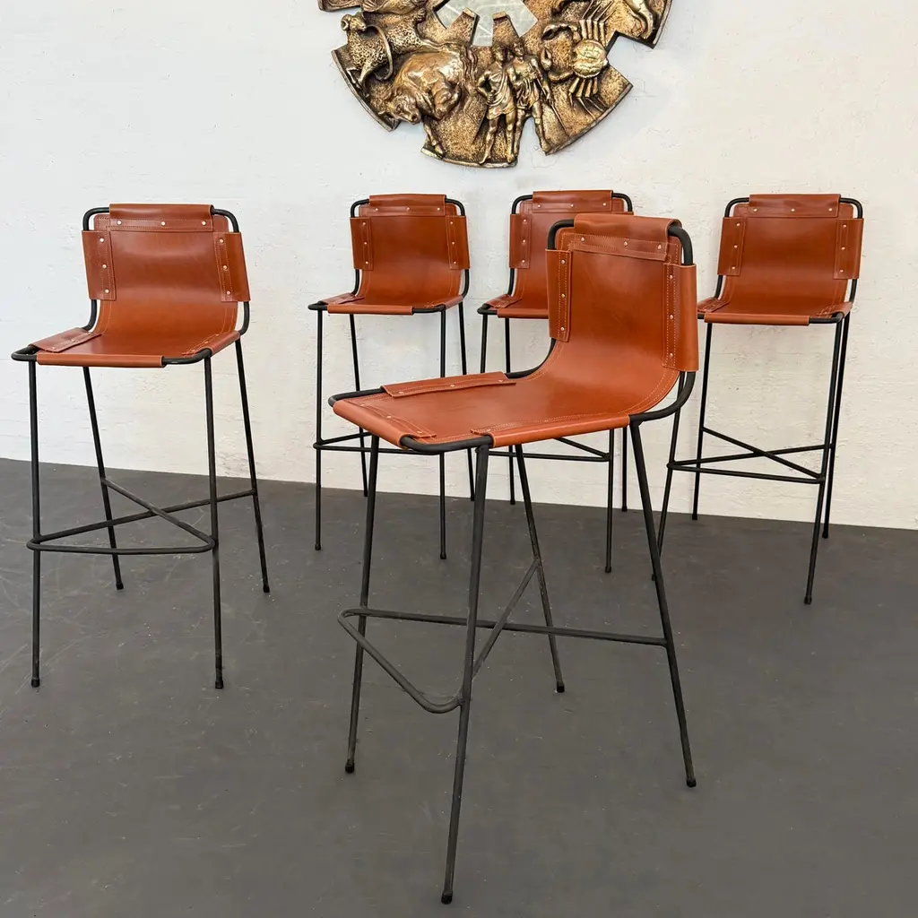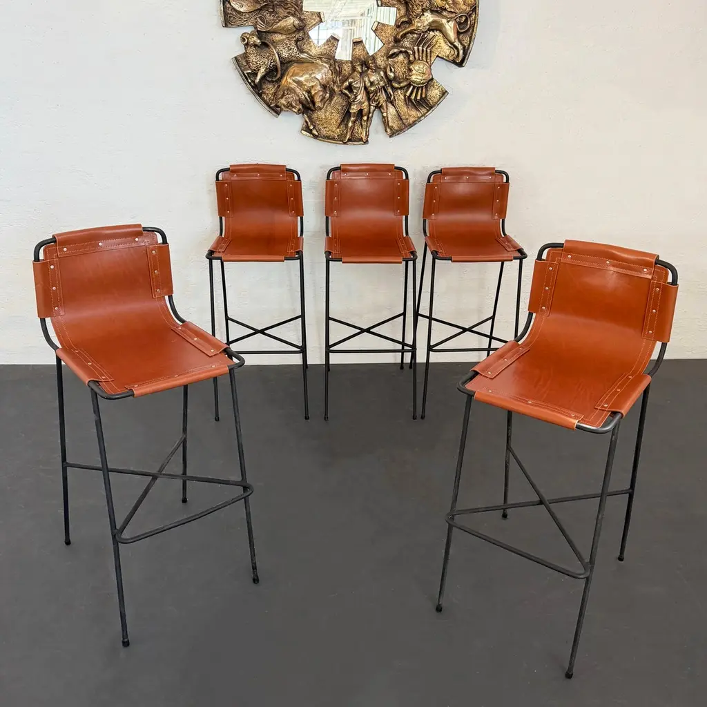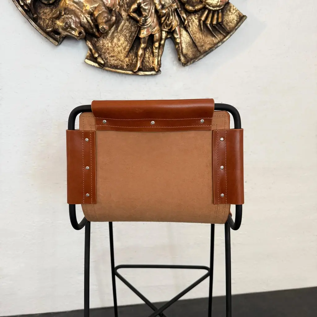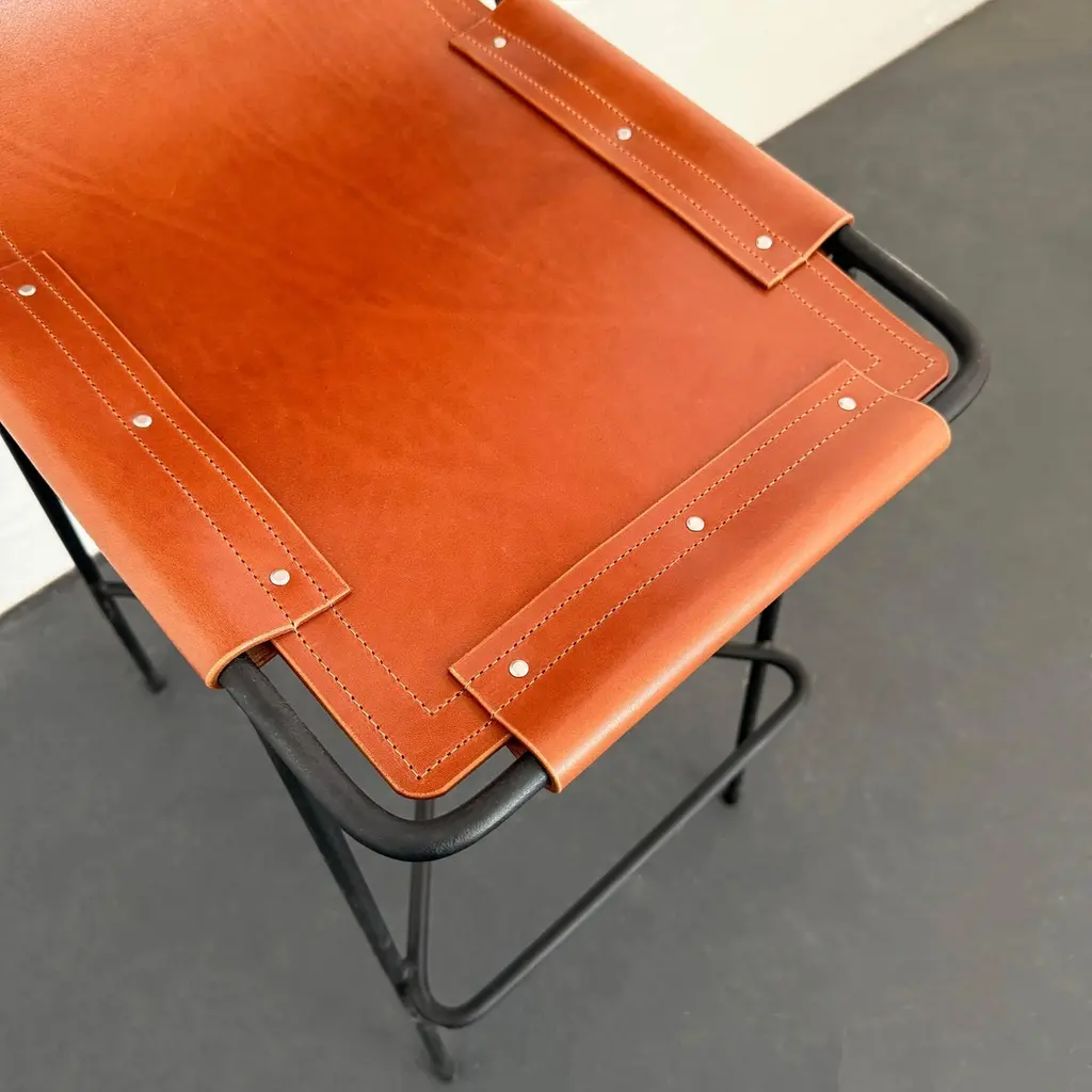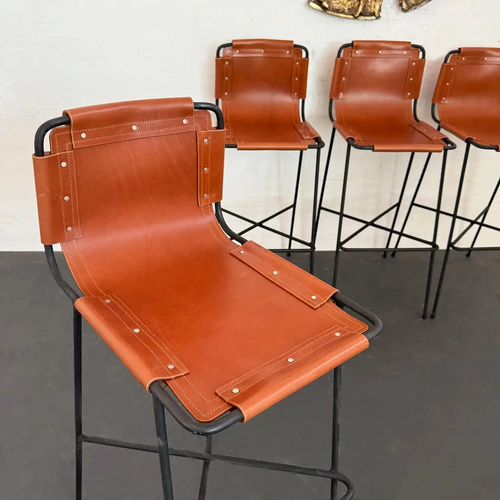 Architectural inspiration and mixed materials give our limited edition, cFsignature leather and wrought iron bar stool a clean, modern, industrial aesthetic. The slim black wrought iron frame plays with scale with a slung back elongated seat lending comfort and an unexpected profile. The seat is upholstered in thick hand-cut, lugguage tan leather with saddle stitching and rivet details. The footrest is 12.5 inches height. The stool is a limited edition. There are 5 stools available, priced individually.