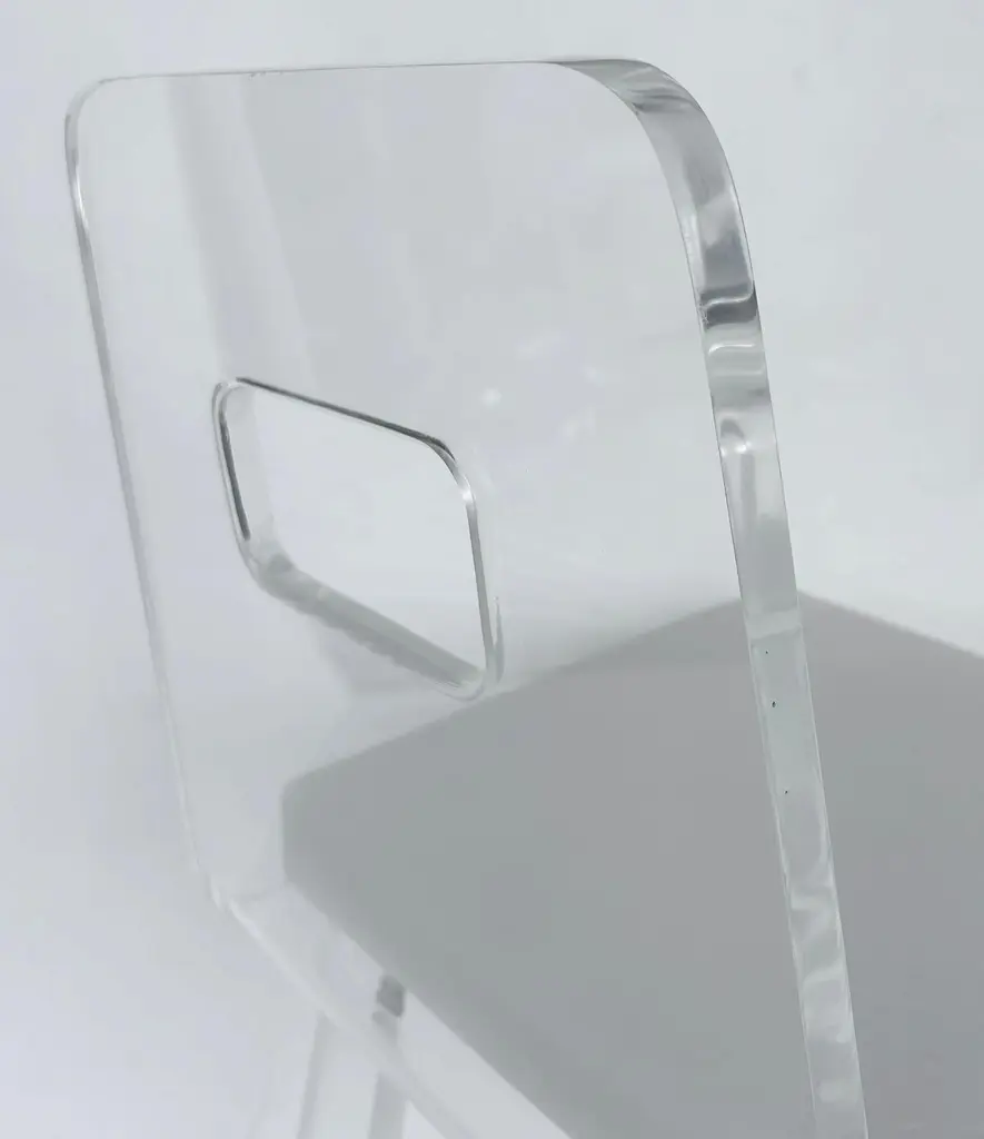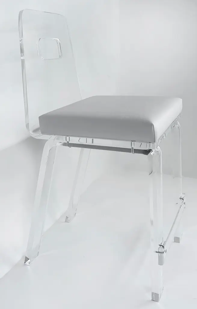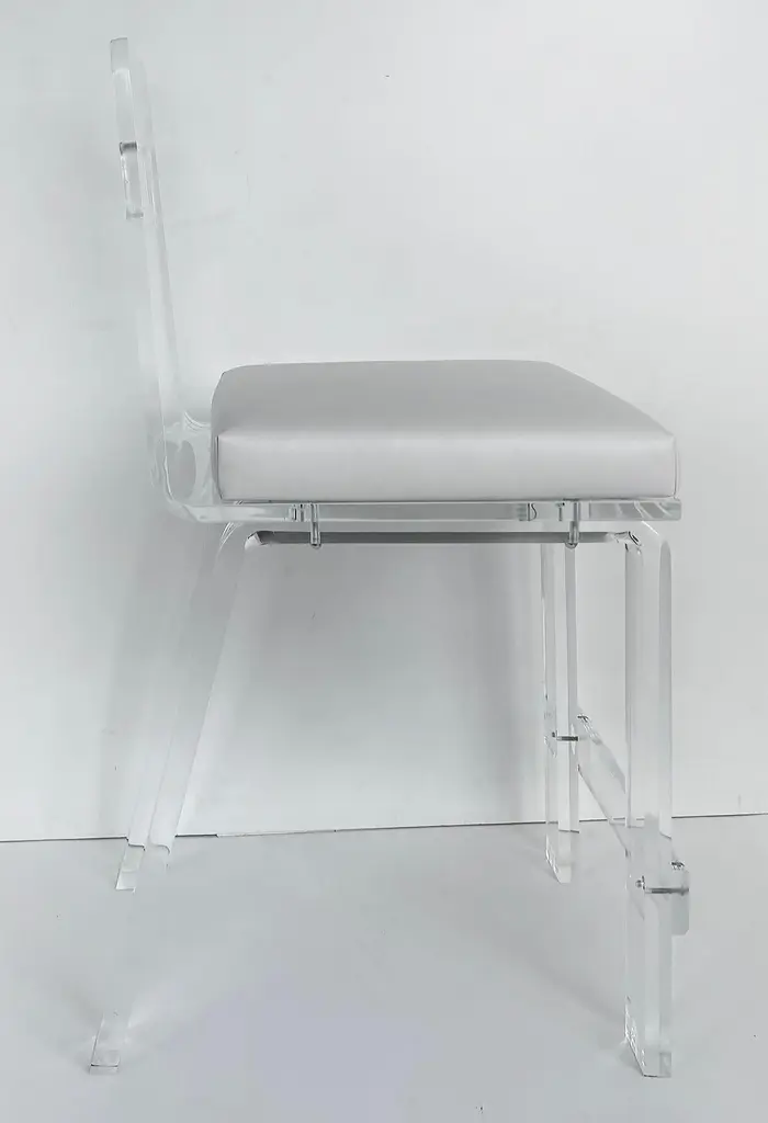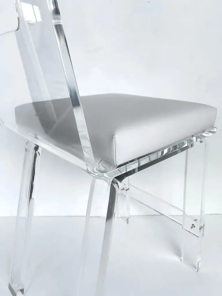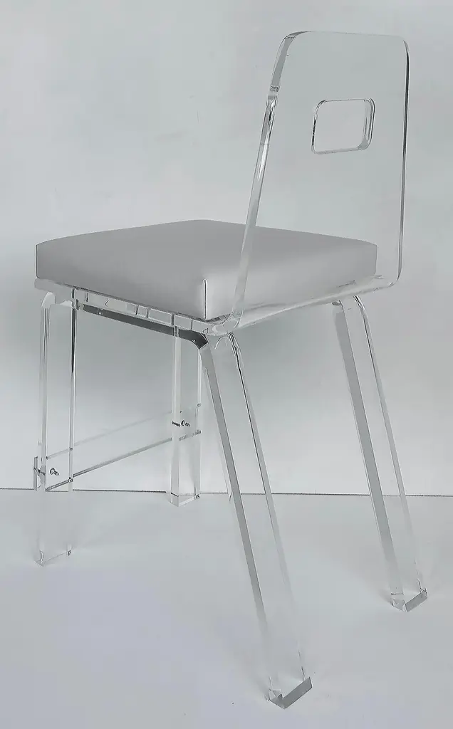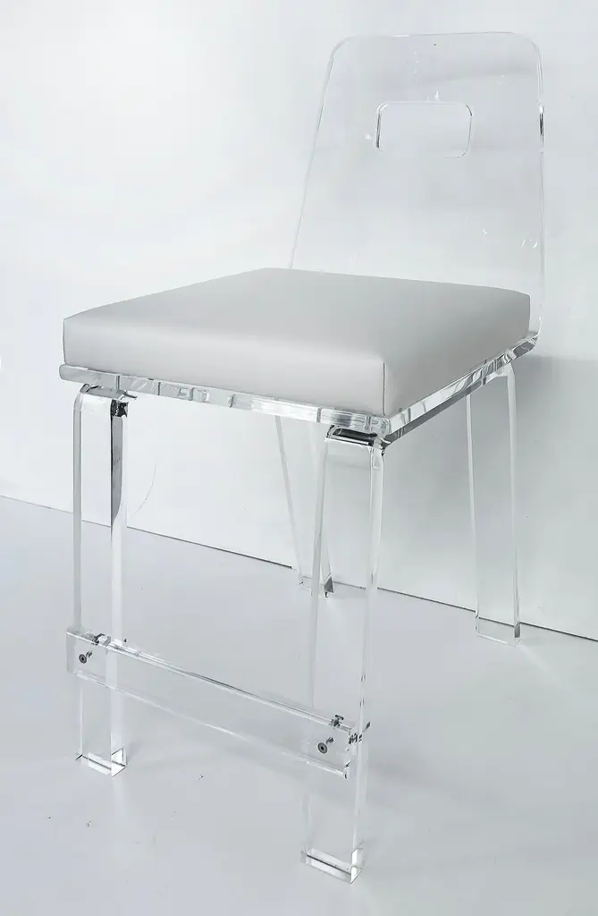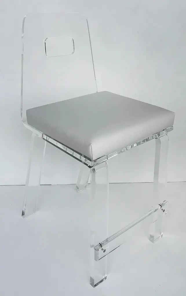Custom Made Lucite Bar or Counter Stool with Upholstered Seat, Made to OrderOffered for sale is a custom made Lucite counter height bar stool with an upholstered seat cushion. The chair itself is 3/4" thick Lucite. The legs are 1" thick Lucite and the upholstery can be done with different fabric or customer's own material. We show this counter stool as a sample with the base price for vinyl upholstery in the counter height. These stools can be made as bar stools, counter stools, or chairs. The production time is 2-3 weeks depending on the quantity and size of the order.Please contact us for pricing on the taller bar height stools or for any other custom inquires.