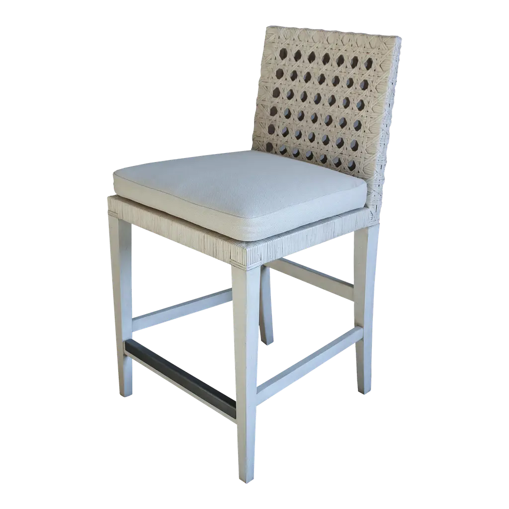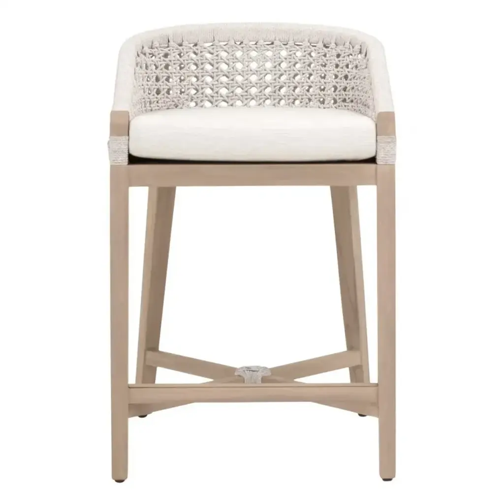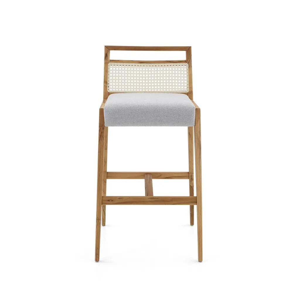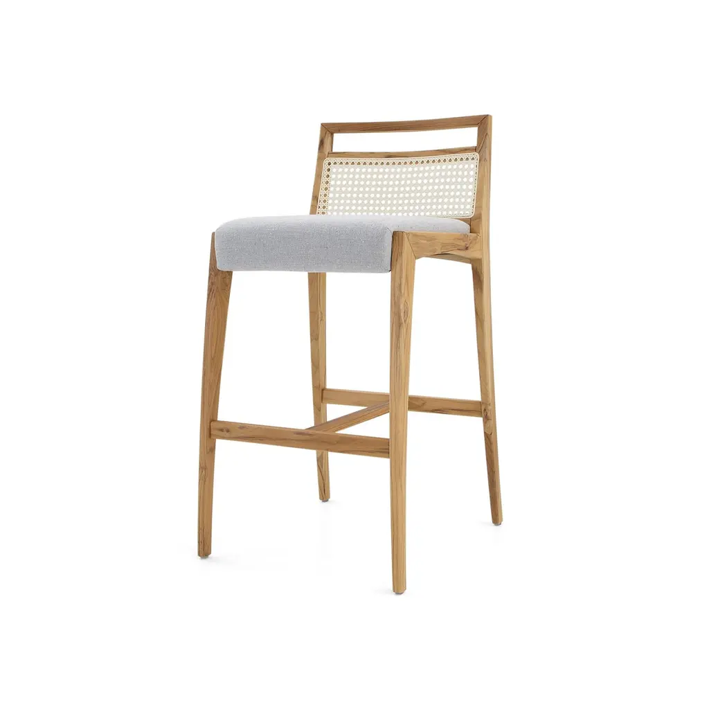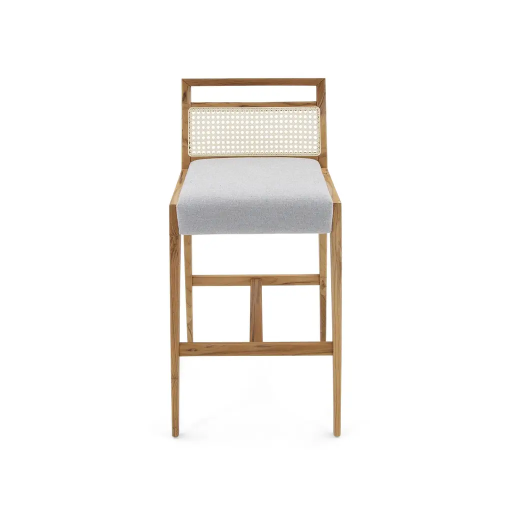 A Sotto teak wood bar stool designed by Uultis Studio with gray fabric upholstered seat and cane back. Please check availability prior to purchase.The Sotto bar stool is a refined blend of natural materials and modern craftsmanship, designed to enhance both residential and commercial spaces. Constructed with a sturdy teak wood frame, this stool exudes warmth and organic beauty, making it a seamless fit for contemporary, mid-century, or rustic interiors. Its natural cane backrest adds a touch of artisanal craftsmanship, allowing for both aesthetic charm and breathable comfort. Paired with a softly upholstered gray fabric seat, it ensures a comfortable experience, supported by medium-density foam for lasting ease. Please note that teak has natural variations, therefore each piece with be very unique. The teak wood will receive a teak touch finish, that is matte and velvety. It has a wood feel. Designed for versatility, the Sotto bar stool is ideal for kitchen islands, home bars, or high-top dining areas. Its ergonomic proportions and supportive backrest make it suitable for casual meals, entertaining guests, or extended seating in a workspace. The clean lines and timeless materials make it adaptable to a variety of design aesthetics, from coastal to modern farmhouse. For added flexibility in different spaces, the Sotto is also available as a counter stool.Perfect for both home and commercial use, this bar stool is as practical as it is elegant. Arriving fully assembled, it is ready to elevate any space with its sophisticated yet natural presence.