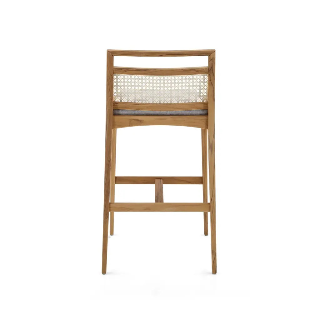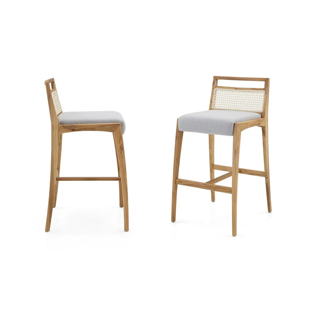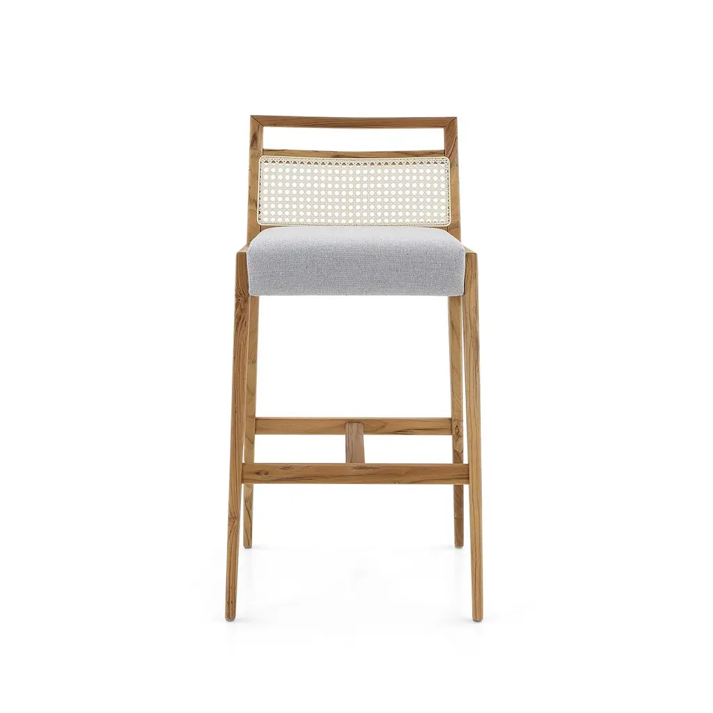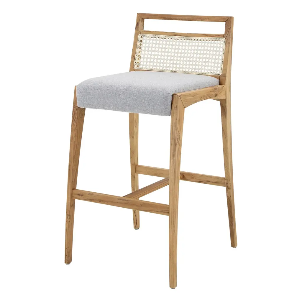 Customizable Teak Wood Bar Stool With Cane Back And Gray Seat - Sotto Line