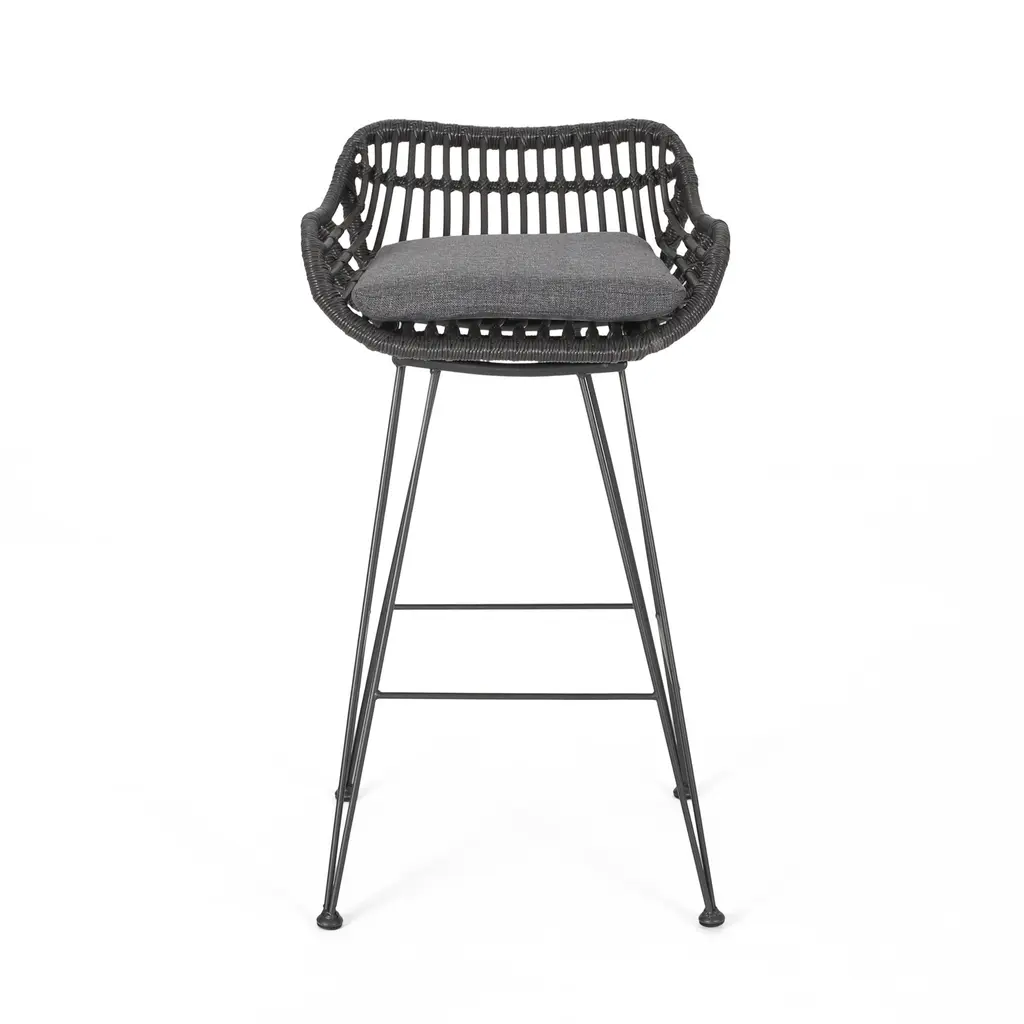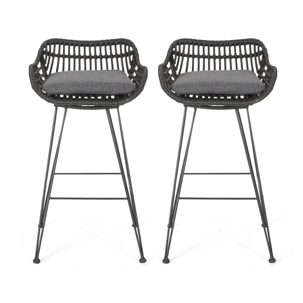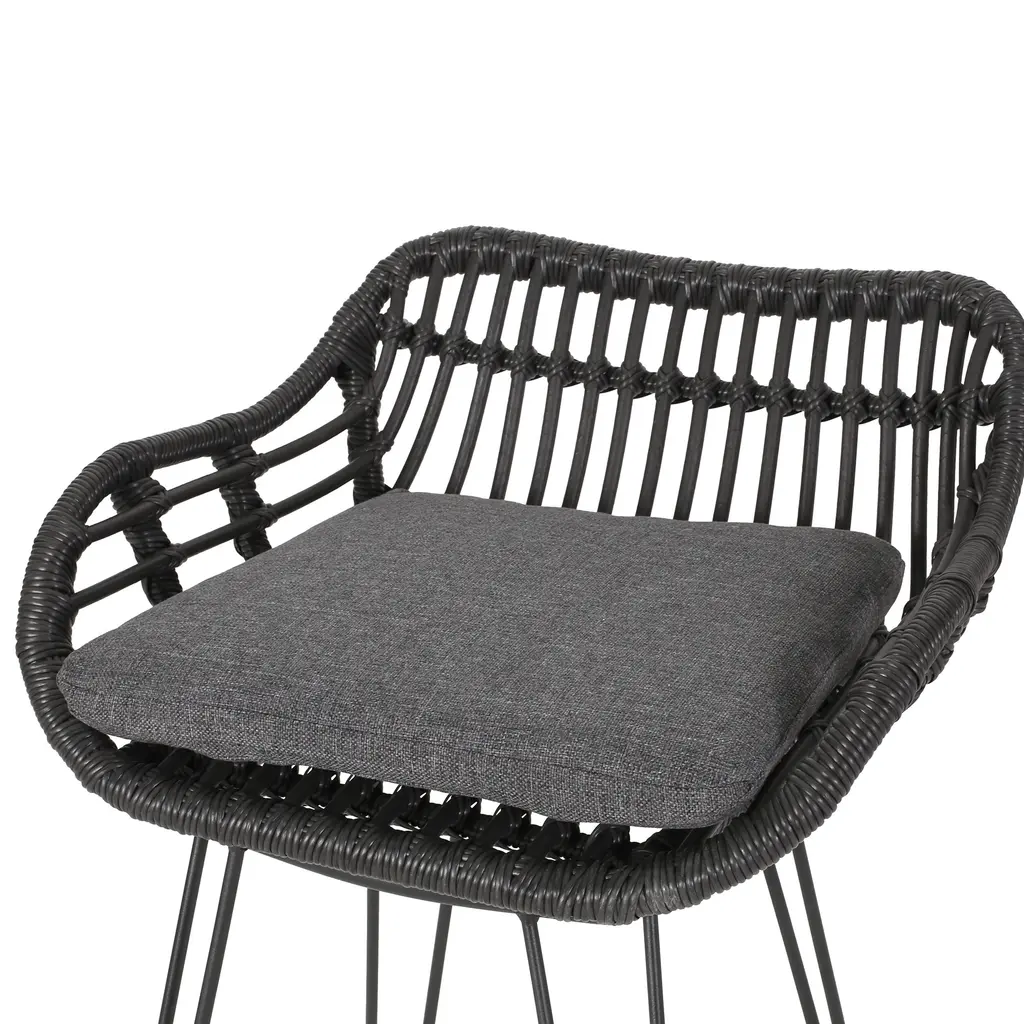 Give your outdoor space an exclusive feel with a sensible and stylish bar stool set. Featuring a delightful hand-wrapped look, our bar stool set provides a timeless style to your home while providing ultimate comfort. This set of stools consists of a metal frame and rattan material, bringing a modern twist to a classic look that is ideal for any style of decor. With a thin angled frame, this charming bar stool set also provides a minimalistic yet durable structure that offers a stylish flair to your space. MODERN: With clean lines contrasted perfectly by its round edges, our rattan bar stool is the ideal modern accessory for your outdoor space. Finished with thin angled legs, this stool not only has a sleek, minimalistic look but also provides a stable structure. POLYETHYLENE RATTAN: Featuring a long-lasting woven seat, this style is not only incredibly durable but also provides a versatile appearance. The handcrafted details of this material allow this piece to blend seamlessly with your outdoor decor. WATER-RESISTANT CUSHIONS: Our cushions are covered with a non-porous material that makes cleaning any spill a breeze. Please note that these cushions are water-resistant and not waterproof. Please do not submerge in water. BARSTOOL HEIGHT: This stool has a seat height of 28.75 inches, making this perfect for a backyard bar or a bistro bar set. Features:Options:Dimensions:Assembly required