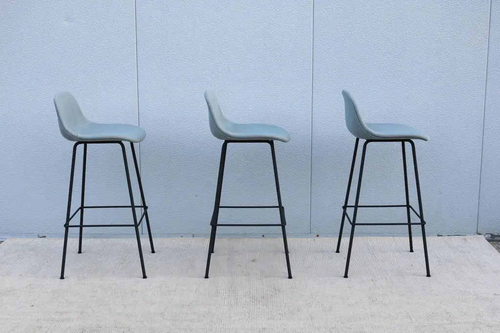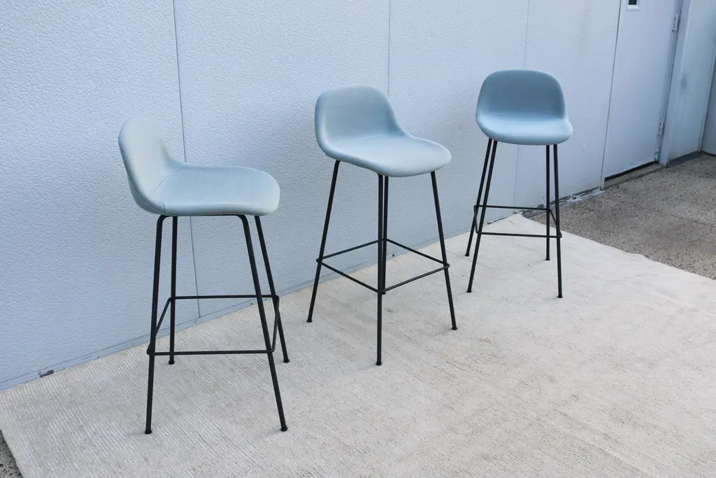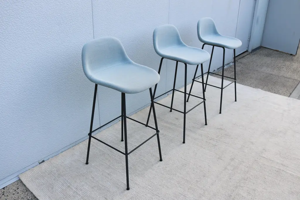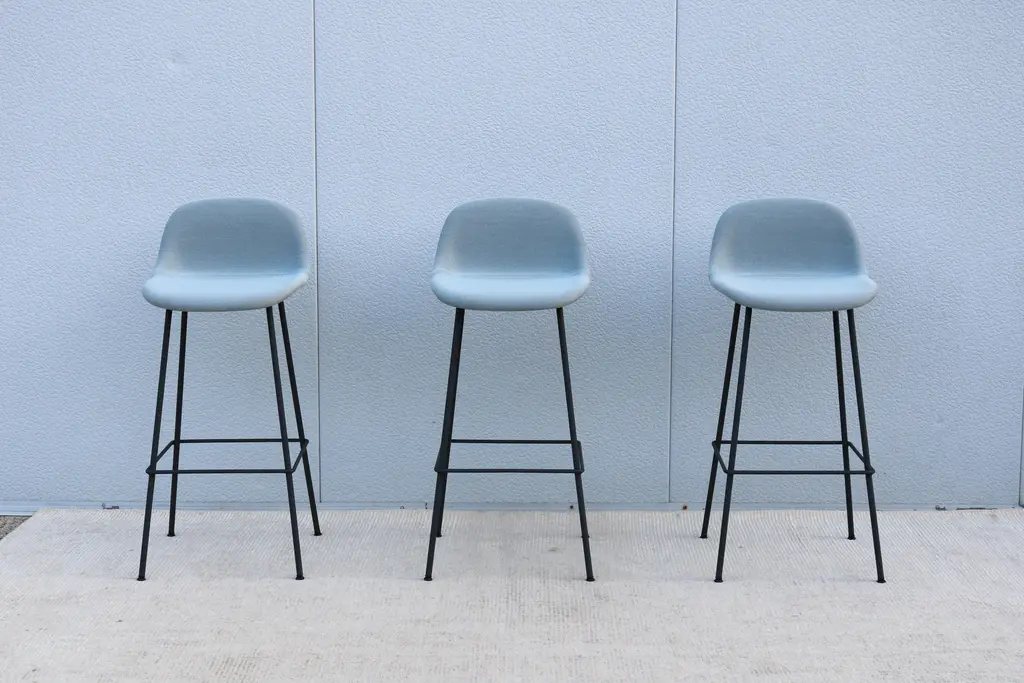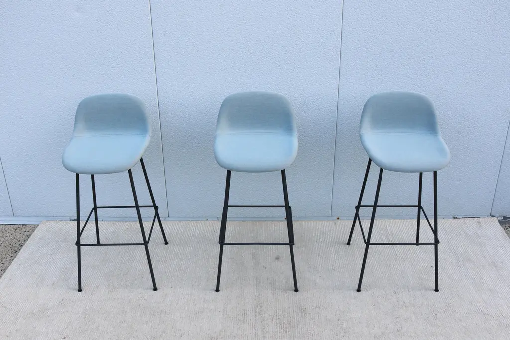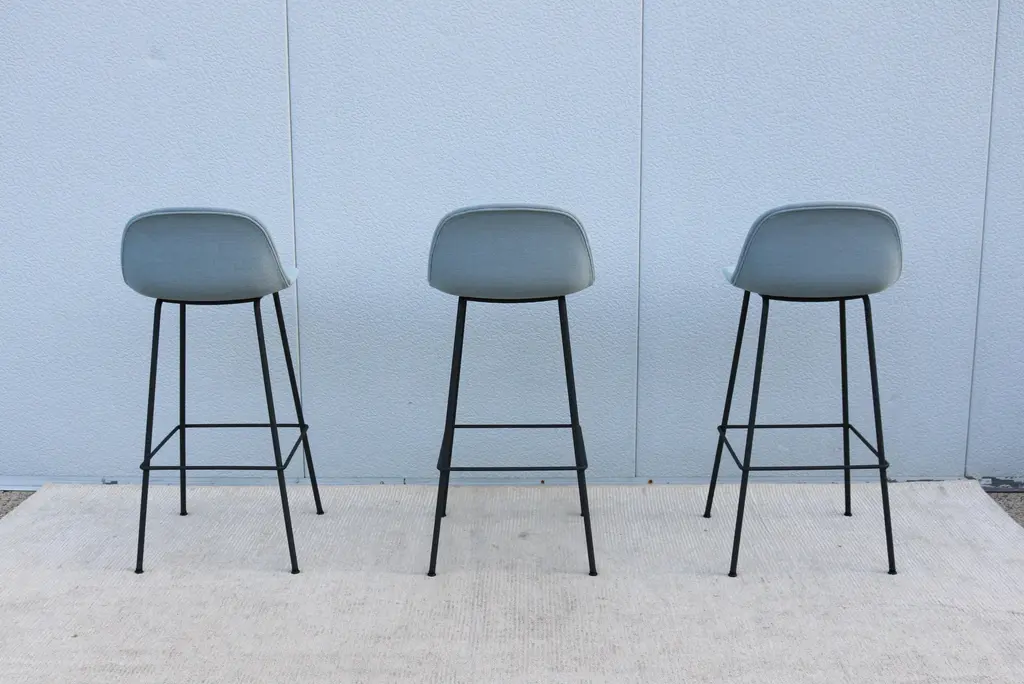 Fabulous set of 3 Fiber bar stools by Copenhagen-based design duo Iskos-Berlin for Muuto. These elegant Fiber Bar height stools feature a seat and backrest with embracing curves that provide extensive comfort to their users while taking up little space in the room. Distinguished by its iconic shell, generous seat and slender steel frame, creates an intriguing geometric silhouette. The stool's seat is made from a wood fiber composite, giving the design a unique expression and tactile texture. It's stylish and functional and will integrate simply and cleanly with any space. Please note I have 6 stools available, selling them in a set of 3 (the price listed is for three stools) Specification: The seat and backrest are fully upholstered in wool blend bright blue fabric. The tube base is made of bent, welded steel, powder-coated anthracite black. Self-leveling black plastic glides. Style: Danish Modern Model: Fiber Bar Stool. Designed by: Iskos-Berlin, a Copenhagen-based design studio, formerly known as Komplot Design. Manufacturer: Muuto Year manufactured: 2024 Made in: Denmark and Poland. Authentic, have the manufacturer's labels attached beneath the seat. Dimensions: Height 38.5" x Width 17.5" x Depth 18.3" x Seat height 29.5" x Seat width 17" x Seat depth 16.3" x Back height 9" x Weight approx. 14 lbs.