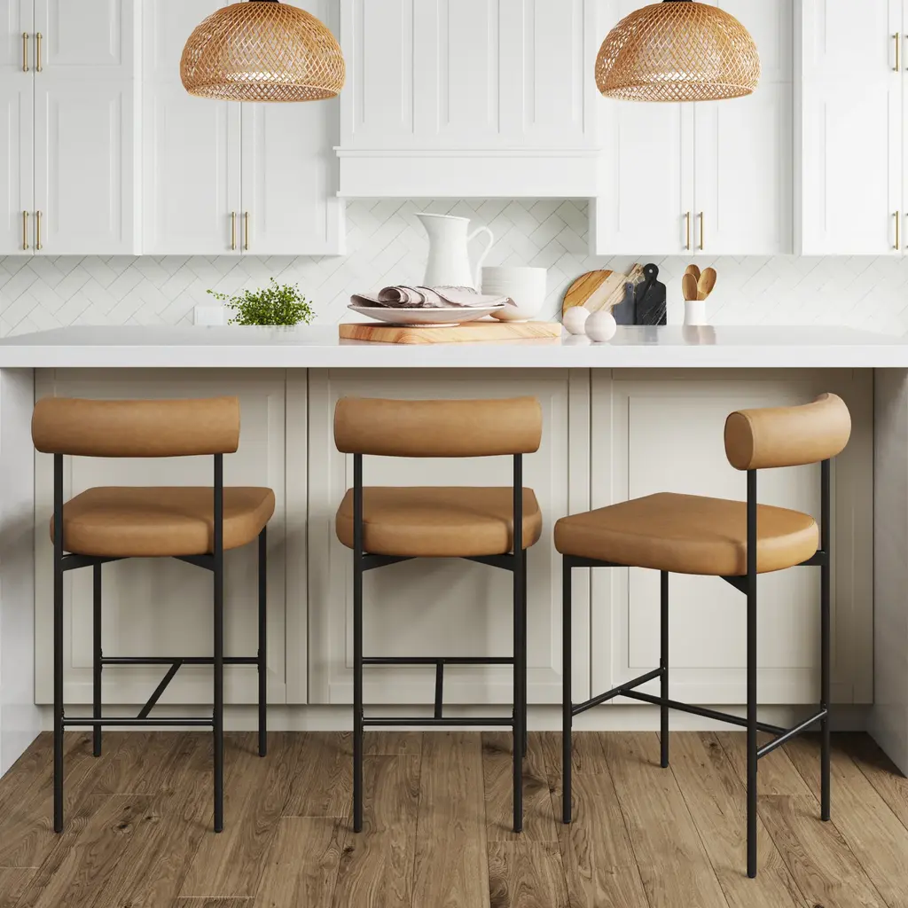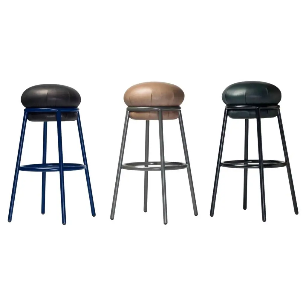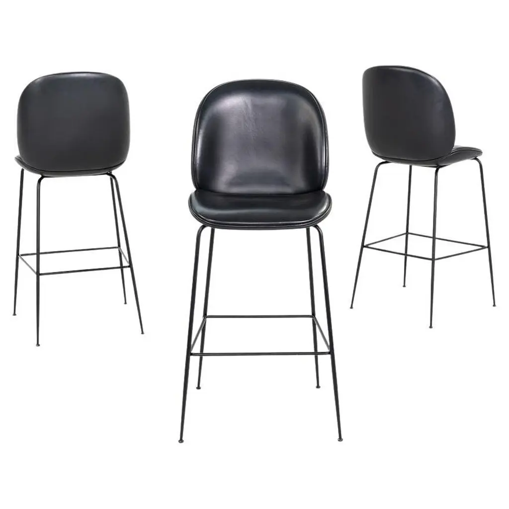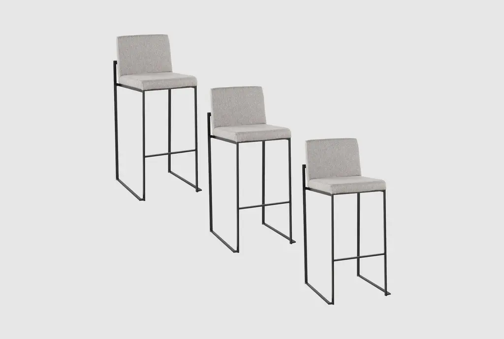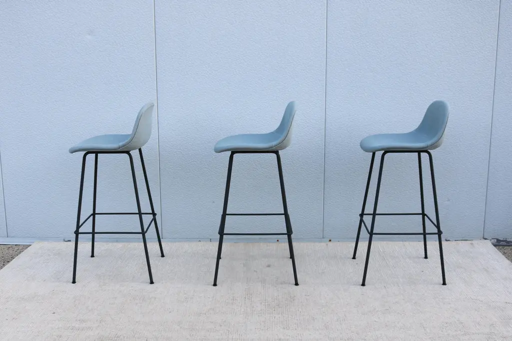 Fabulous set of 3 Fiber bar stools by Copenhagen-based design duo Iskos-Berlin for Muuto. These elegant Fiber Bar height stools feature a seat and backrest with embracing curves that provide extensive comfort to their users while taking up little space in the room. Distinguished by its iconic shell, generous seat and slender steel frame, creates an intriguing geometric silhouette. The stool's seat is made from a wood fiber composite, giving the design a unique expression and tactile texture. It's stylish and functional and will integrate simply and cleanly with any space. Please note I have 6 stools available, selling them in a set of 3 (the price listed is for three stools) Specification: The seat and backrest are fully upholstered in wool blend bright blue fabric. The tube base is made of bent, welded steel, powder-coated anthracite black. Self-leveling black plastic glides. Style: Danish Modern Model: Fiber Bar Stool. Designed by: Iskos-Berlin, a Copenhagen-based design studio, formerly known as Komplot Design. Manufacturer: Muuto Year manufactured: 2024 Made in: Denmark and Poland. Authentic, have the manufacturer's labels attached beneath the seat. Dimensions: Height 38.5" x Width 17.5" x Depth 18.3" x Seat height 29.5" x Seat width 17" x Seat depth 16.3" x Back height 9" x Weight approx. 14 lbs.