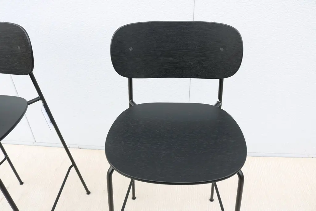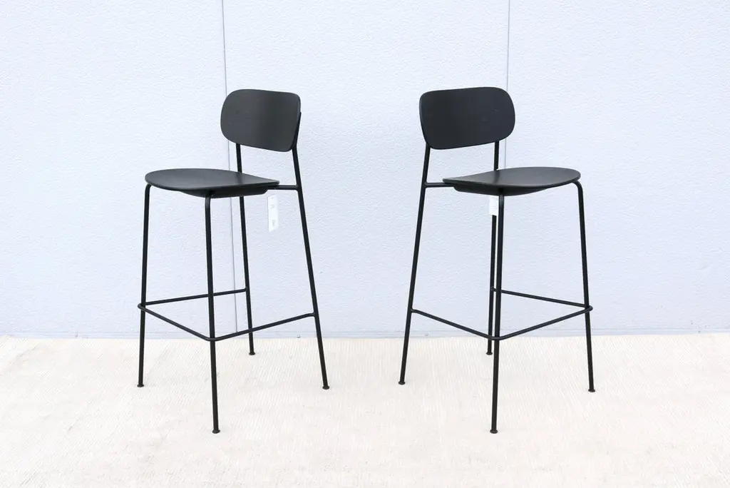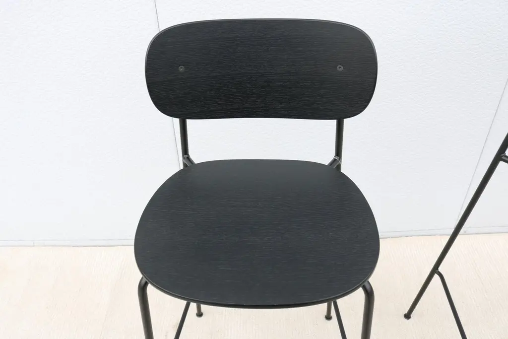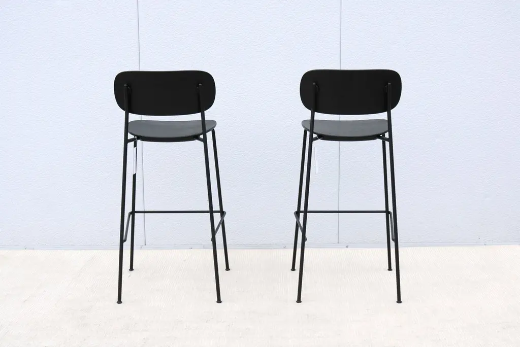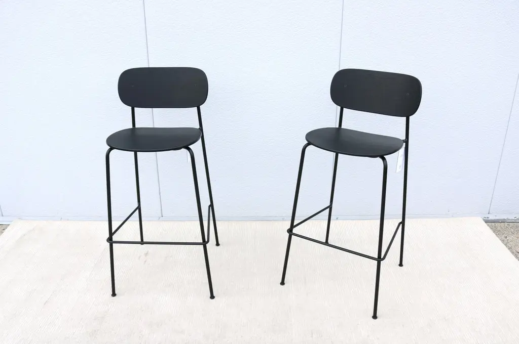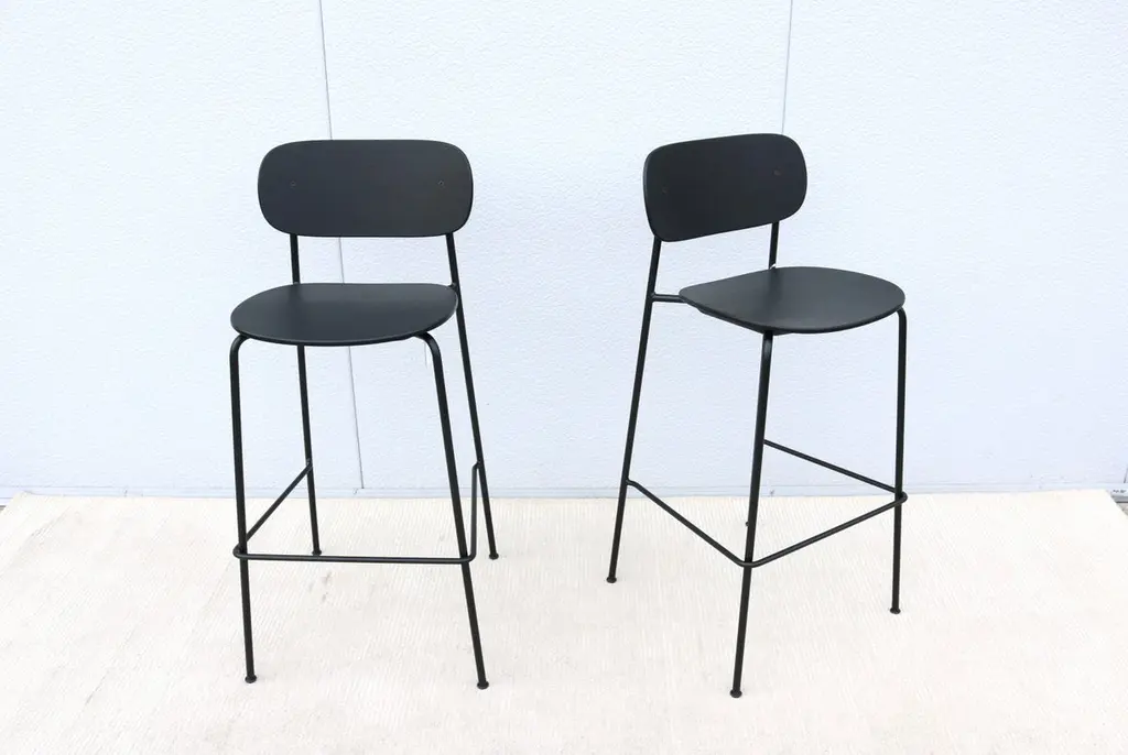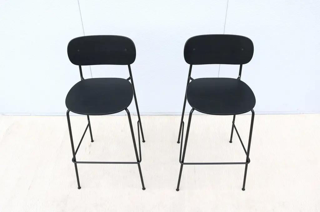 These elegant Co Bar height stools are comfortable and well-crafted.Distinguished by its wide back, generous seat and slender steel frame, creates an intriguing geometric silhouette.Designed in collaboration with Norm Architects and Els Van Hoorebeeck.It's stylish and functional and will integrate simply and cleanly with any space.Audo Copenhagen is a new design brand that was created by uniting two iconic Danish design companies, Menu and by Lassen.Please note I have 4 stools available, selling them in set of 2 (the price listed is for a pair, two stools)Specification:The seat and backrest are made from curved plywood, black oak veneer.The base is made of bent, welded black powder-coated steel tubes.Lightweight design and stackable.Self-leveling glidesStyle: Danish ModernModel: CO Bar ChairDesigned by Norm Architects & Els Van Hoorebeeck.Manufacturer: Audo Copenhagen, Menu.Year manufactured: 2023Made in: DenmarkAuthentic all the stools have the manufacturer labels attached beneath the seat.Dimensions: Height 41" x Width 20" x Depth 19.5" x Seat height 30" x Seat width 16.25" x Seat depth 15.75" x Footrest height 12.5" x Weight 14.5 lbs.Box dimensions: Height 46" x Width 25" x Depth 25.5" x Weight 36 lbs.Condition: These stools are brand new and come (2 stools in 1 box) fully assembled in the original manufacturer's packaging and box.I took them out of the box just to photograph and I put them back after (see the photos please)