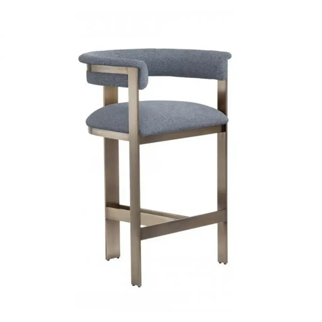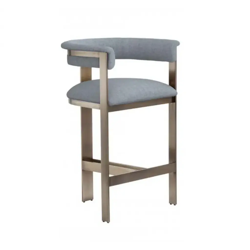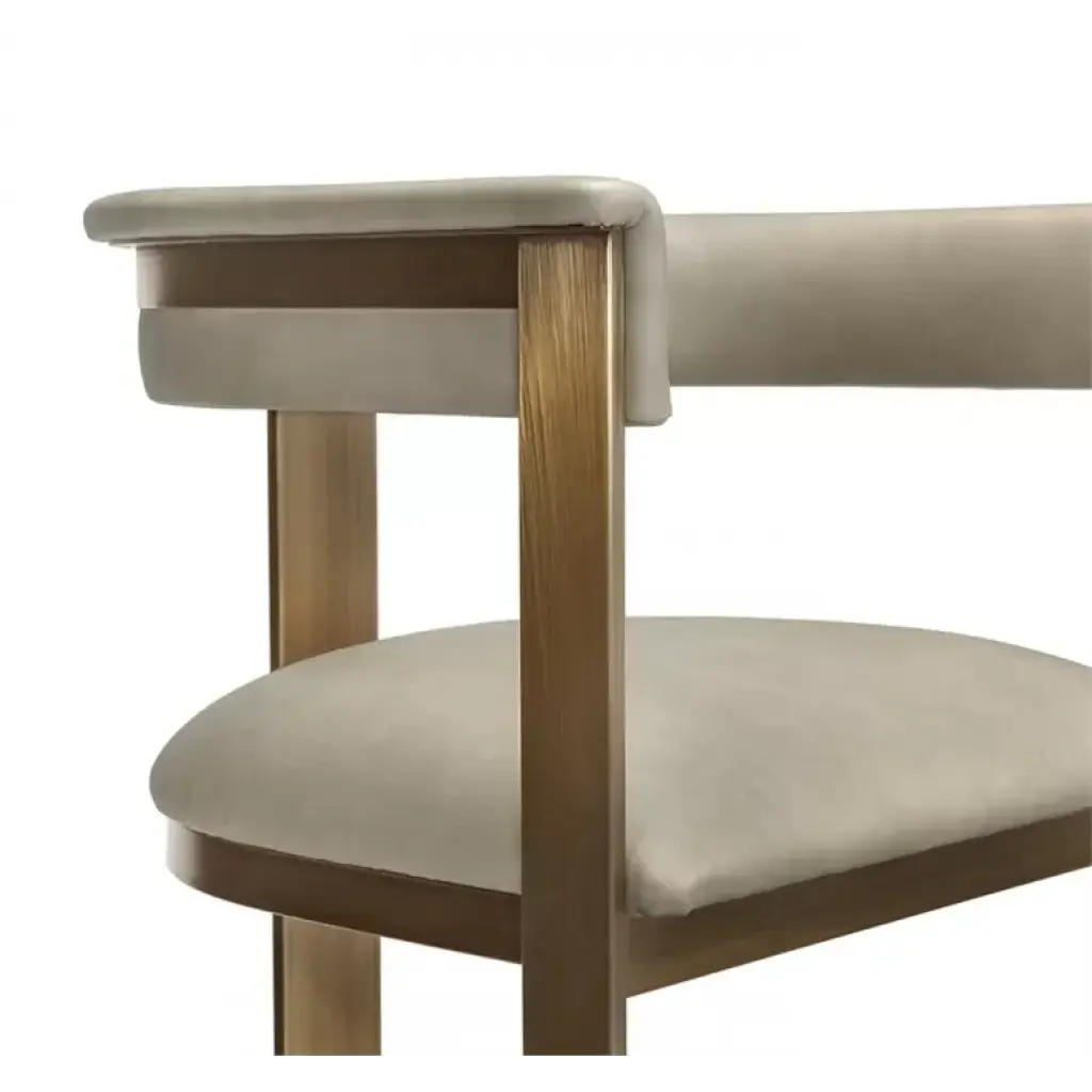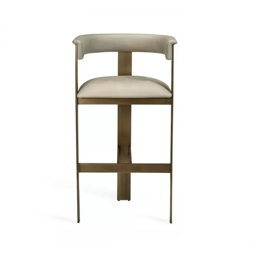 Boasting an art moderne influence, the Darcy Bar Stool features a taupe leather seat and a streamlined stainless steel frame in an antique bronze finish.